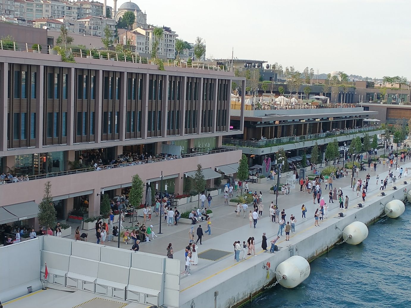 Alper had told us about a great brewery, The Populist, on the waterfront here in Galataport. We figure we have time, so we’ll pop in for a beer. Um. Yeah, right. This place is packed – well all of Galataport is – and The Populist? A line a mile long to get in. Yeah, we don’t wait in line in Asheville for beer, we’re not doing it here. So we reverse our course and head to the balcony all the while trying to figure out these interesting walls that separate the ship from the populace on the waterfront. They appear to be hydraulic, and when you take a closer look, you can see where they will lay flat. the side facing the water and the ships are all white, but the side facing the Galataport businesses, when raised are sort of brown with a circle design. You can see that same color and design all the way down the pier after the walls stop. Simon is right, this place is wild!