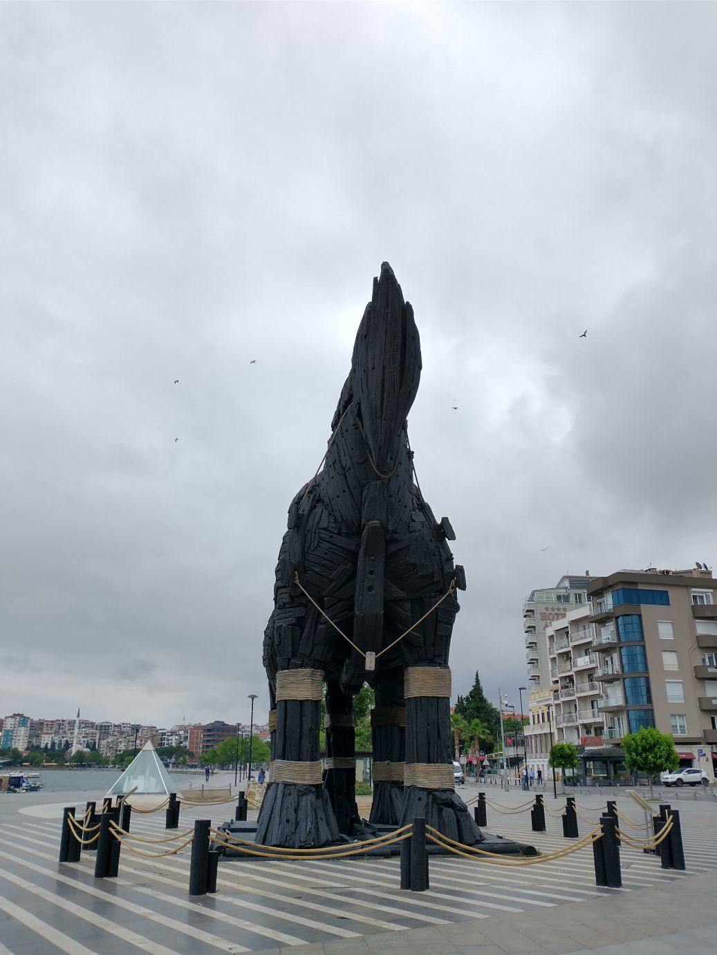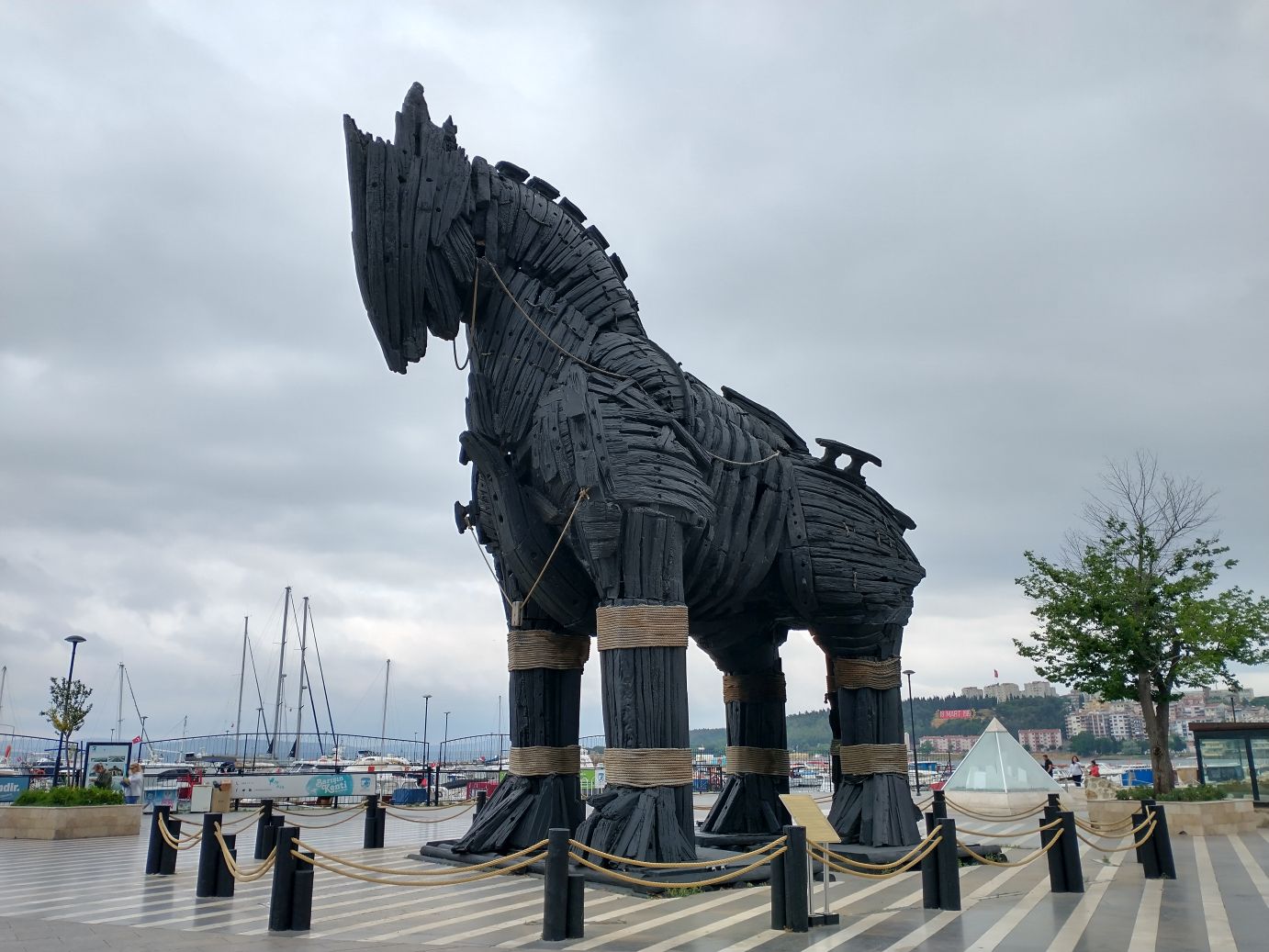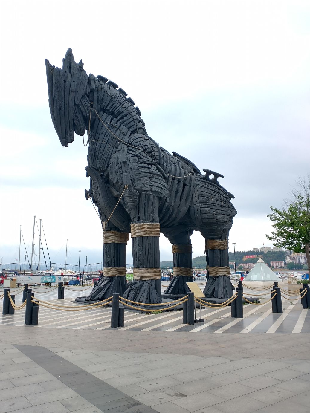 So, you know? Back to the shuttle we go – no sense staying here – and there is a whole ship at our disposal. Stopping briefly at McDonald’s for the restroom, and the obligatory coffee we must buy to access the restroom – but that only costs .26 USD cents – we decide we do have enough time before the shuttle to go see one last thing here in Canakkale – the Trojan Horse used in the 2004 movie Troy. This horse is a sight to behold – that is for certain! It is huge, all wood and stands very proudly on the seafront promenade. And if you weren’t familiar with the legend, there is also a very detailed and informative sign giving information on the horse and Troy.