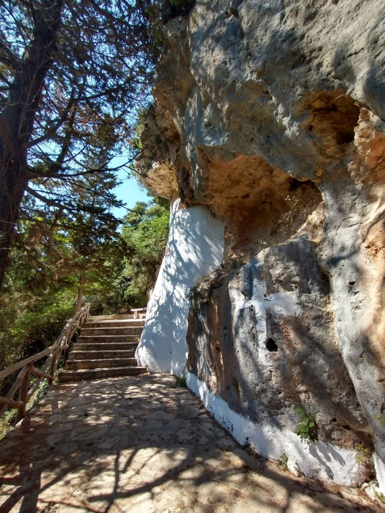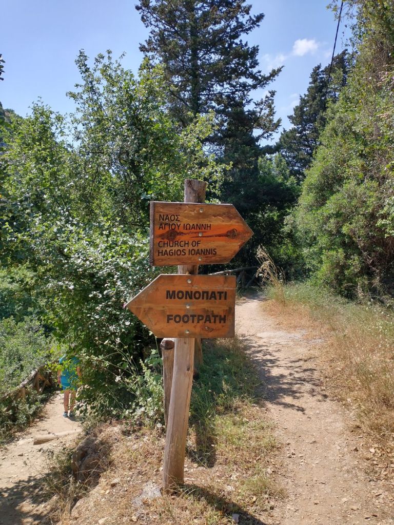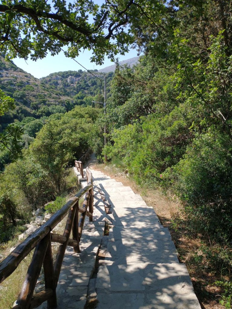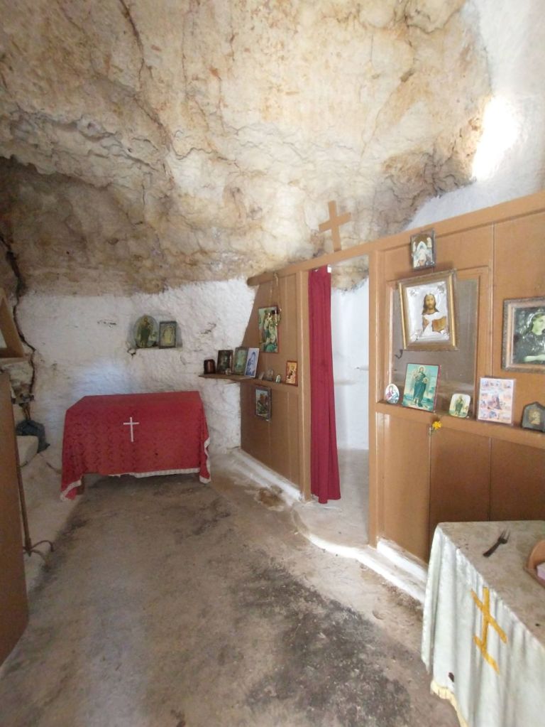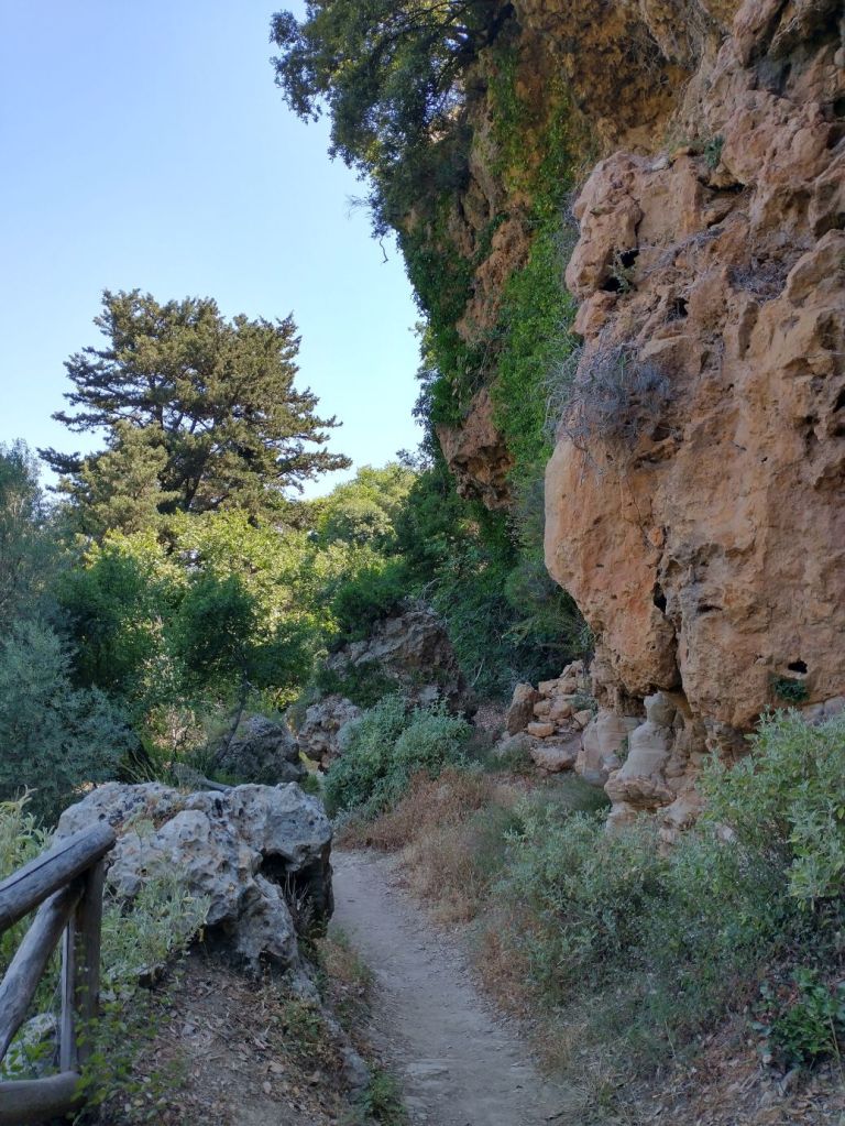 The drive is fairly simply, on a good highway along the coast and up into the mountains. One left turn, and we are winding our way along the gorge, finding the trail head and parking rather easily. The gorge and its trails are about 4 km long, of which we plan just a short little hike from the Pano Mili to Kato Mili. We begin at the staircase that takes us down to the floor of the gorge itself, stopping to visit the Agios Antonios chapel, which is built right into the rock face of the cliff, almost like a cave!