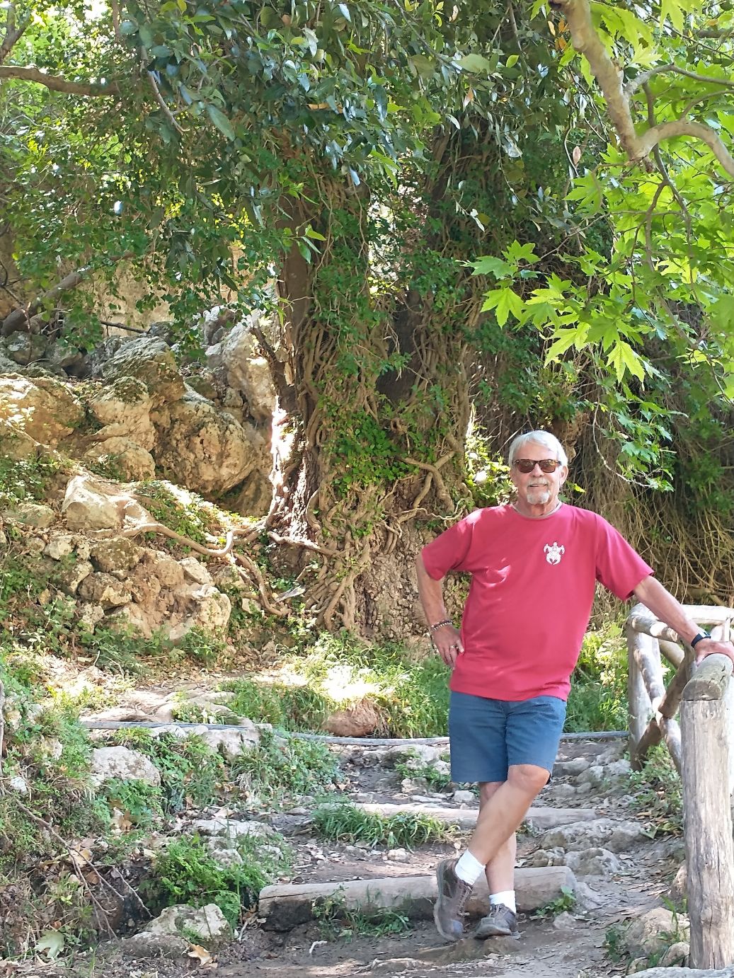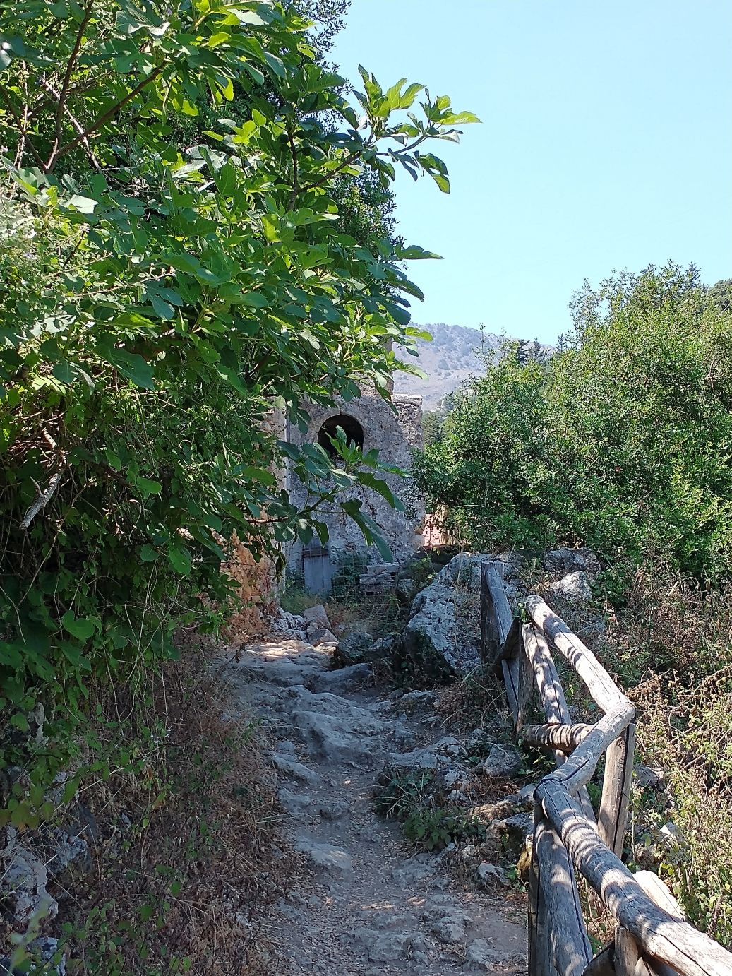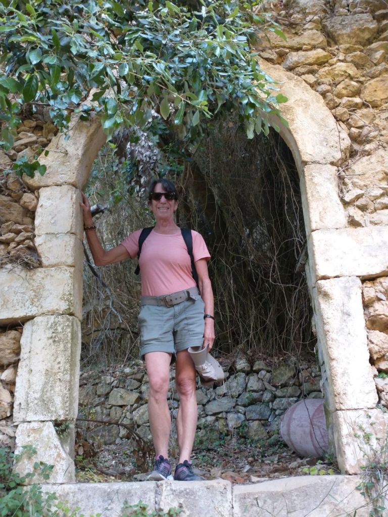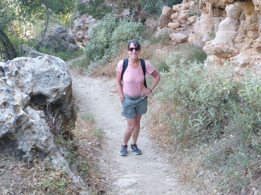 But soon the path starts a downward slope, and we decide we don’t want to have to hike back up, however far that might be, so we turn around and head back toward the car. Another reason to retreat is that the HoHo bus from Rethymnon stops here and it has been disgorging tons of people during our entire time here. These paths won’t handle that many people, so, yeah, it’s getting way too Peopley for us – thus – retreat.