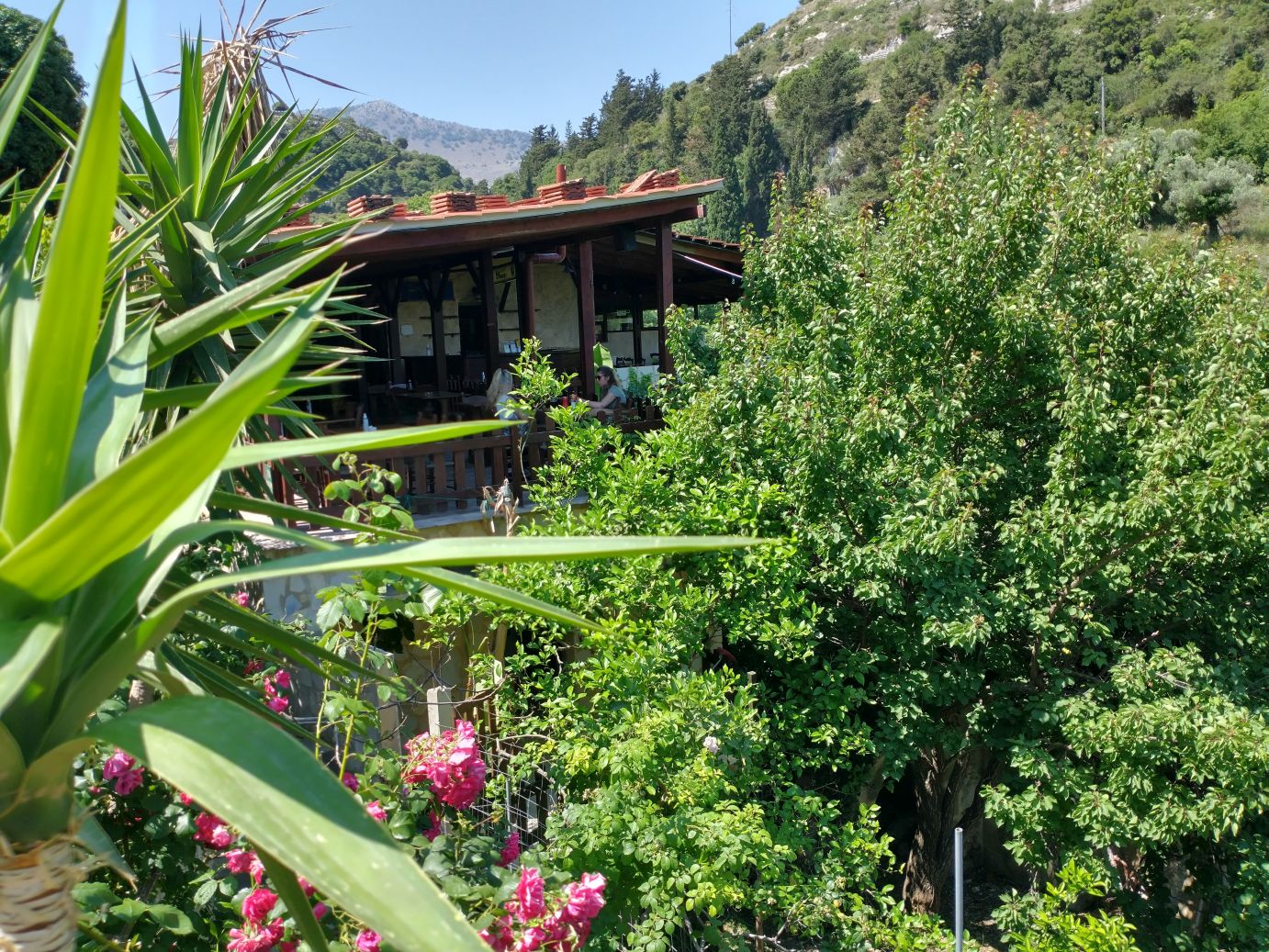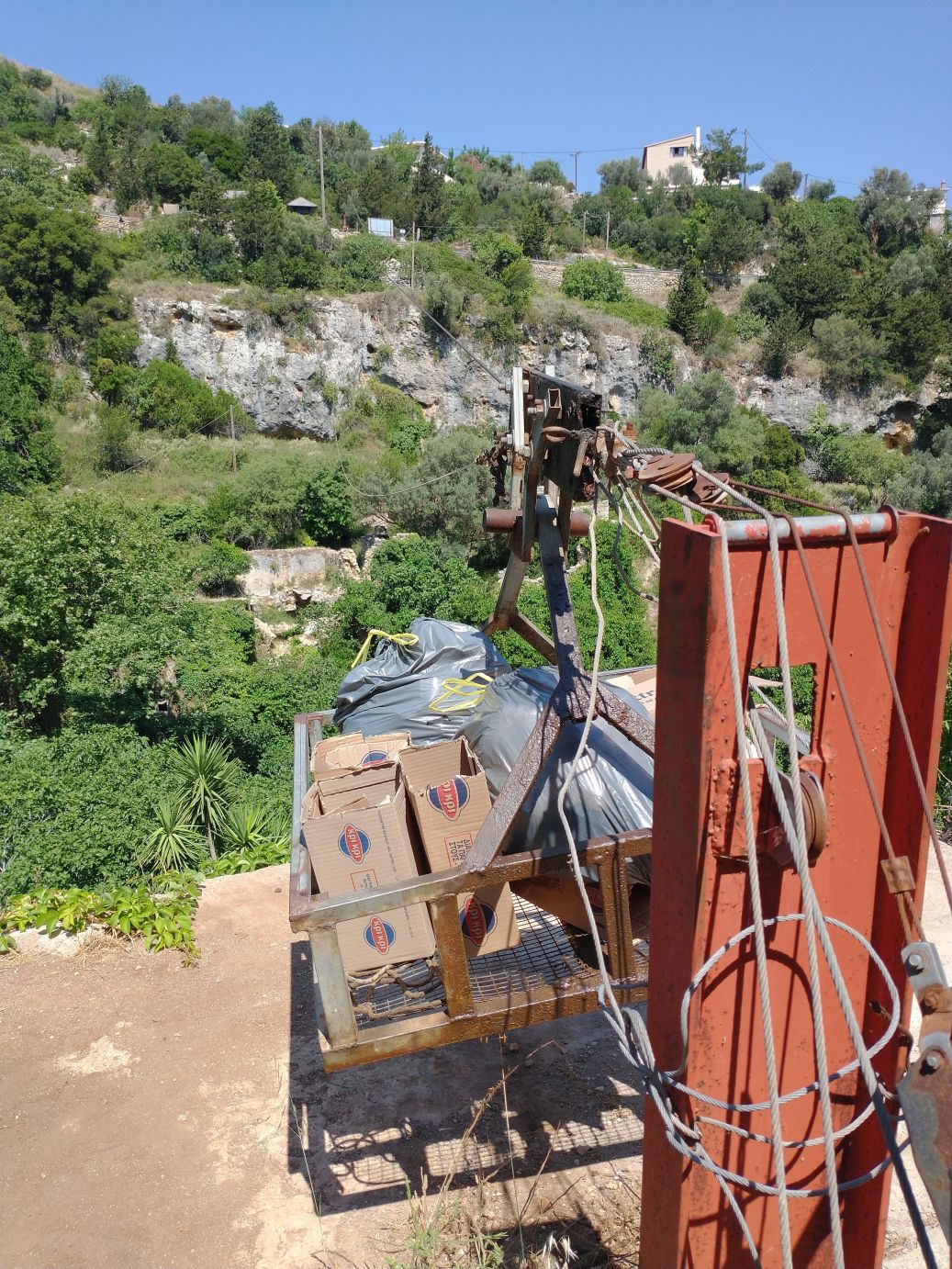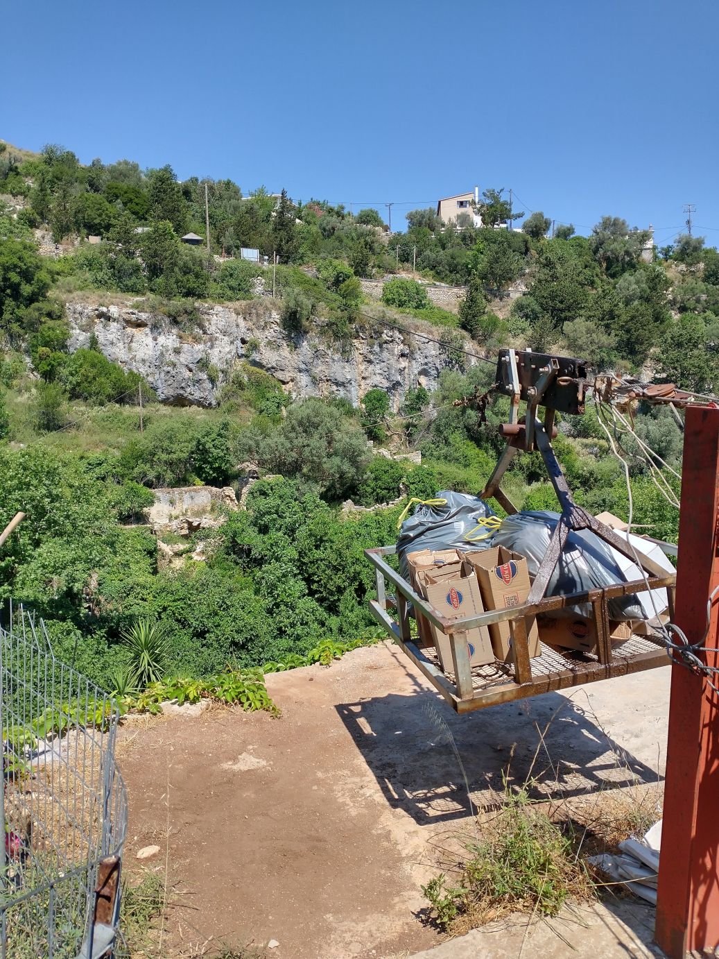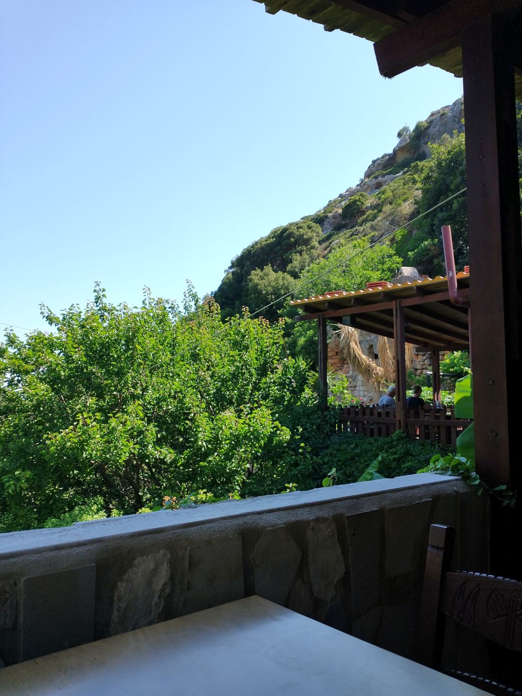 The views are great. The paths narrow and full of surprises at every turn. Oh – and did I mention the Taverna? Yep – here on this dilapidated old dirt trail, across the gorge, there is of course a Taverna. We are no longer surprised at finding any cafe or Taverna in out of the way mountainous spots! So of course we must stop for a quick cappuccino – and bathroom. It is a lovely spot with shaded terraces overlooking the gorge – and the most amazing thing? The only way to get supplies in and out is by a zip line! Seriously. Talk about dedication to a business!