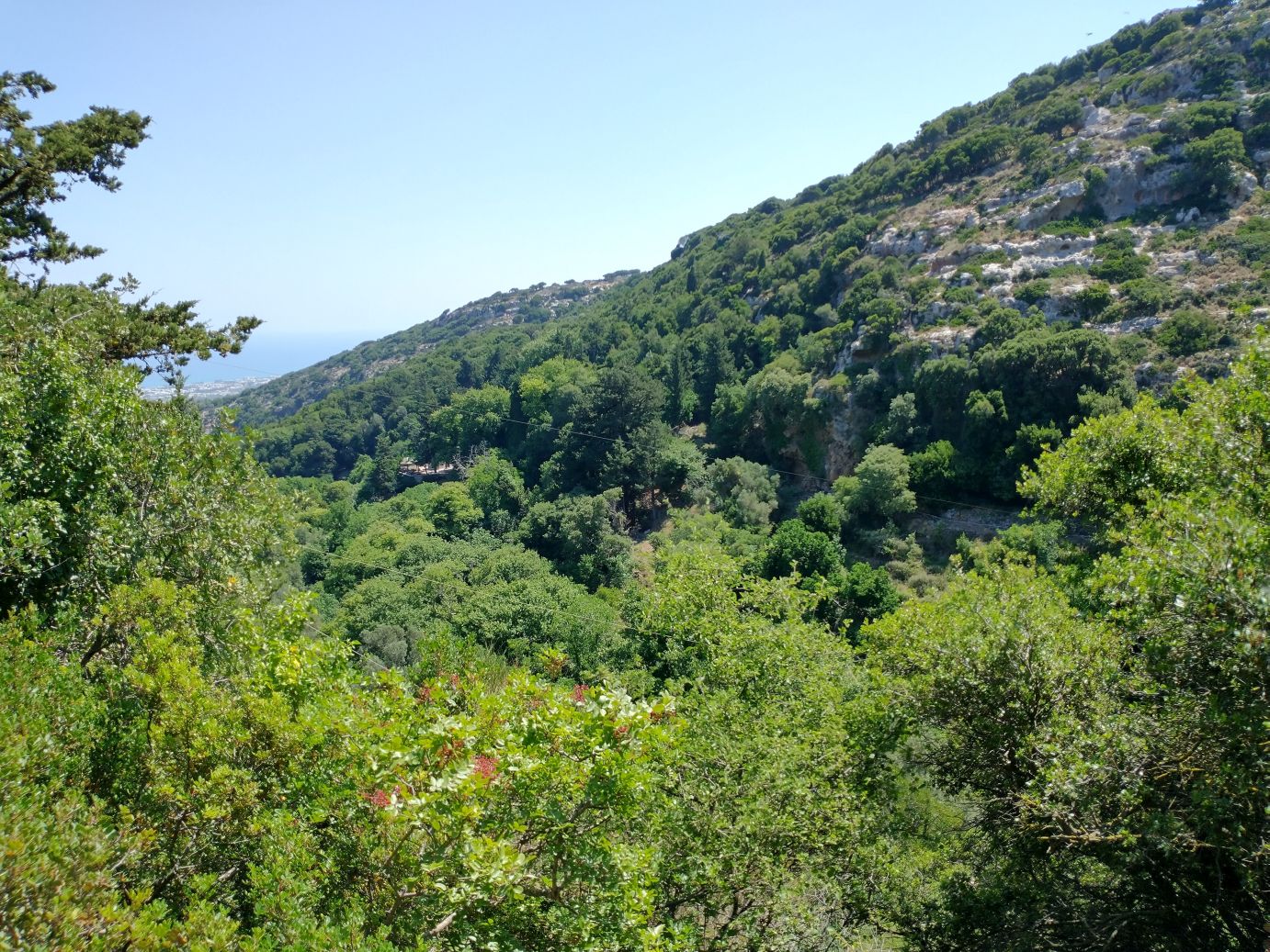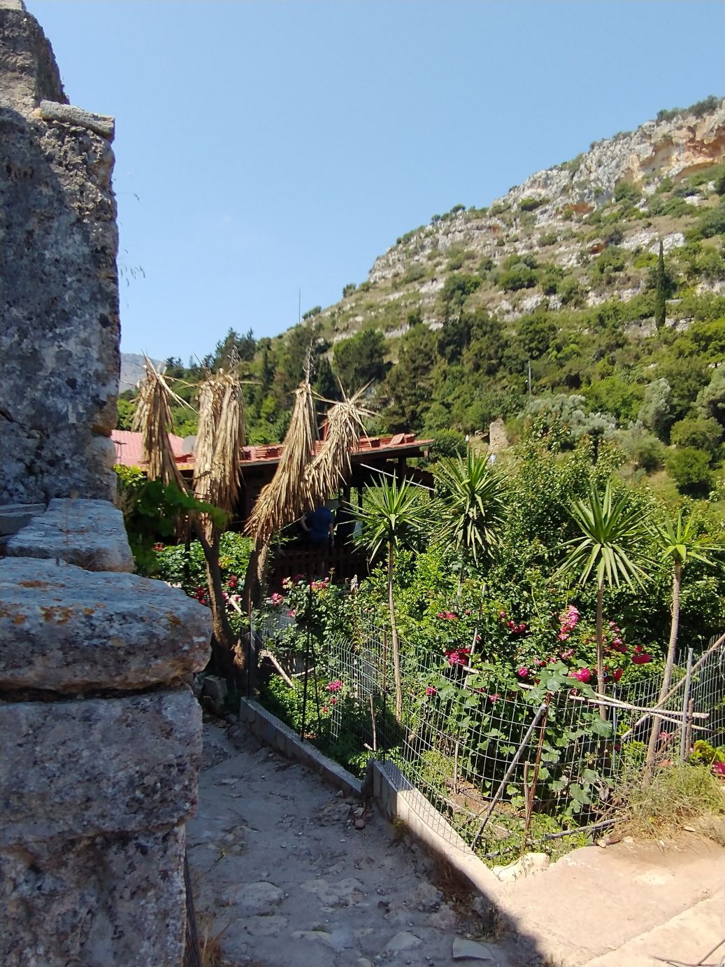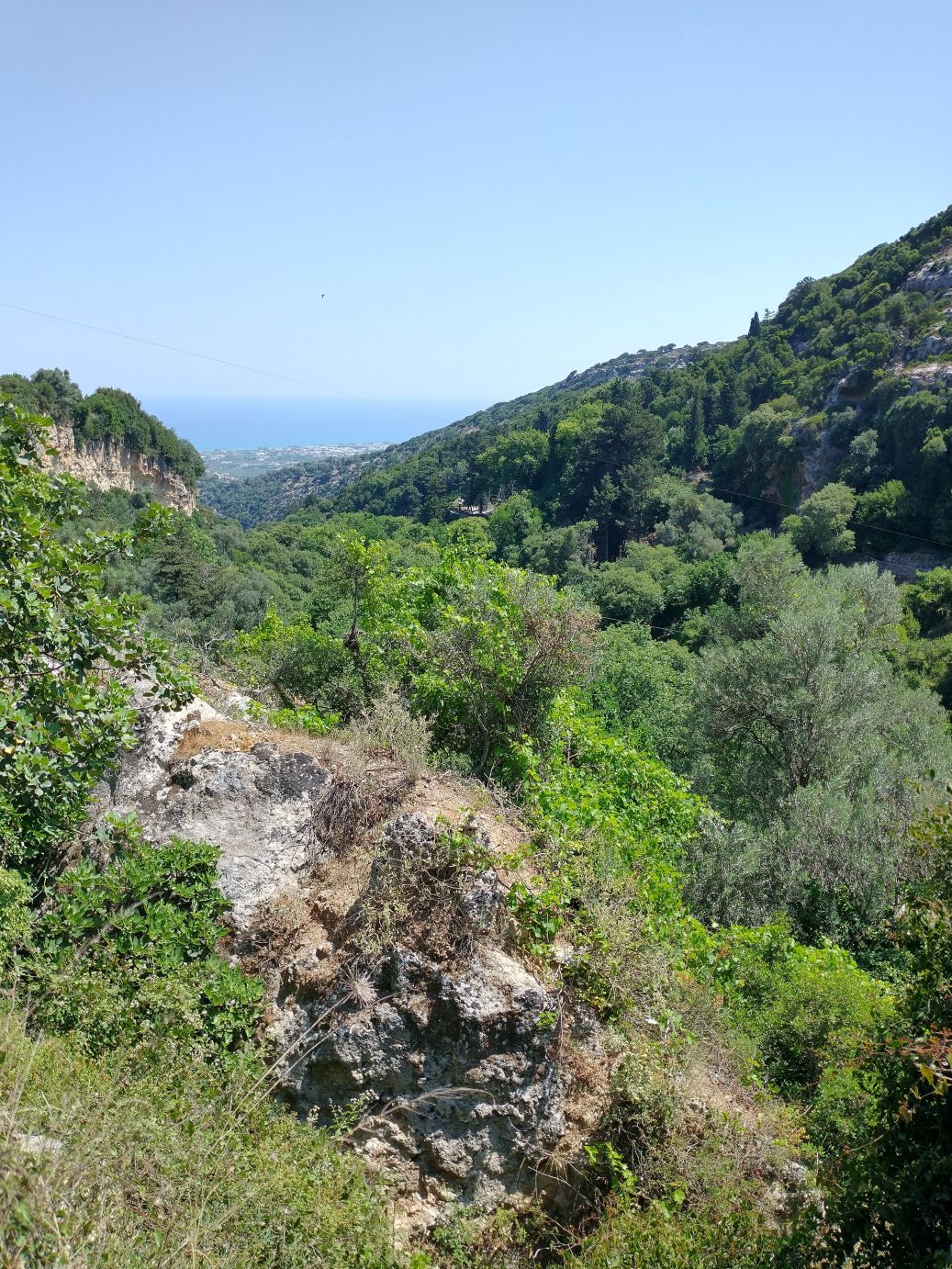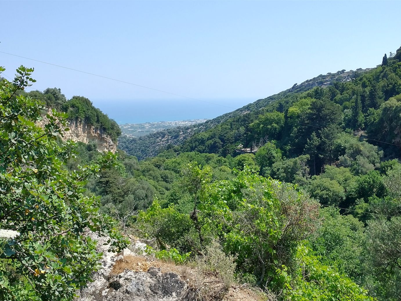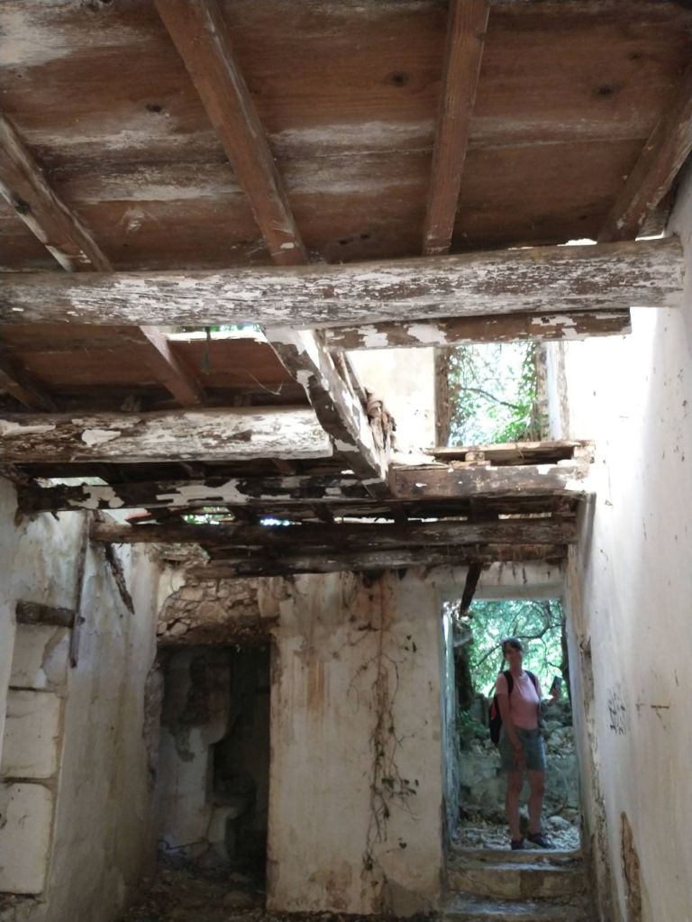 The views are great. The paths narrow and full of surprises at every turn. Oh – and did I mention the Taverna? Yep – here on this dilapidated old dirt trail, across the gorge, there is of course a Taverna. We are no longer surprised at finding any cafe or Taverna in out of the way mountainous spots! So of course we must stop for a quick cappuccino – and bathroom. It is a lovely spot with shaded terraces overlooking the gorge – and the most amazing thing? The only way to get supplies in and out is by a zip line! Seriously. Talk about dedication to a business!