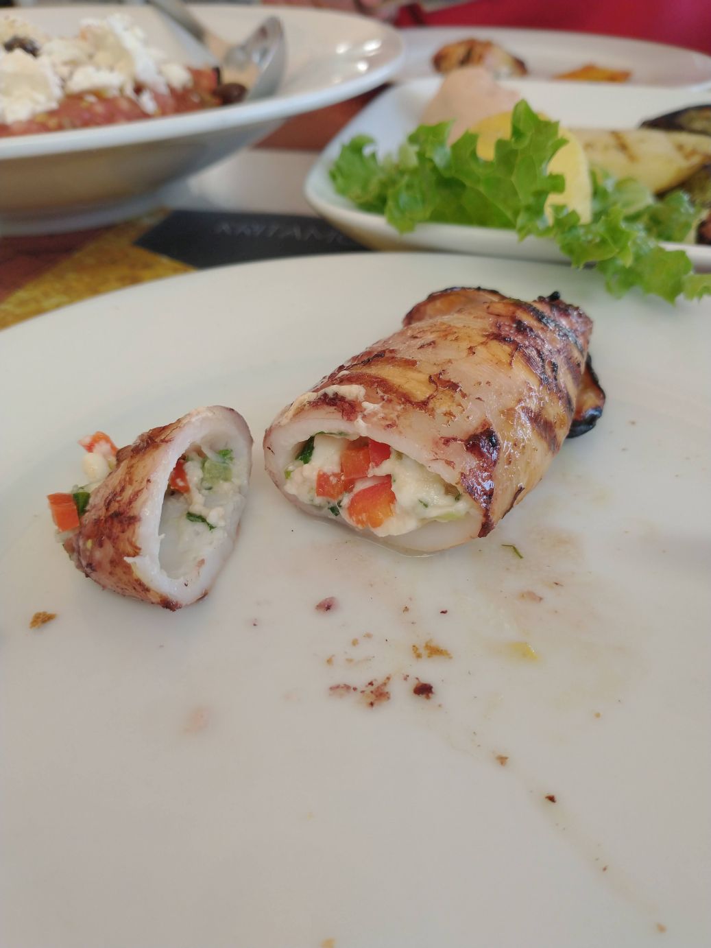 It turns out to be a good decision. Fresh seafood, straight from the seafood market right across the lane (at least that’s what the hawker guy tells us when he reels us in) and lots of choices. We shared a plate of Dakos – “Village” bread with tomatoes, feta and olive oil, which is not at all what we expected, with far more tomatoes on top, but altogether excellent. Next we had stuffed squid, which was delicious, along with fried cheese – very filling and all very good.