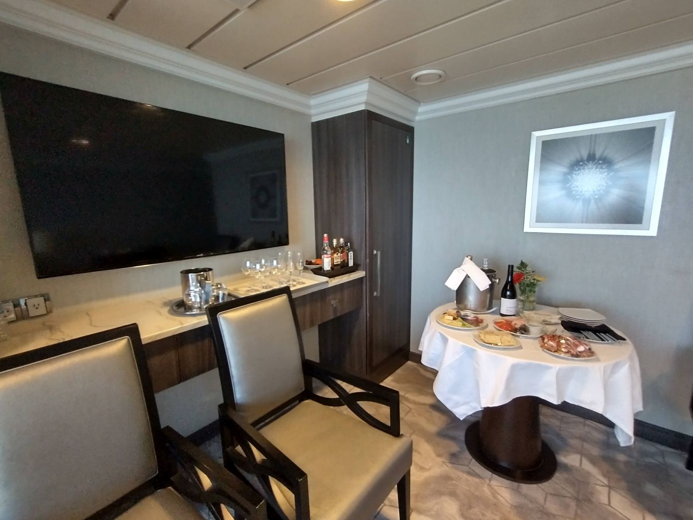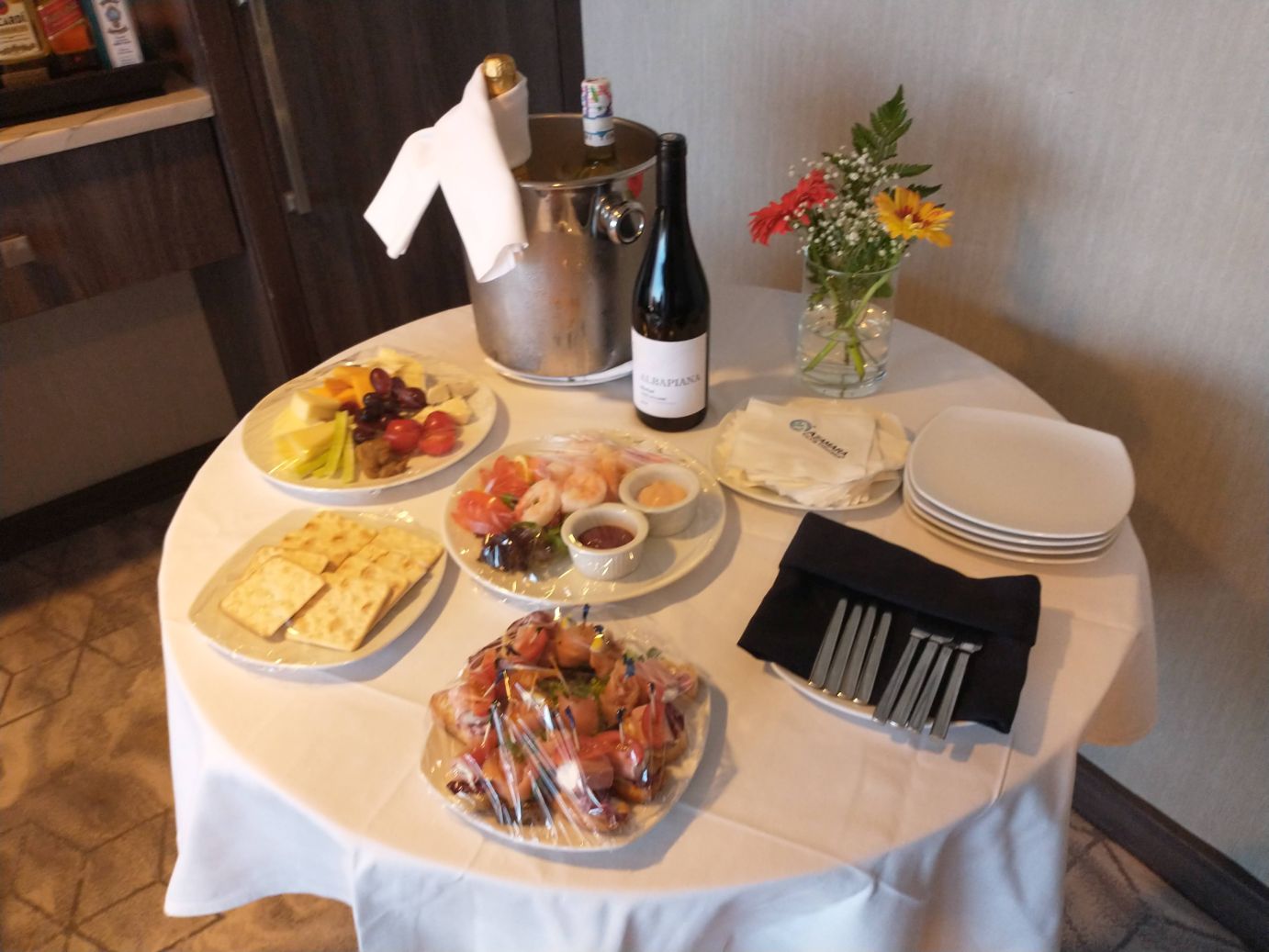 The rest of the afternoon was lovely. We invited our pals Rosanna and Peter over to the cabin for snacks and drinks, and what a spread Angelo put on for us! It was lovely and we had a fabulous time hanging out on the balcony, sitting in the afternoon sun, drinking, eating and chatting as we sailed away from Heraklion.