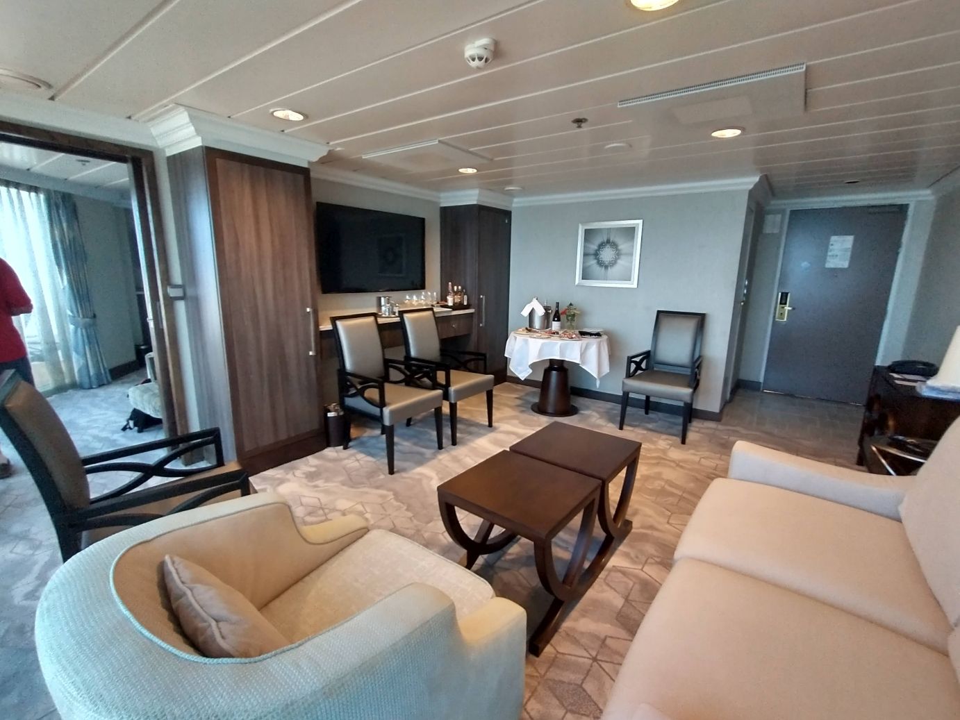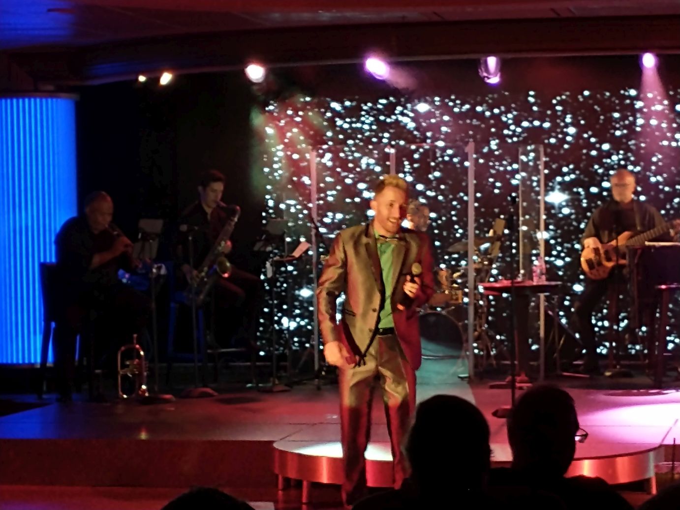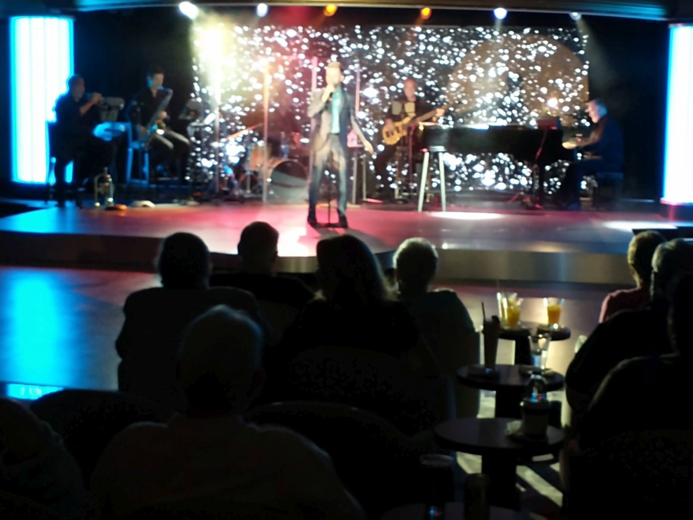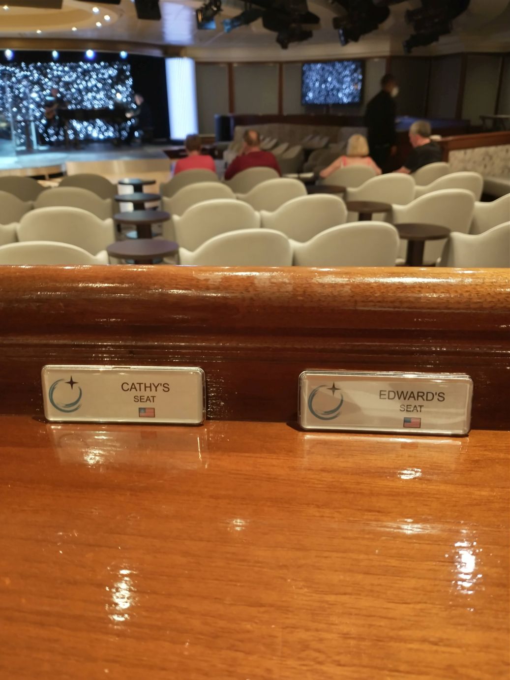After that dinner was just a light snack (salad, of course!) then onto the Cabaret for the show, where of course we were met by Simon, who tonight has the dancers sitting in our seats to reserve them until we arrive. Everyone is complicit!!! Tonight, though, we are officially handed our name plaques, because none of us will be at the show tomorrow night (violinist, we’re not interested; Simon has port and turnaround duties). So sweet and so perfect.