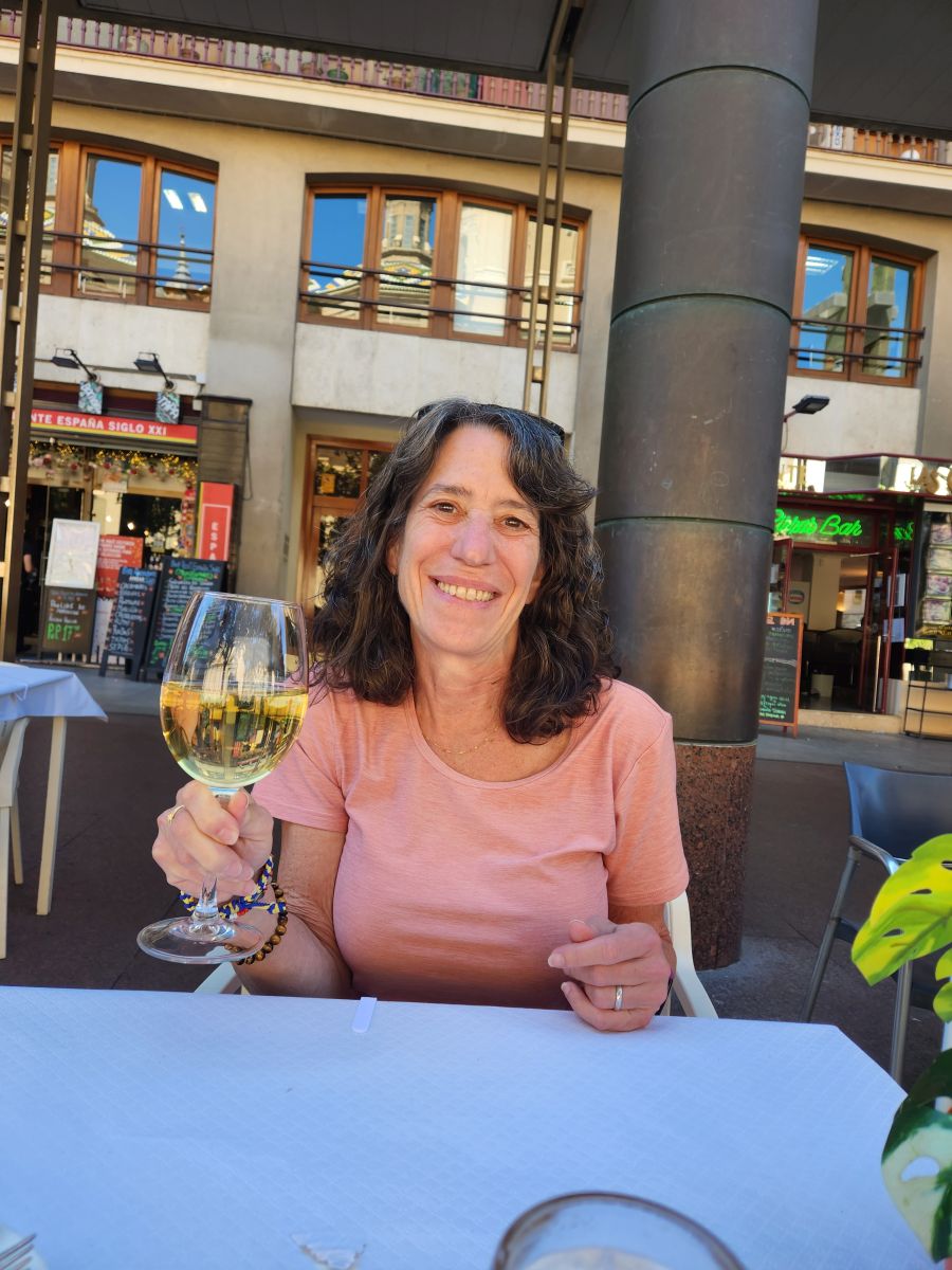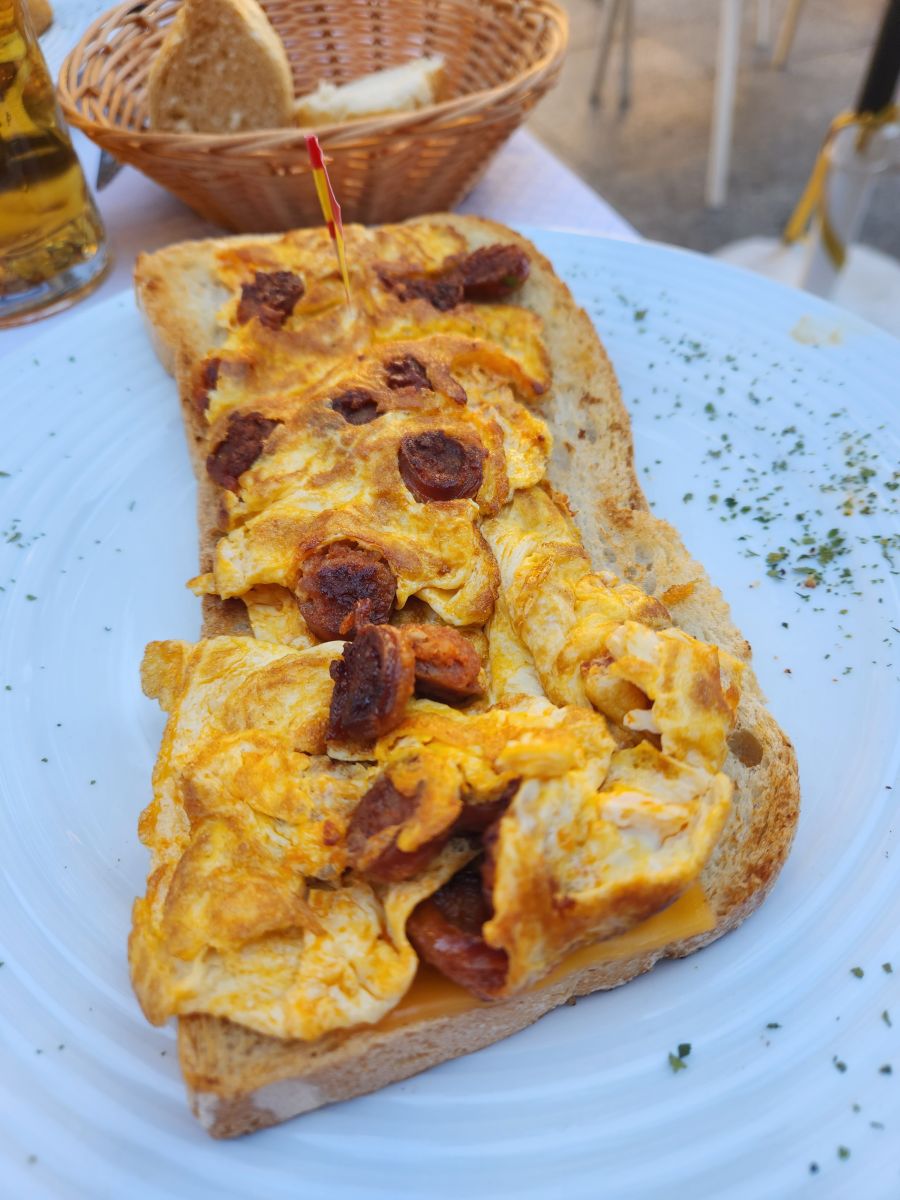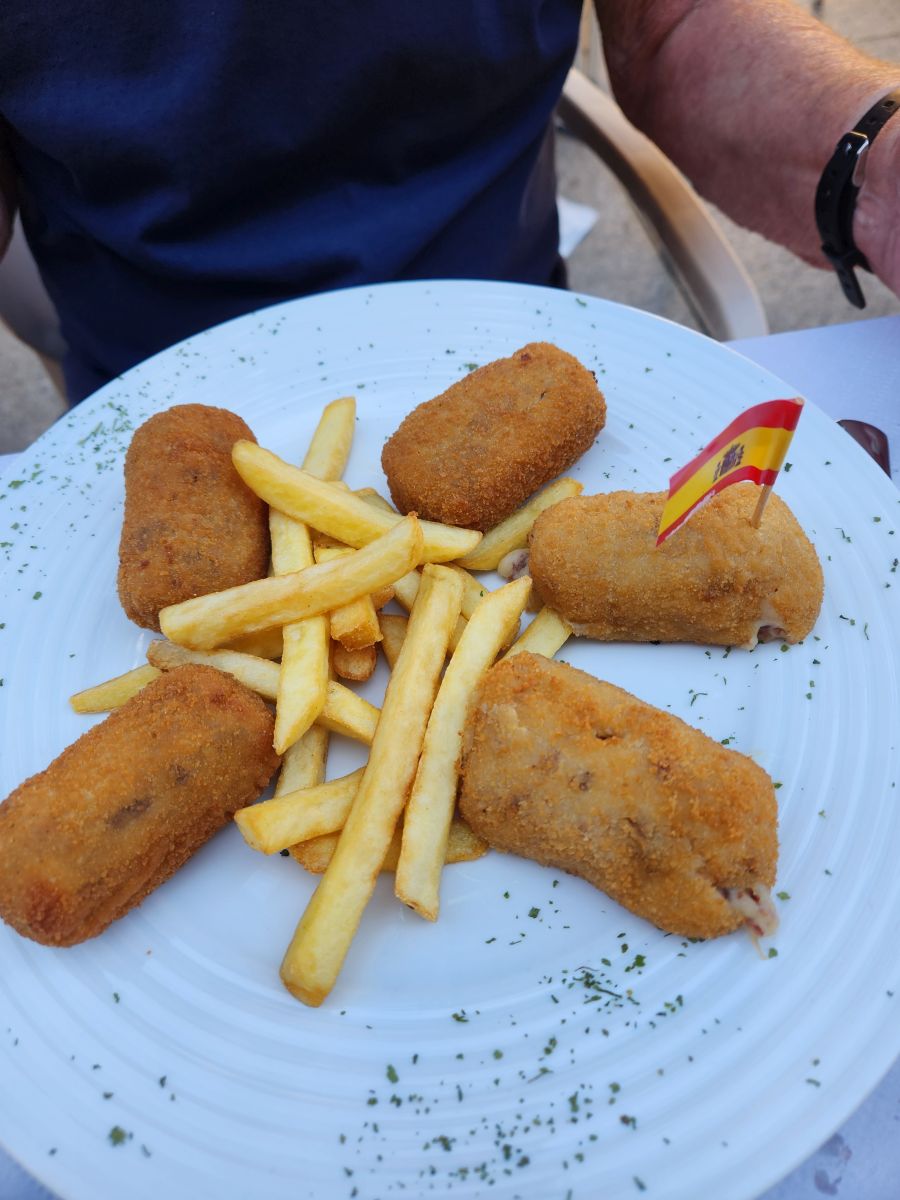 Ok – deep breath. Now time for lunch. Instead of wandering out by the main road, we just plopped down at a place right on the plaza across from the cathedral; Restaurante Espana Siglo XXI. All local products, and we splurged on a very expensive plate of local pink tomatoes that were excellent, if not really worth the price. But the rest of the meal was quite reasonable and great – Croquettas jamon and Bocadillo de tortilla – scrambled eggs with chistorro on a crusty roll. Oh, so very good. And the biggest pour of wine in a huge wine glass! Yep. I’m set for the afternoon.