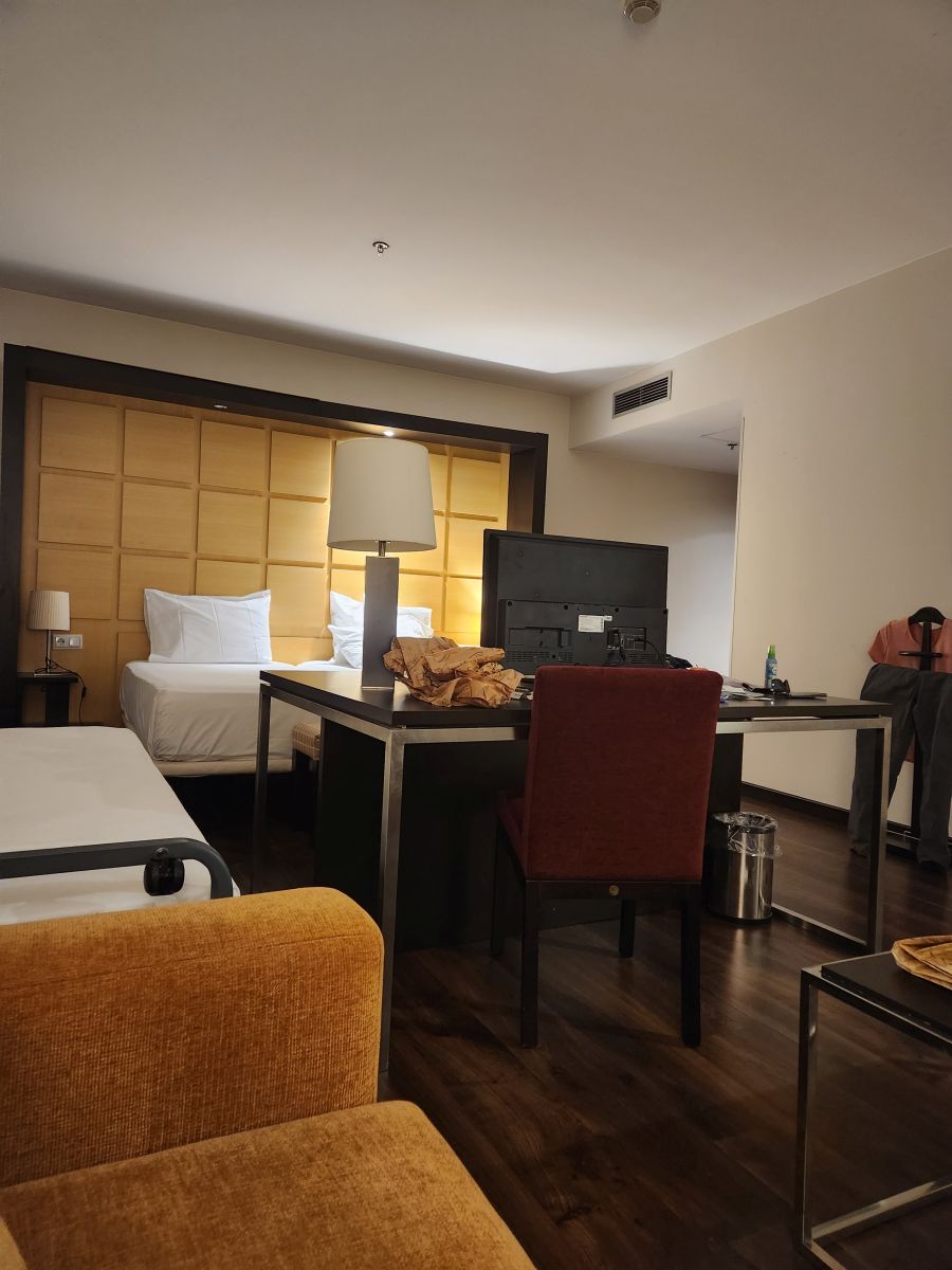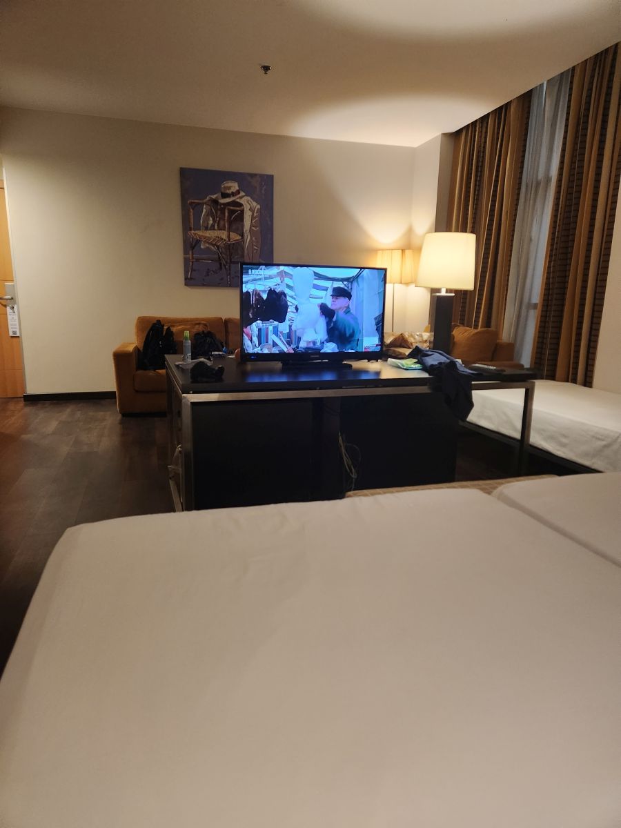 Then we shop at Lidl, picking up snacks for dinner. We figure there is no sense going out – we’re at the train station, a good distance from any restaurant and really, we’re still full, so snacks work fine. One baguette, some chorizo and stuffed peppers later, and we are back to the hotel, checking in and hiking down to our room – which turns out to be this monstrous huge thing with an extra bed, a whole sitting area and a lobby like vestibule at the door. Wow! Perfect place to hang out and snack throughout the evening. Which is what we do.