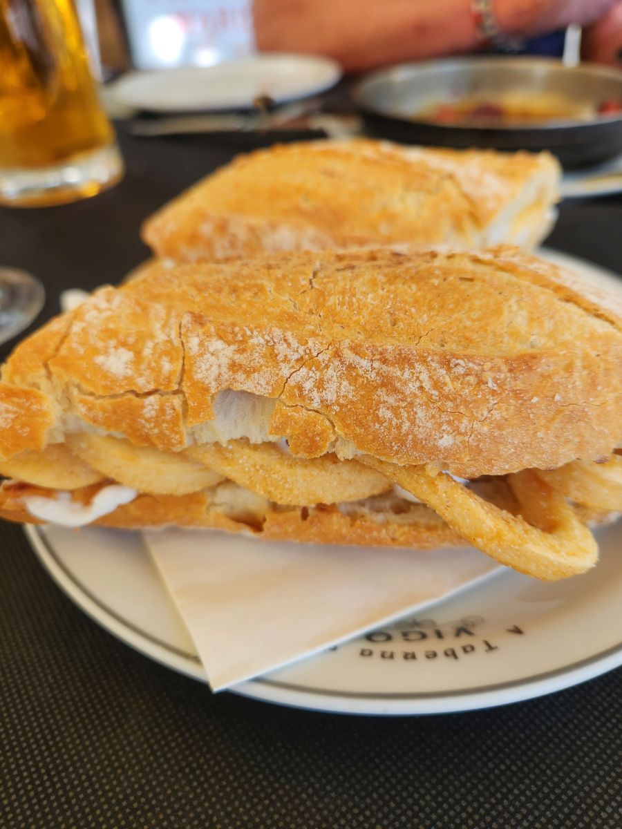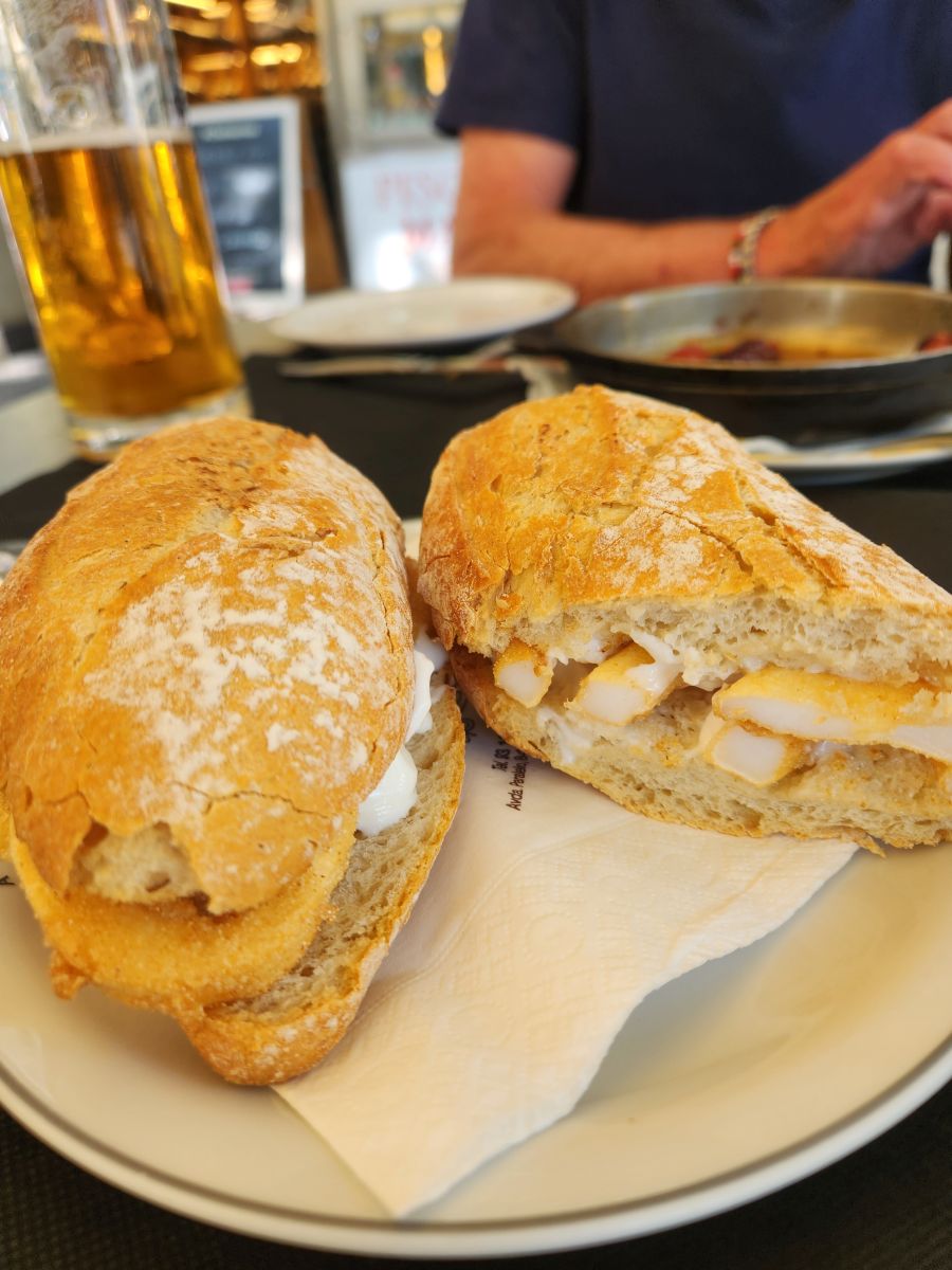 We quickly stash our bags and head out into Barcelona. First stop, lunch. We wander up Parel’el and plop down at the first Café we hit; A Taberna de Vigo. Perfect. We have a sweet waiter from the Philippines (didn’t ask, but for certain, the accent, the pronunciations) and proceeded to dig into a sizzling plate of Chistorra en vino and a Fried calamari bocadillo. Yum. Perfect snack for our afternoon wanderings.