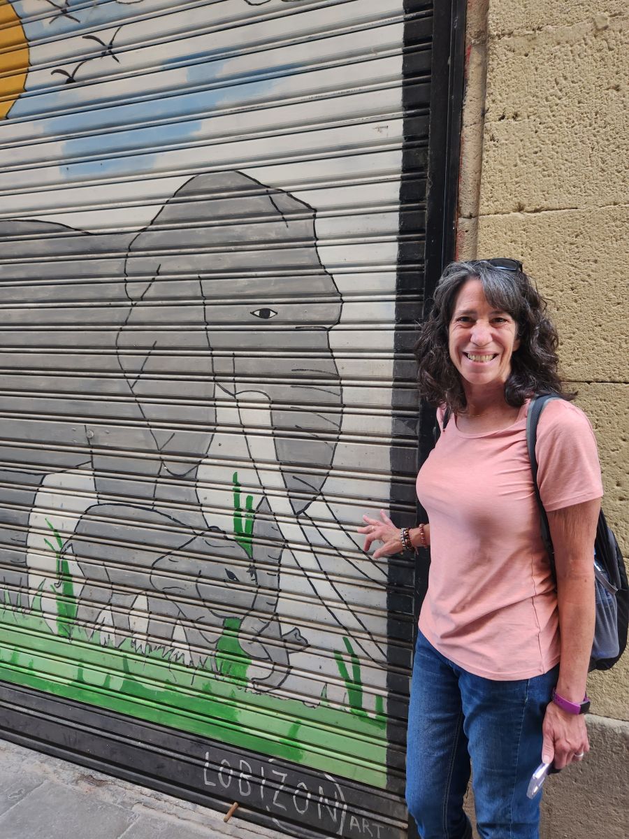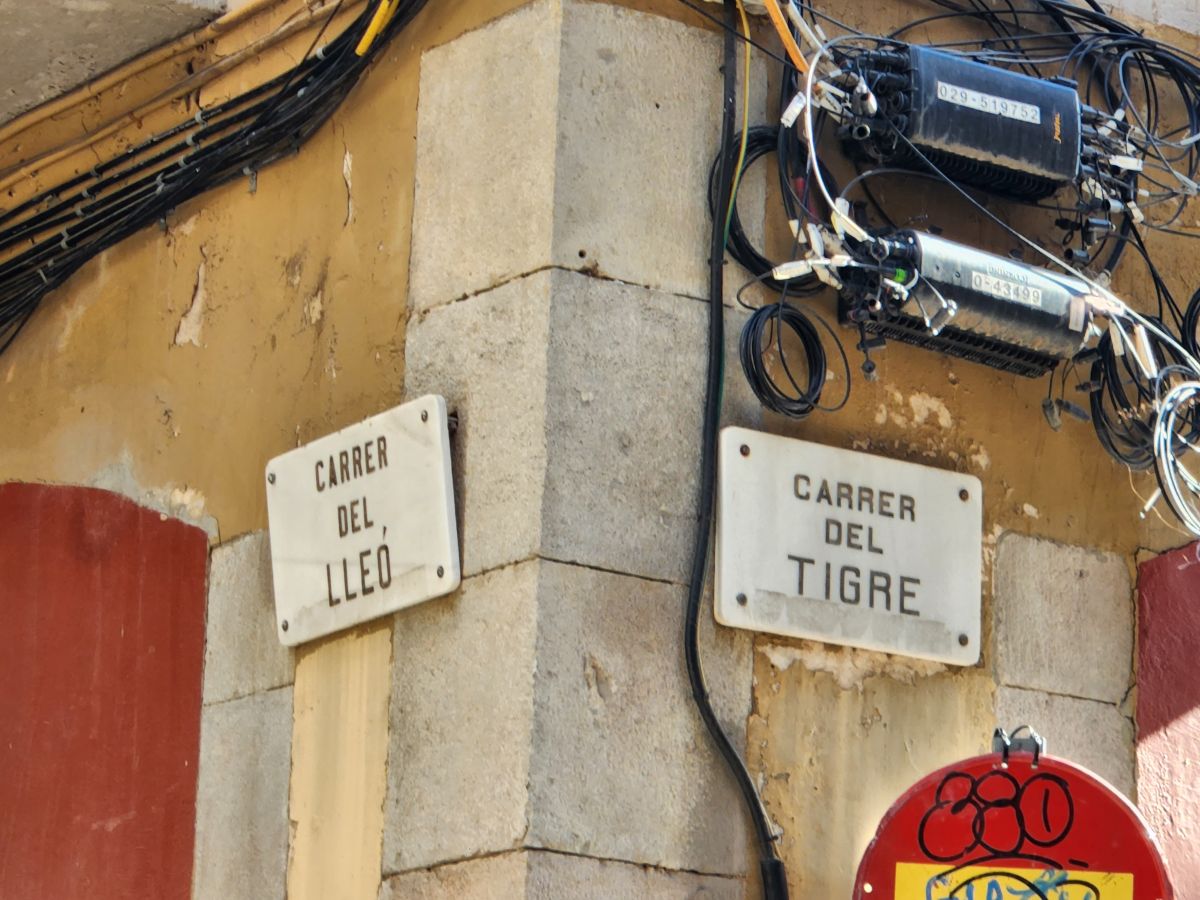 Next up, we hit Lidl for wine, beer and snacks, checking out all restaurants in the Poble Sec area on the way. After taking our provisions back to the hotel we strike out into Raval and up to Moritz Brewery – where we send a picture to Felix Meana (Button Restaurants) who saw Ed wearing his Moritz shirt at an event and wanted to know where he got it. Barcelona of course! After a beer and wine there, and a slightly disappointing gift shop (nothing interesting), we wander down to La Rambla, walking through narrow little cobblestone streets with typical Spanish city architecture, and an animal theme – the corner of Tigre and Lleo, plus a great elephant mural.