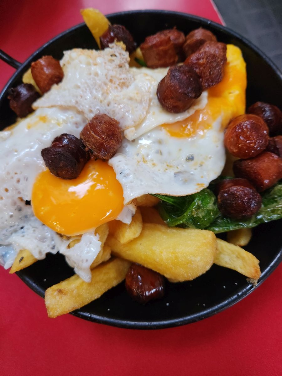 It is a beautiful day, and a nice walk back to the hotel where we hang out, freshening up, before heading out to find some dinner. We had spied a corner restaurant called Can Eusebio that seemed like it had a good tapas menus, and were lucky enough to find a table on the outside patio. Croquettas, Fried Calamari and this fried egg and chistorra dish served atop a mound of French fries fed us well. Oh and the beer…grande really meant grande! Holy cow – it took me 2 hands to just take a sip. Needless to say, it was a bit of an overkill – but what can we say? Didn’t come close to the wine pour – but that’s ok, there’s plenty more back at the hotel for me!