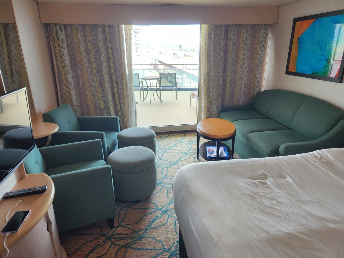 Our cabin is awesome – aft balcony that is huge and mostly covered so we are protected from the rain. The cabin itself is really large, nice big bathroom with tub and a great seating area with two really comfy chairs along with a sofa. Oh, we’ll be so spoiled at the end of this short 8-day cruise!