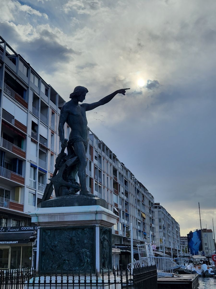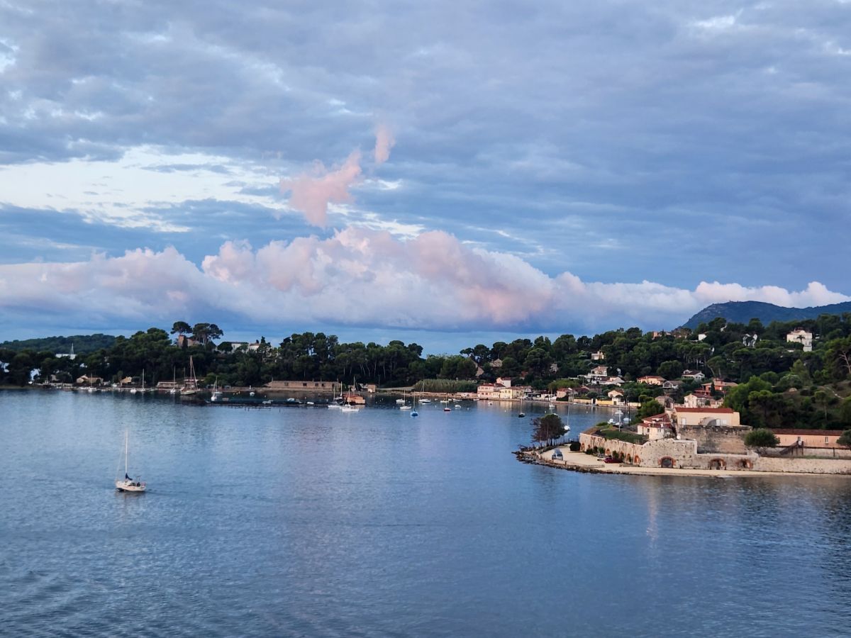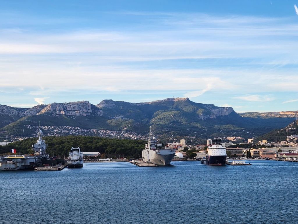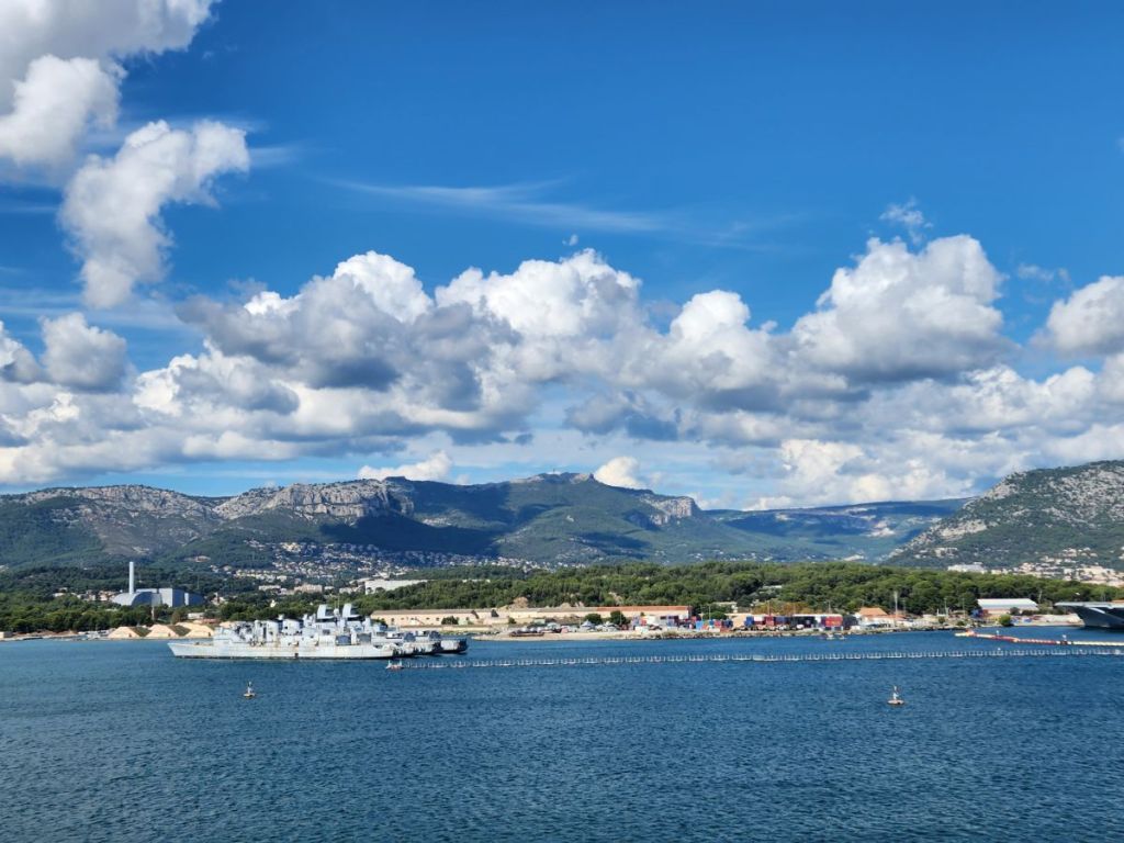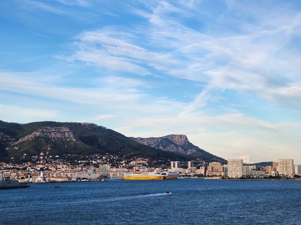 There is a gorgeous sunrise as we are sailing into to La Seyne sur Mer, the cruise port across the water from Toulon. Once again, we’re right on time, and we are up and off the ship quickly on a search for the public shuttle boat that will take us to Toulon. We don’t really have much information on the boat, we know it is the 8M route and costs 2 euros each way, but where and when it docks, we’re not really sure. The ship gives out decent information on local shuttles though and their little port guide says it’s a 10-minute walk, located near the casino. Ok – we’re game. Off we go.