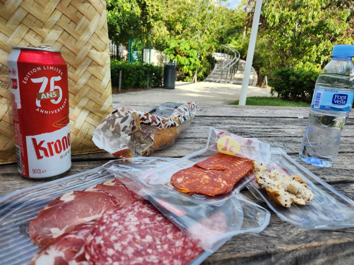Bread, charcuterie, beer, water and wine for me to put into the bladder to take back aboard – perfect! We carry our haul over to the park next to the museum to find a place to eat. There are stone benches and seats, but also found a bunch of picnic benches. We started testing out different picnic benches to see which one’s were the driest, and the park maintenance guy saw us and gave us one of the huge plastic trash bags he had to put on the bench! So sweet! (And yes, I saved the bag for later use – you never know when it will come in handy!)