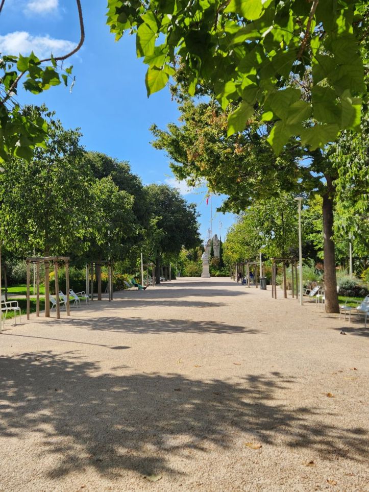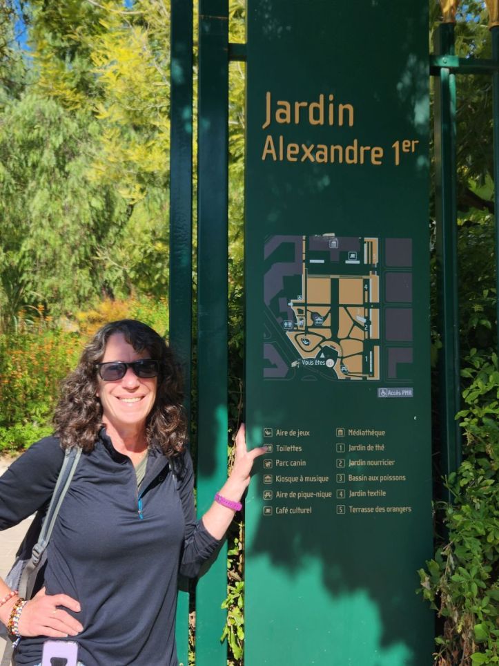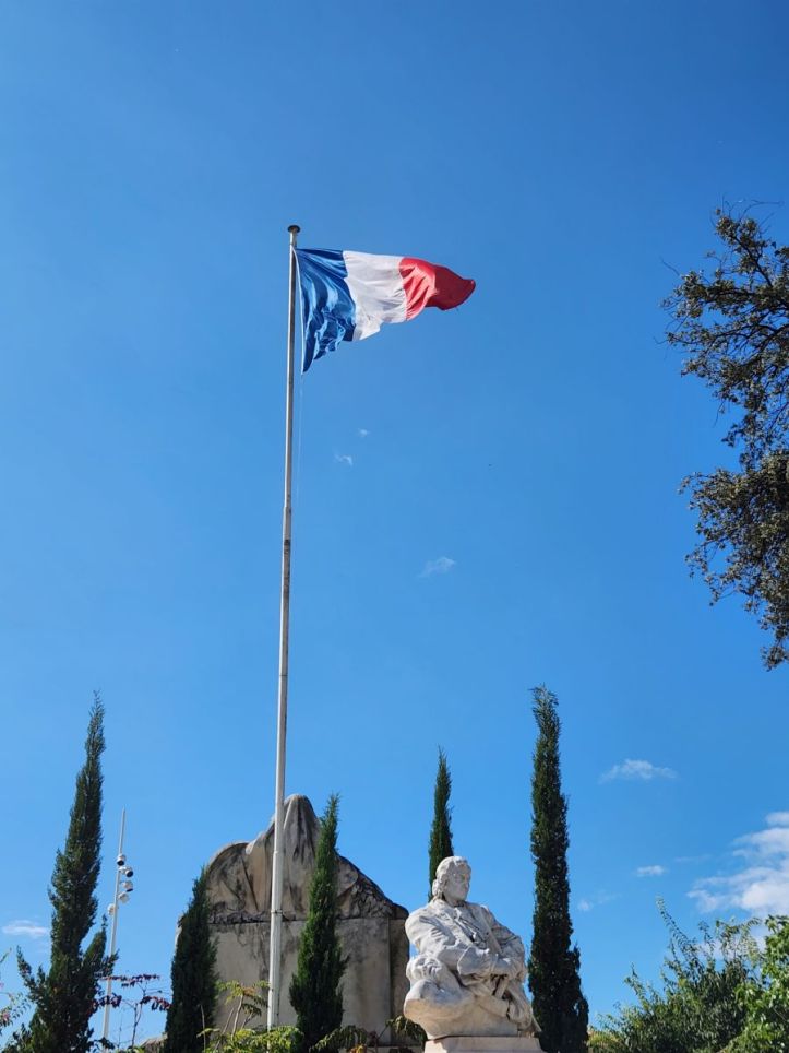 Picnic complete, wine in bladder, we still have time to burn, so we walk through the park, which is aptly named Jardin Alexandre the 1st. It’s a beautiful little park with terraces and seating areas, lovely statues, and a beautiful building called the Mediatheque Chalucet – some sort of a library that of course – is not open. Out front in the circular parking area leading to the garden is a huge monument to the people who lost their lives fighting for France in WWI and WWII. All in all, a very enjoyable way to waste an hour in this gorgeous weather.