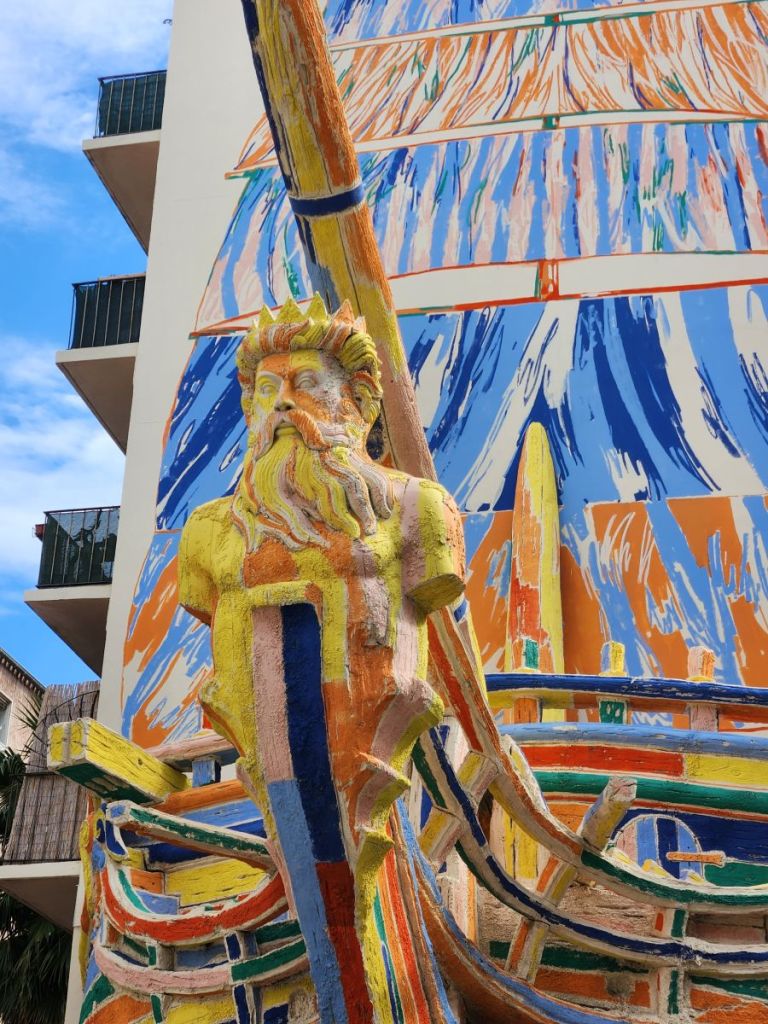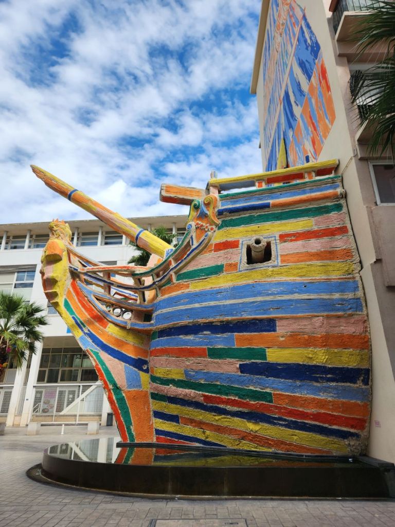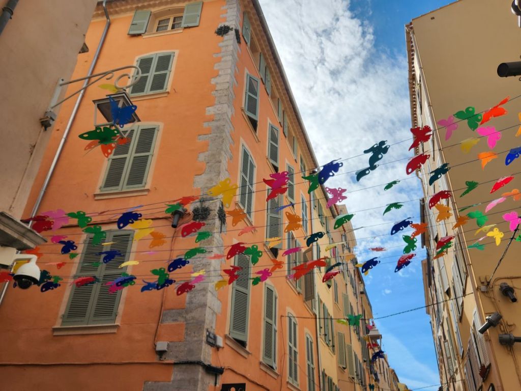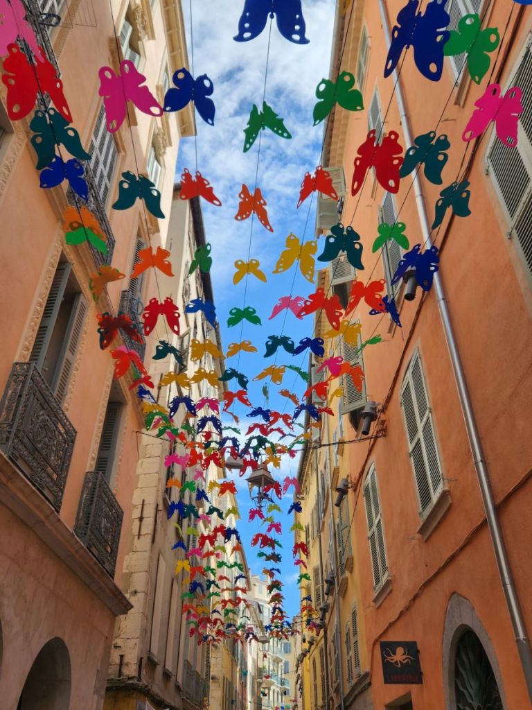 And that’s that. We wandered around a bit, taking in the scenery, found this great 3D boat mural, a street full of paper or plastic colored butterflies hanging overhead, great street scenes, the Cathédrale de Notre-Dame-de-la-Seds, the Église Saint François de Paule – the church on the corner of the Cours Lafayette and the square that was filled with priests and parishioners when we first arrived, but now is virtually empty. From there it is a quick hop, skip and a jump to the shuttle dock where we wait a bit in line then board the shuttle.