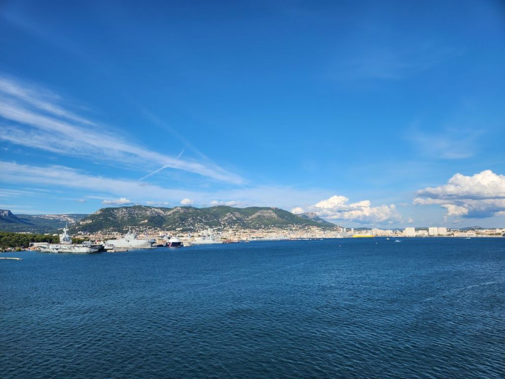 Back on board, we loll about the balcony, the weather is fantastic! 70 degrees, sunny. Just lovely. And the bonus being that while we loll outside, we get great views of Toulon as we sail away. Besides being a lovely Southern France town, Toulon is also a huge military naval base (we actually heard reveille this morning from our balcony!) and we end up passing all the ships in port as we start to sail out. Oh and I get a really good shot of the blasted fort that we never got to – looks great, but, we had a great day without it!