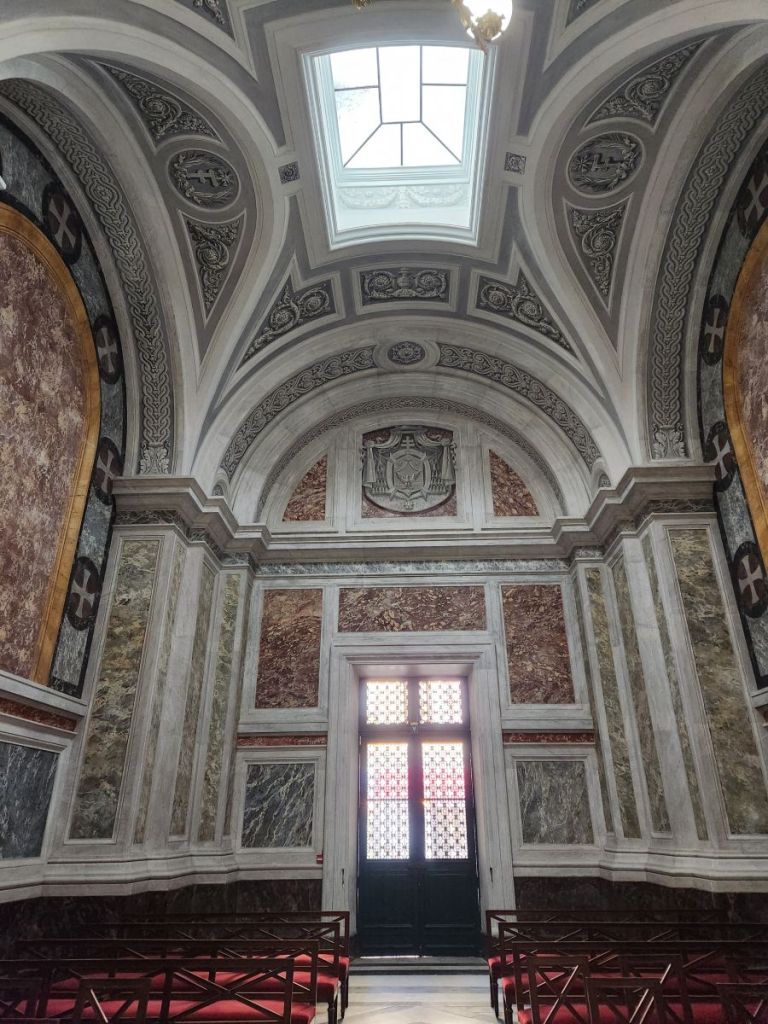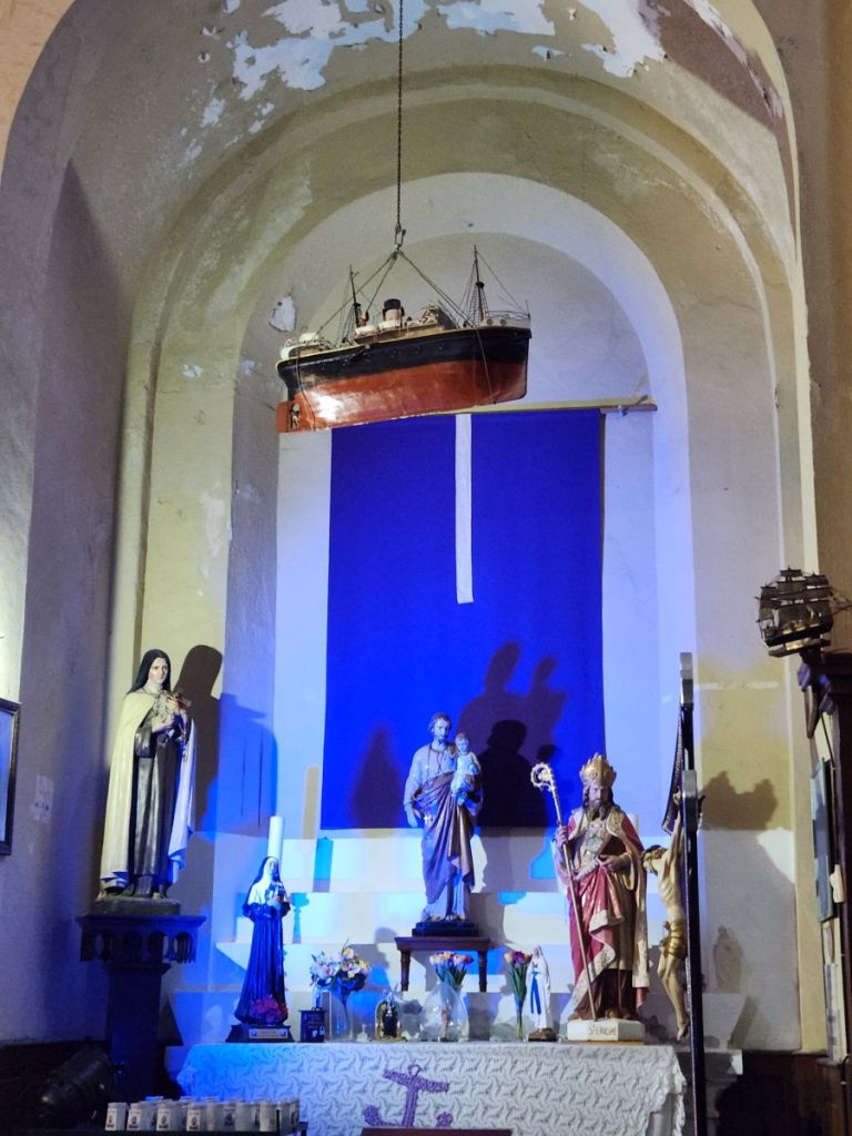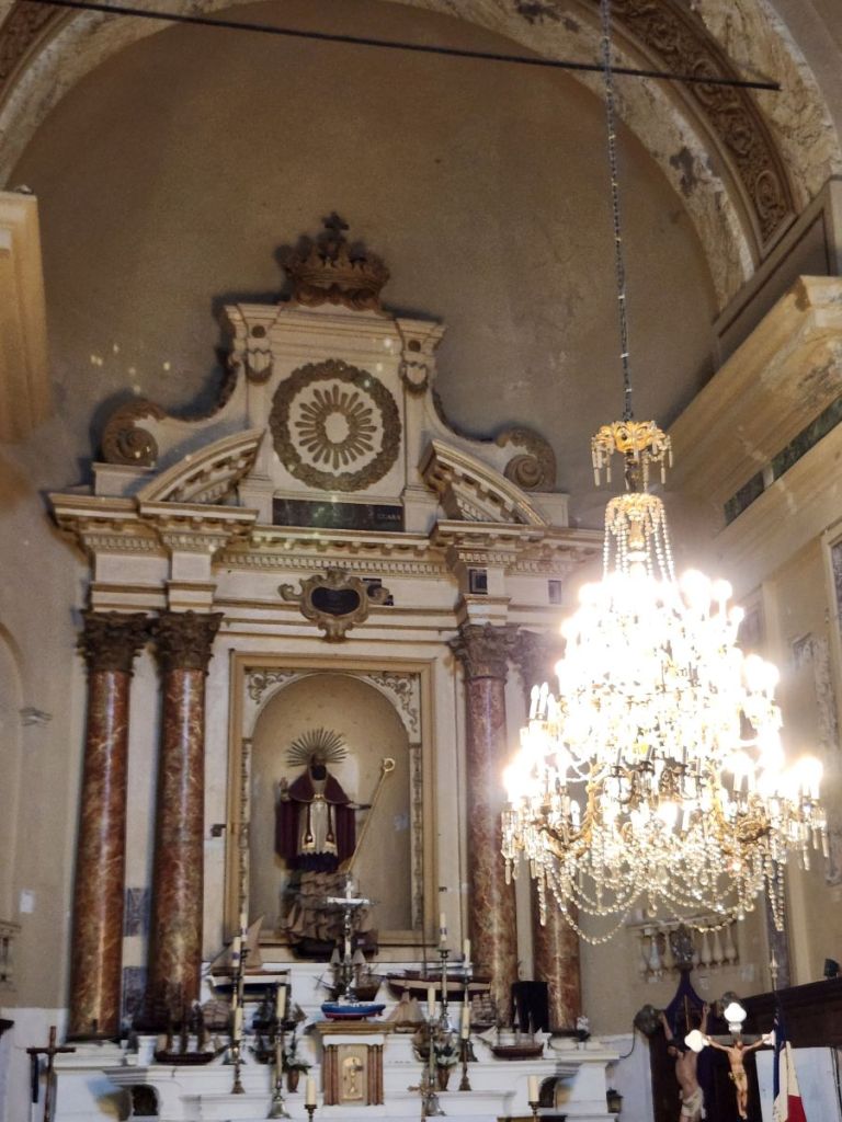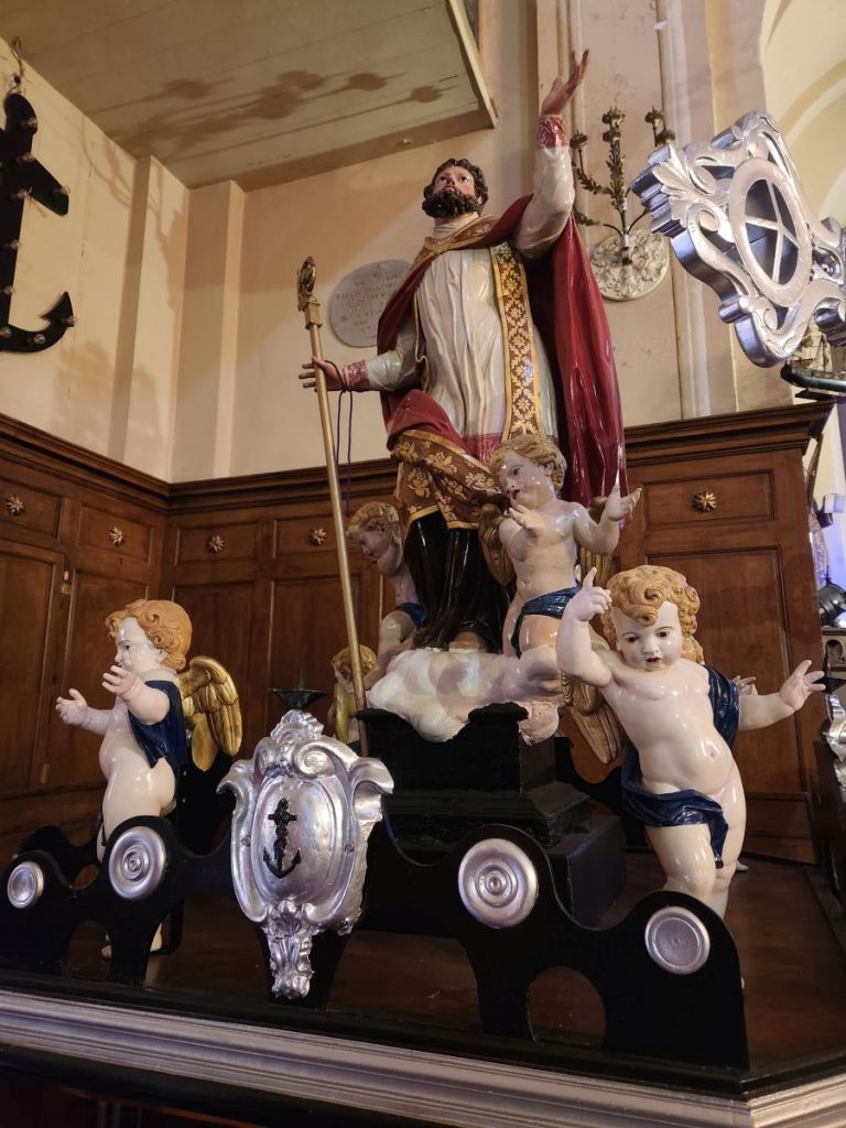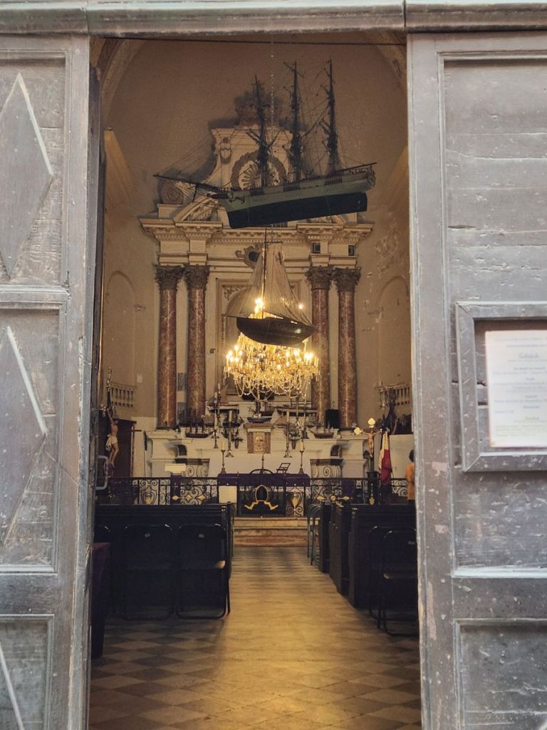 Moving on, we pass the fisherman’s chapel, which surprises the guide by being open. Bonus visit – not on the original tour, but since it is open, the guide lets us go in to see the décor. It is all about fishing and the sea – this is where the fishermen come to pray before sailing out (similar to Sete, only in a much more convenient – and flat – location). Inside is incredibly nautical with ships hung all about the church along with anchors and a Neptune statue surrounded by angels/cherubs. Cool little diversion.