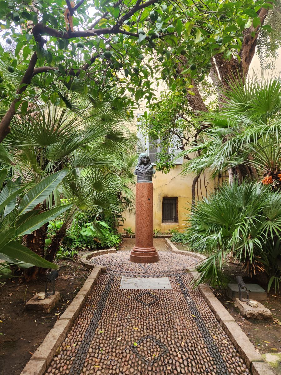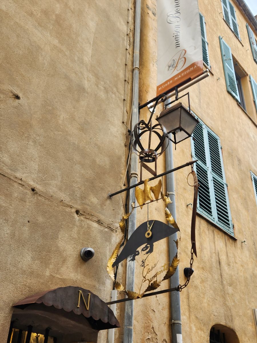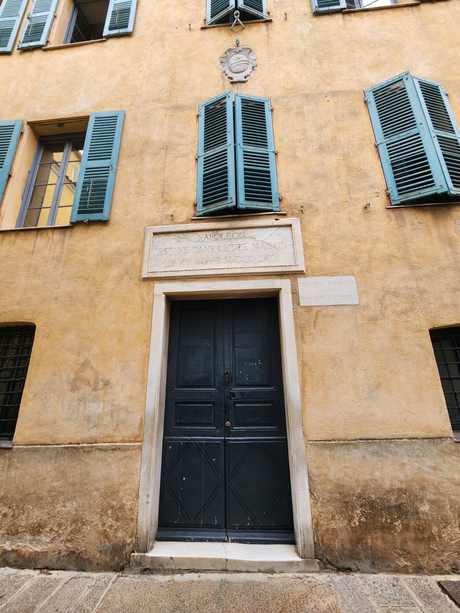 After the church, we wind our way back toward the waterfront, passing the Maison Bonaparte – the family house. Here we get more history lessons on Napoleon and can at least take pictures of the house, the gardens with the statue off his brother and this really cool metal sign on the side of the house.