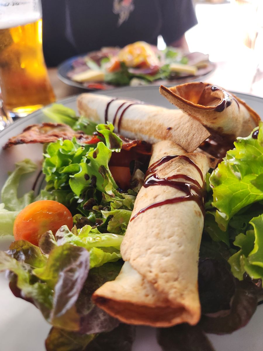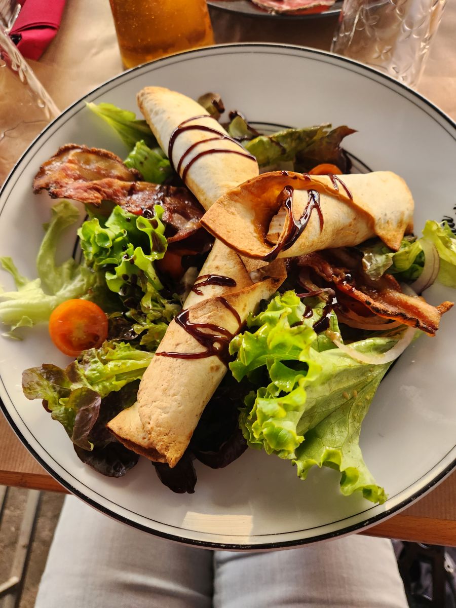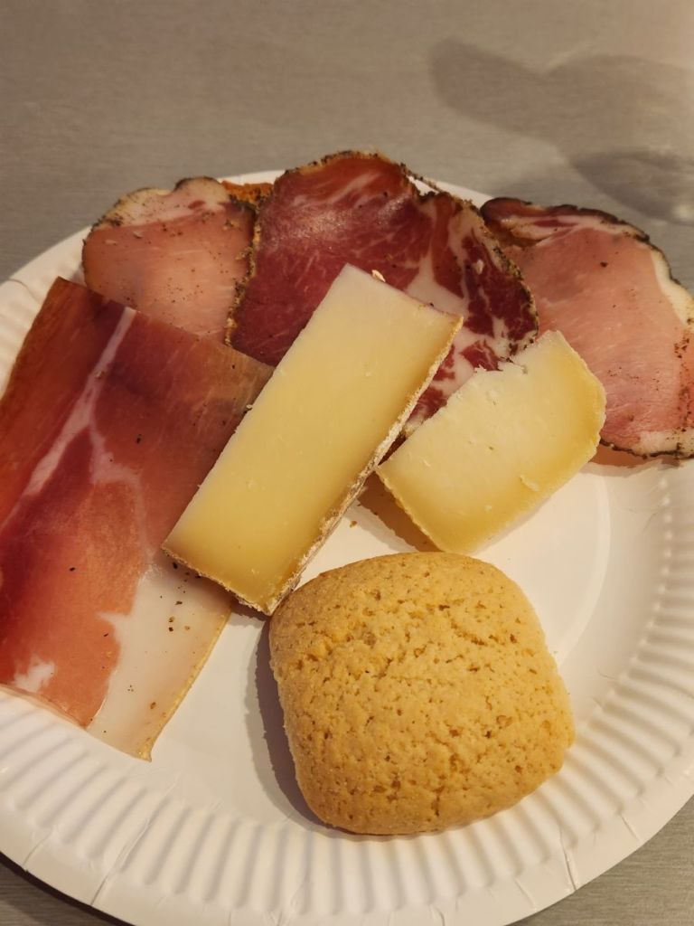 Lunchtime. We wander down the pedestrian street perusing all the menus and settle on a sweet little restaurant called Aio. The owner/server is a hoot, and talkative, and when he finds out we are from North Carolina tells us he had a cousin who stayed in Charleston SC. Small world! Trying to eat light, we decide to share a salad with goat cheese and a charcuterie platter. Oh, my. The goat cheese on the salad is what I’m going to call “taquitos.” Wrapped in an egg roll wrapper with caramelized onions and deep fried. And a sweet balsamic drizzle and honey on top. Oh. So good! Not exactly the ”light” we were looking for, but, we are not going to complain. Fabulous lunch!