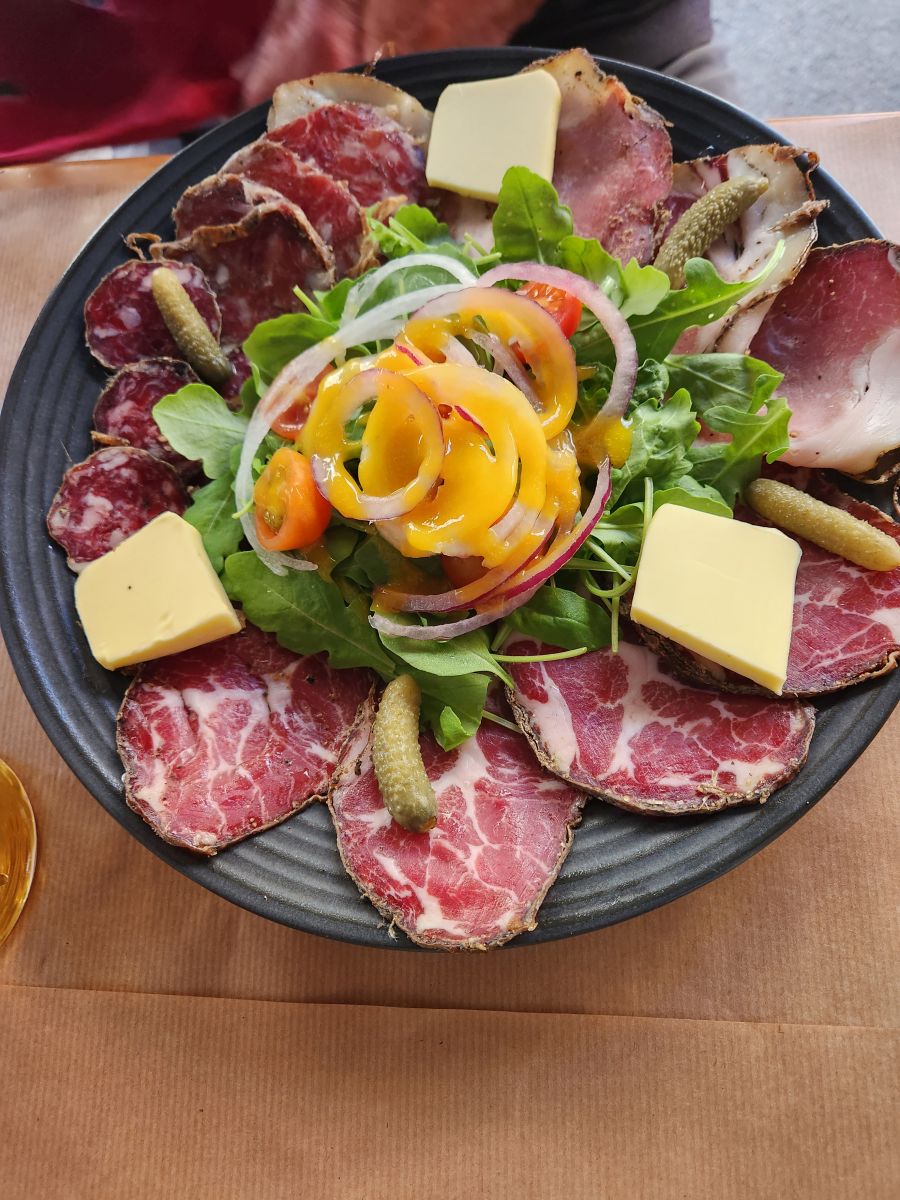 Now we are off to the “bar” where we will have our delicacies, which are basically charcuterie and a cookie. But at 10:15am, that’s really about all you’d want – oh, plus wine. Ok, so who is going to turn down wine, ever? A very nice rose, actually. Snacks done, we complete our tour by walking through the local products market, but being Monday, only a half the vendors were there (as mentioned previously). And while there are tons of things here, they are fairly pricey, and we’ve got some charcuterie stashed in our cabin anyway, so we pass up the shopping opportunity, say goodbye to our guide and begin our own wanderings around the town.