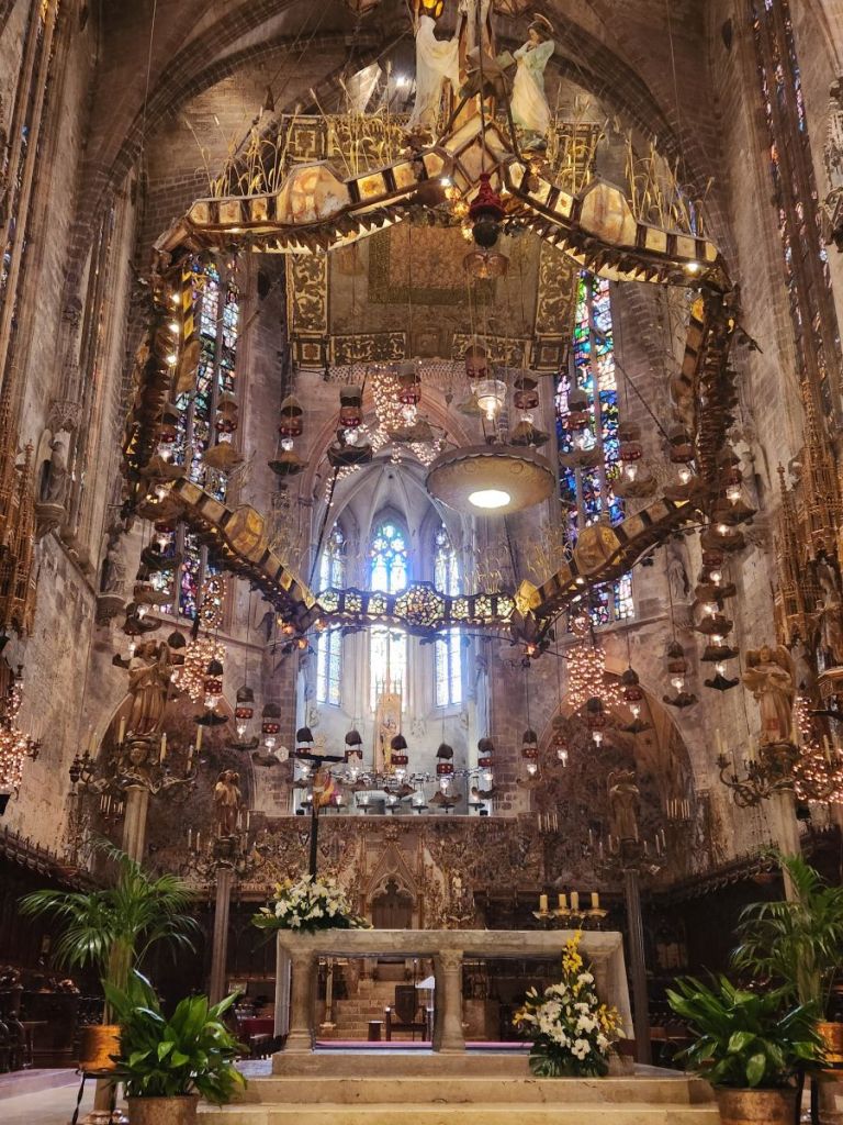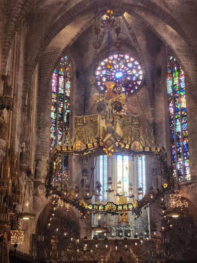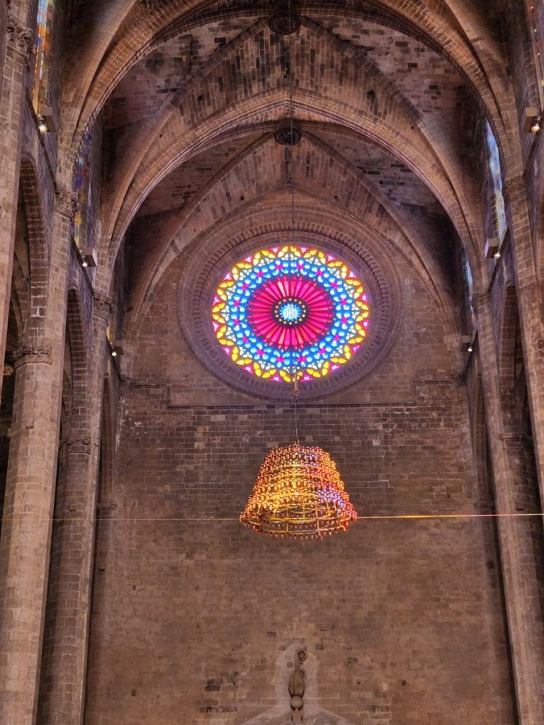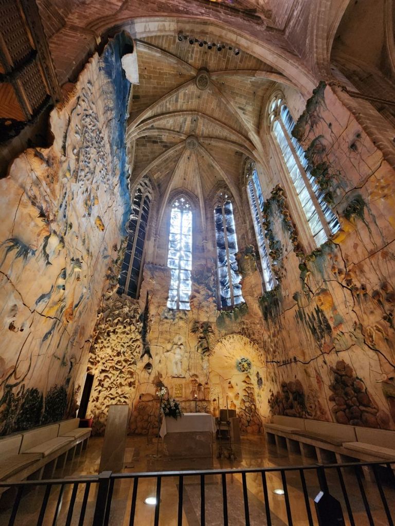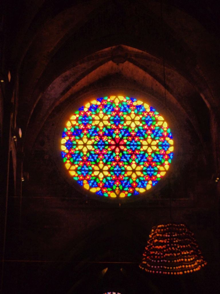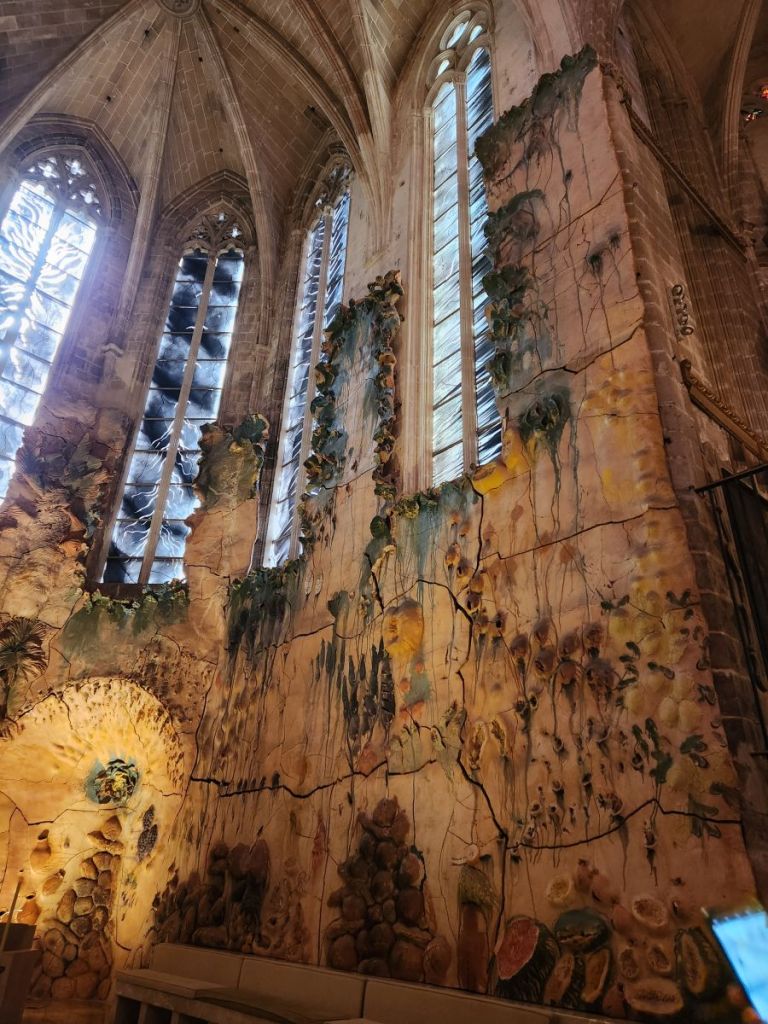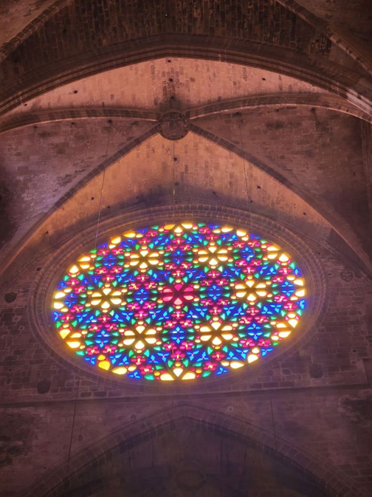 Got the first bus to town, headed to the Cathedral, Le Seu – where we’d never been – and got in line for tickets. The Cathedral is immense, huge and gothic. Soaring arched columns frame vibrant stained-glass windows. Side chapels hold golden statues of saints, wooden framed paintings, more stained windows and this bizarre chapel that in bas relief has one wall that looks like the ocean, one wall that looks like a garden and the back wall that sort of melds them both together? Truly strange. There is a crazy massive chandelier over the altar. And tiles in front of the altar – could be a tomb, could just be tiles – that depict an angel and a skull and cross bones. Eerily beautiful.