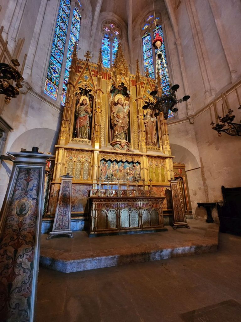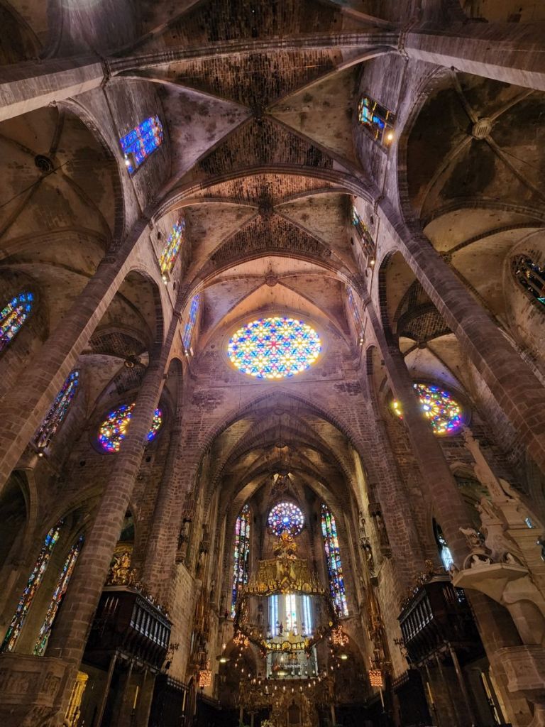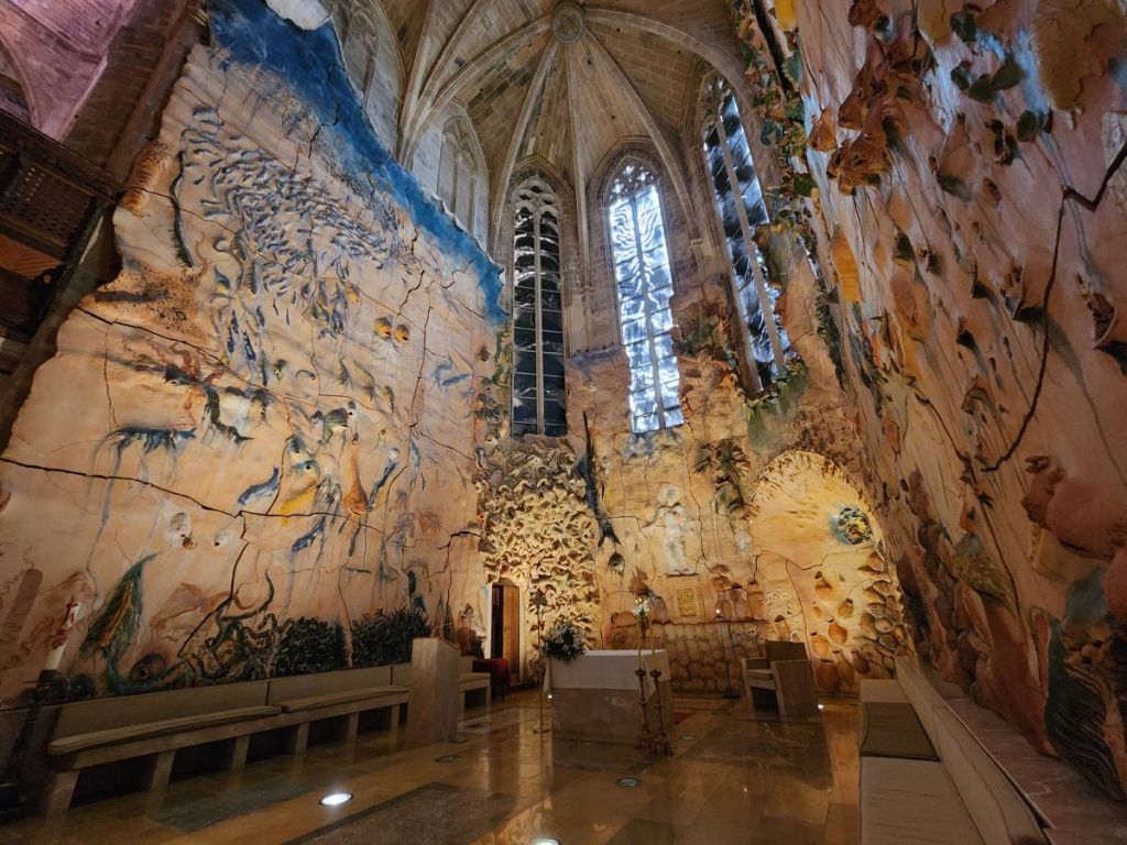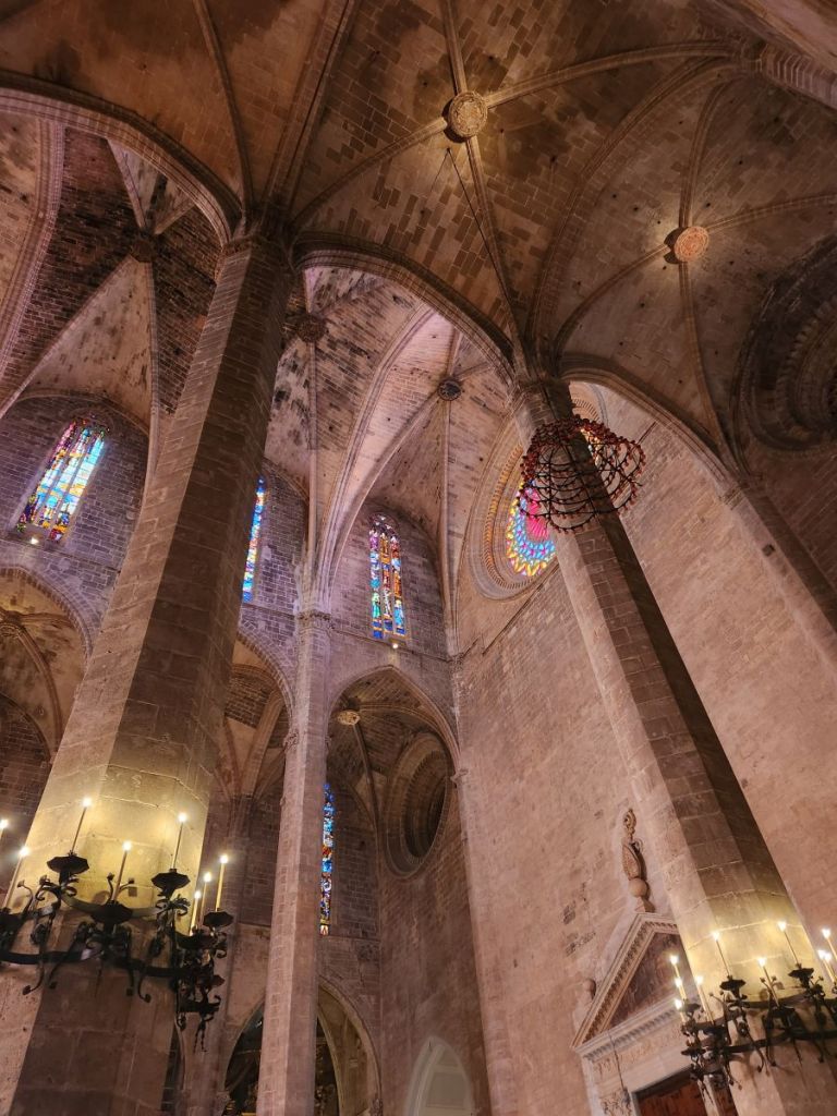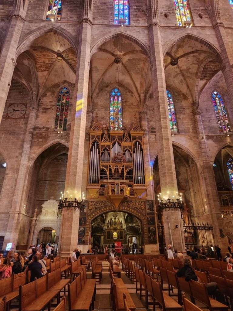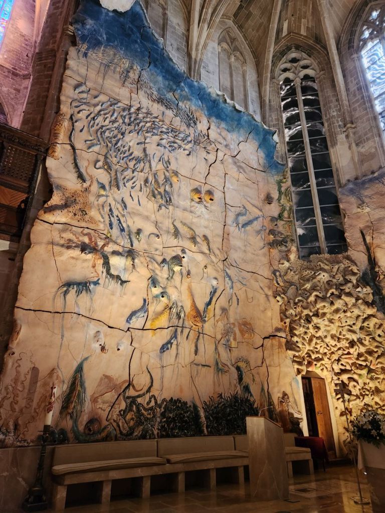 Got the first bus to town, headed to the Cathedral, Le Seu – where we’d never been – and got in line for tickets. The Cathedral is immense, huge and gothic. Soaring arched columns frame vibrant stained-glass windows. Side chapels hold golden statues of saints, wooden framed paintings, more stained windows and this bizarre chapel that in bas relief has one wall that looks like the ocean, one wall that looks like a garden and the back wall that sort of melds them both together? Truly strange. There is a crazy massive chandelier over the altar. And tiles in front of the altar – could be a tomb, could just be tiles – that depict an angel and a skull and cross bones. Eerily beautiful.