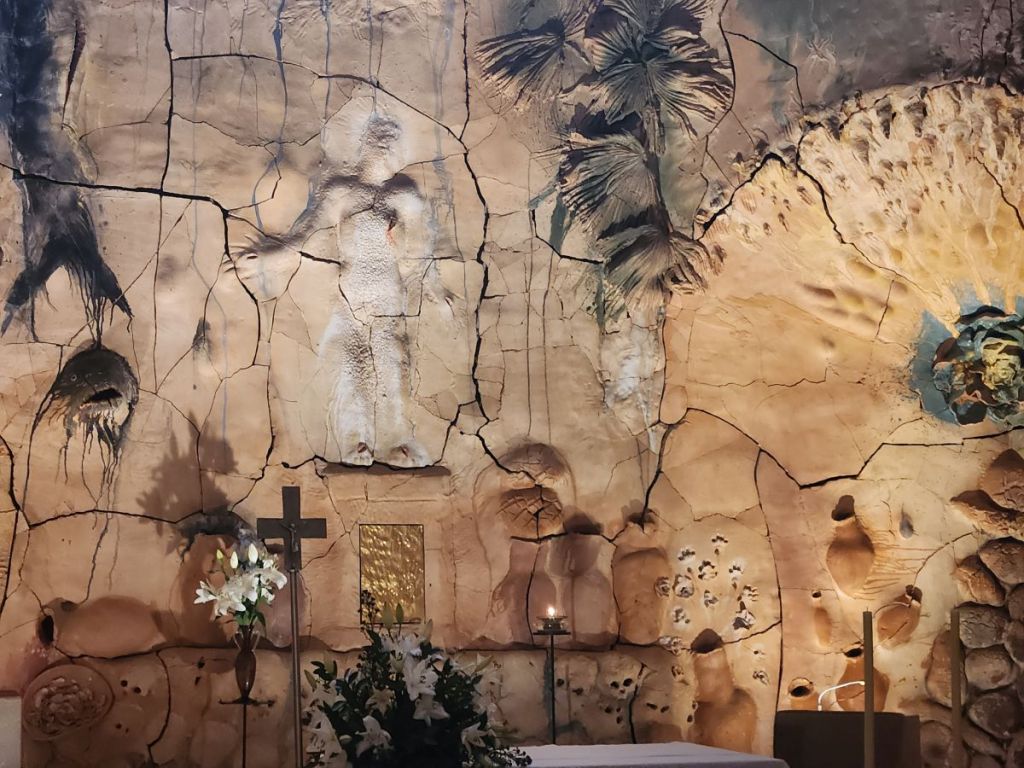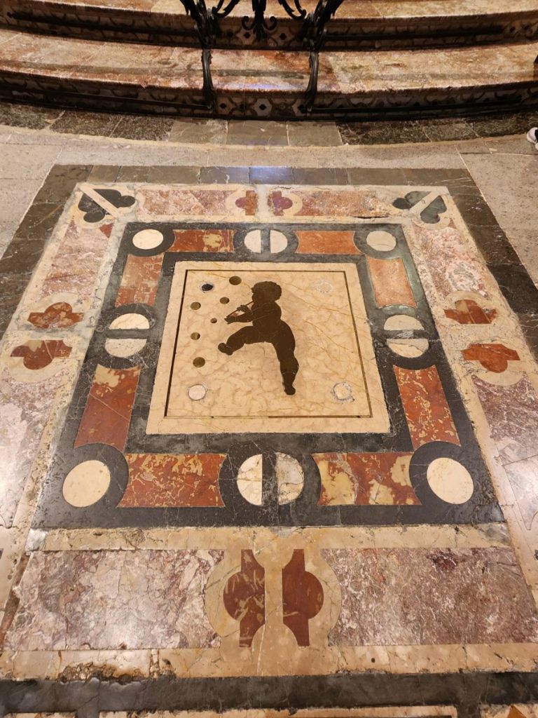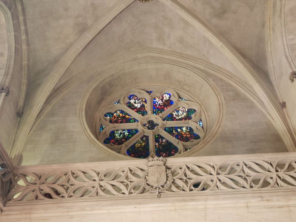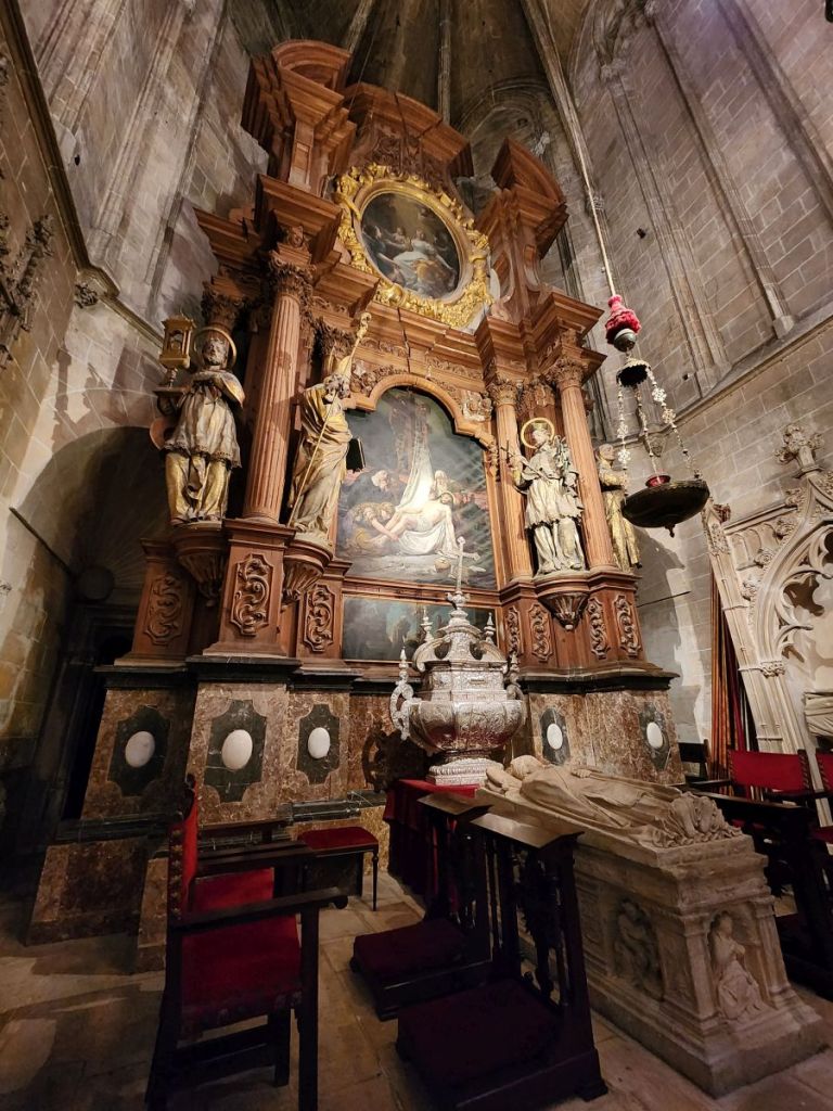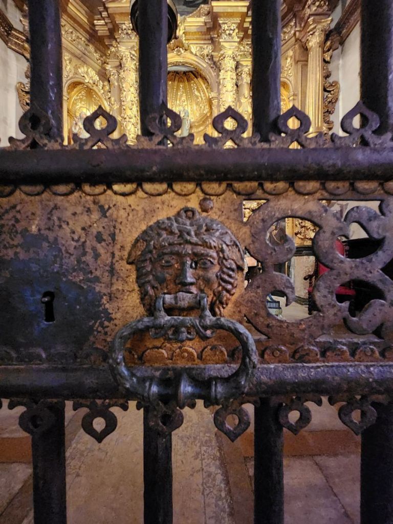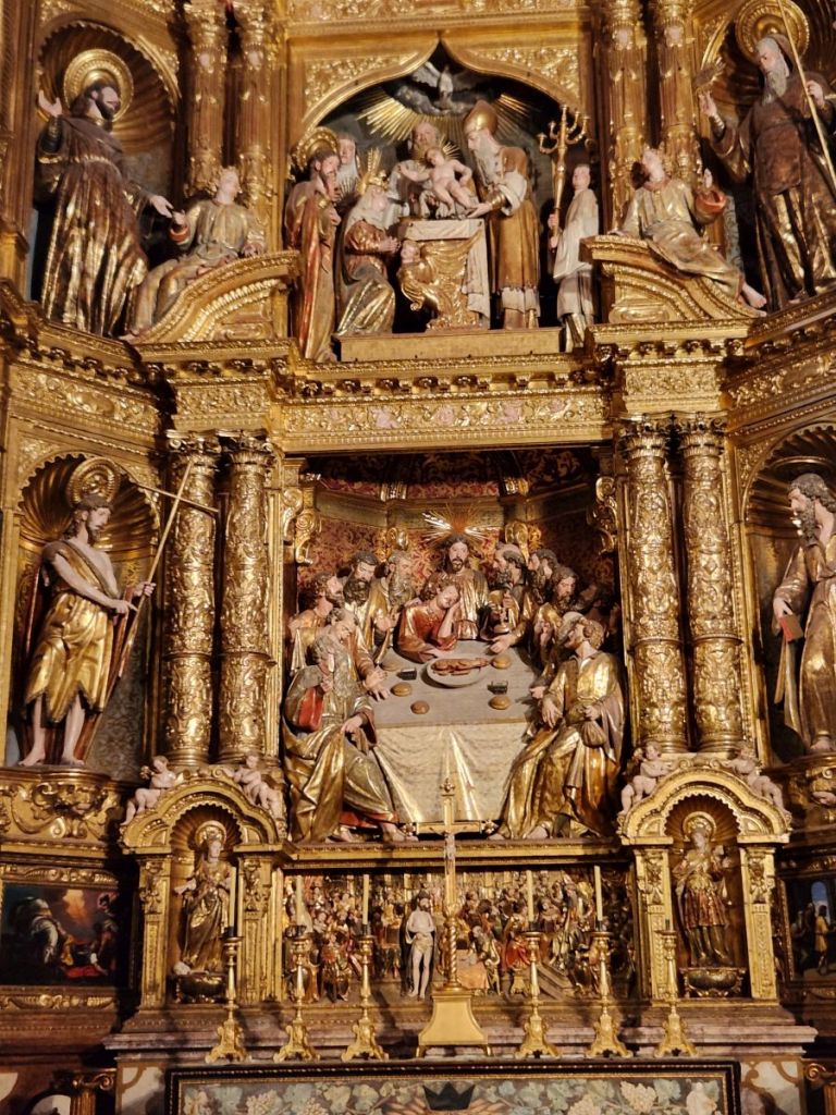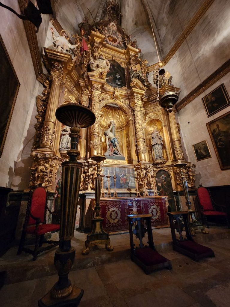 Got the first bus to town, headed to the Cathedral, Le Seu – where we’d never been – and got in line for tickets. The Cathedral is immense, huge and gothic. Soaring arched columns frame vibrant stained-glass windows. Side chapels hold golden statues of saints, wooden framed paintings, more stained windows and this bizarre chapel that in bas relief has one wall that looks like the ocean, one wall that looks like a garden and the back wall that sort of melds them both together? Truly strange. There is a crazy massive chandelier over the altar. And tiles in front of the altar – could be a tomb, could just be tiles – that depict an angel and a skull and cross bones. Eerily beautiful.