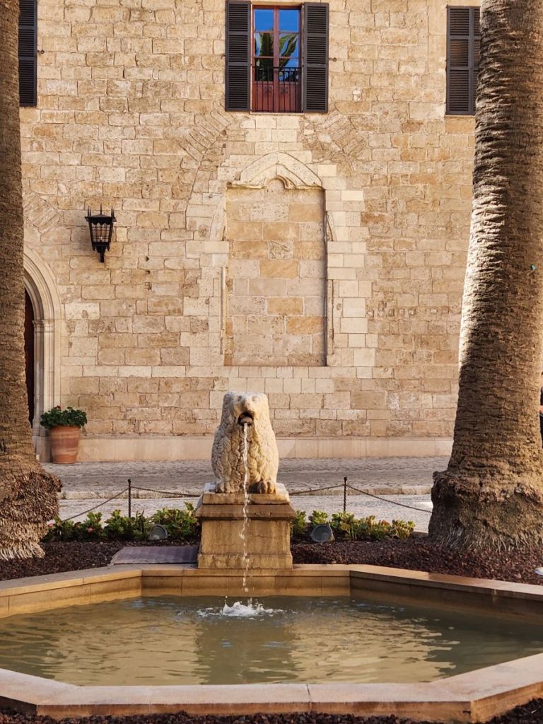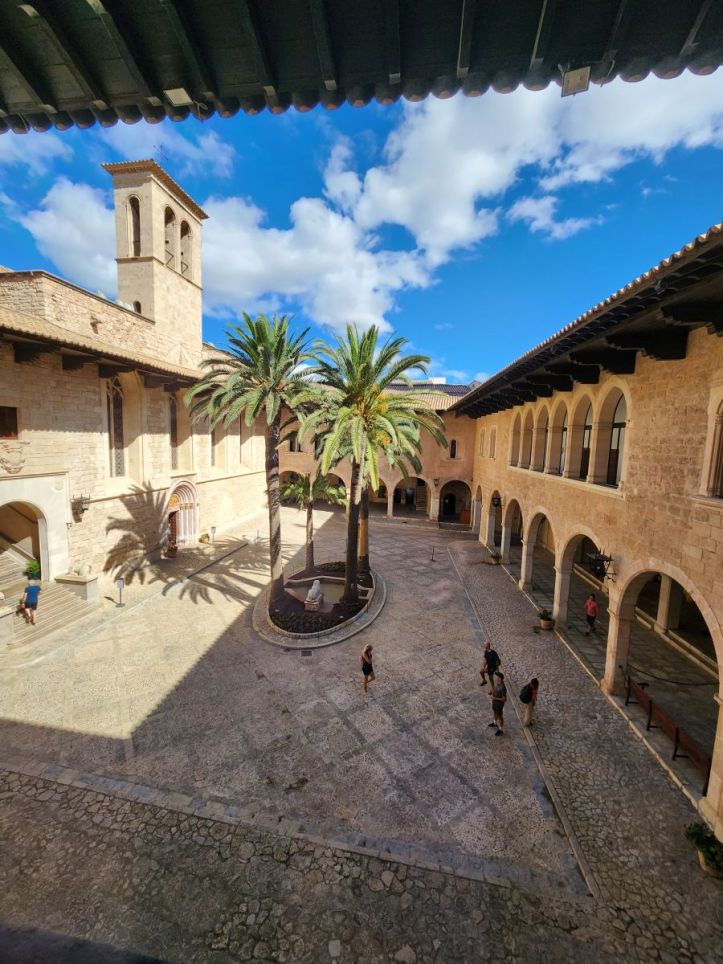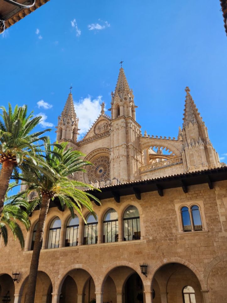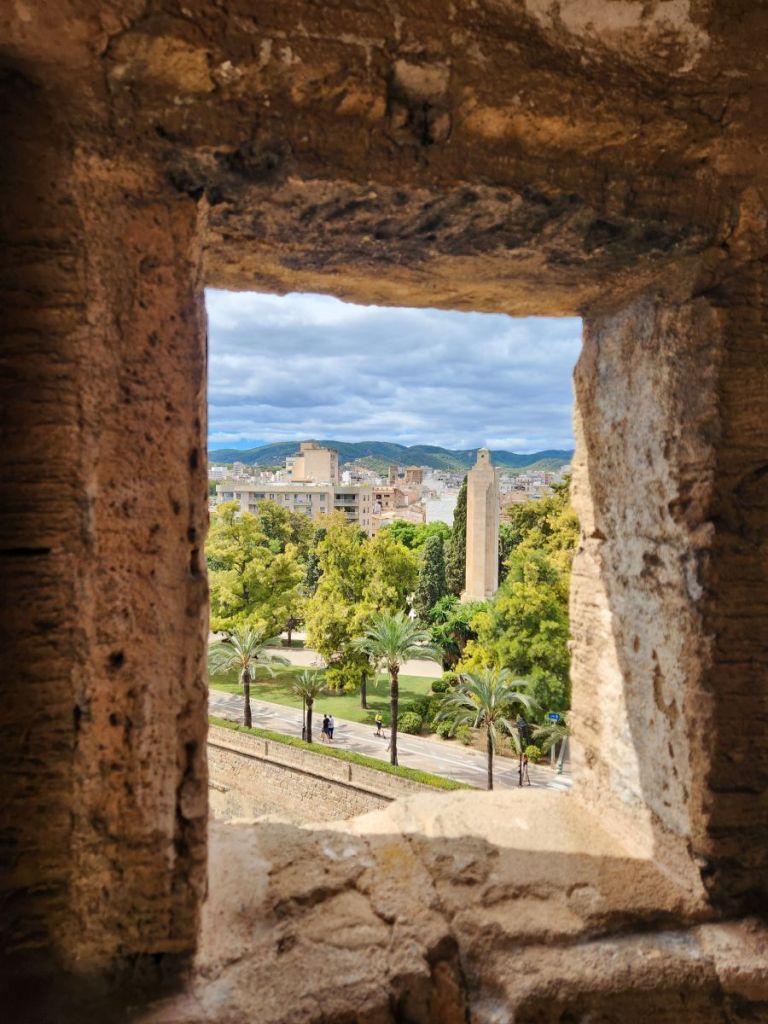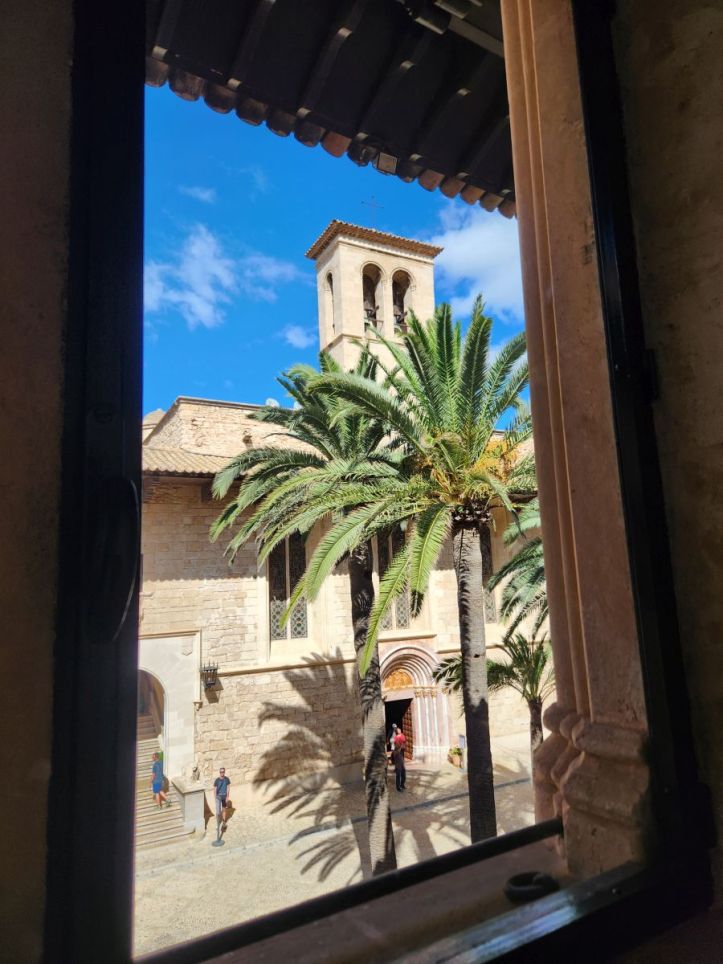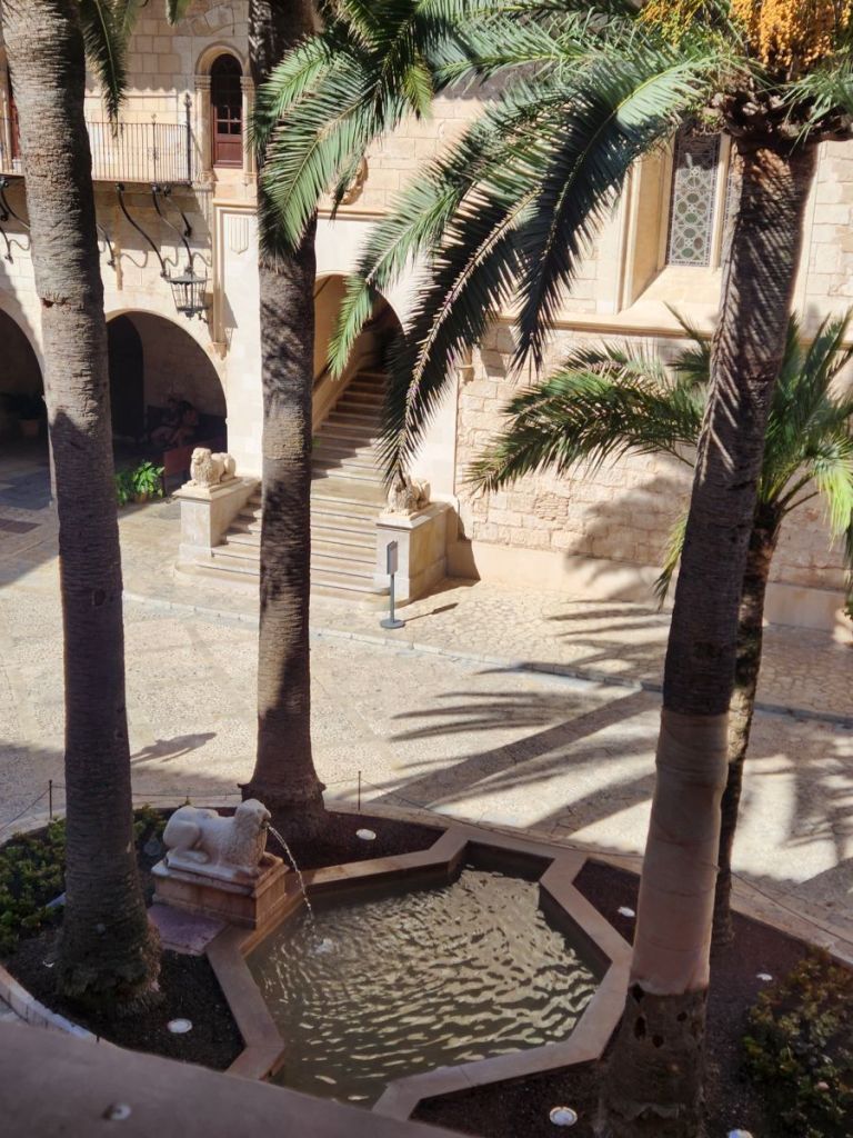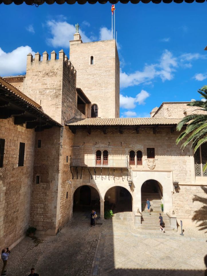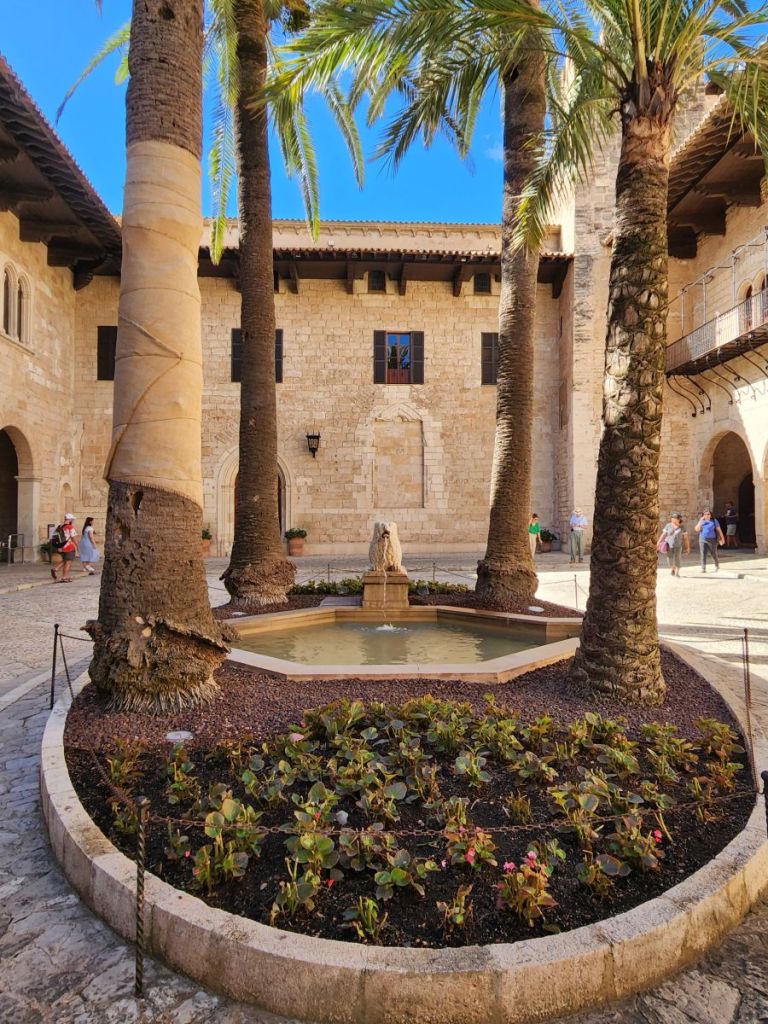Time for a cappuccino break. A nice little restaurant tucked away in the corner of the courtyard next to the Cathedral is the perfect place to sit for a bit and get our bearings. Unfortunately, we have been having data problems – it has been hard to connect to mobile data now that we are in the Baleric islands. Weird. We had no issues on mainland Spain. So today again, we have no data at all. We have to get Wi-Fi from the museums or restaurants. And this restaurant does not have Wi-Fi, so getting bearings is a bit rough, but we’ll work it out. Plus, our next stop is just across the courtyard at the Palace Real de la Almudaina.