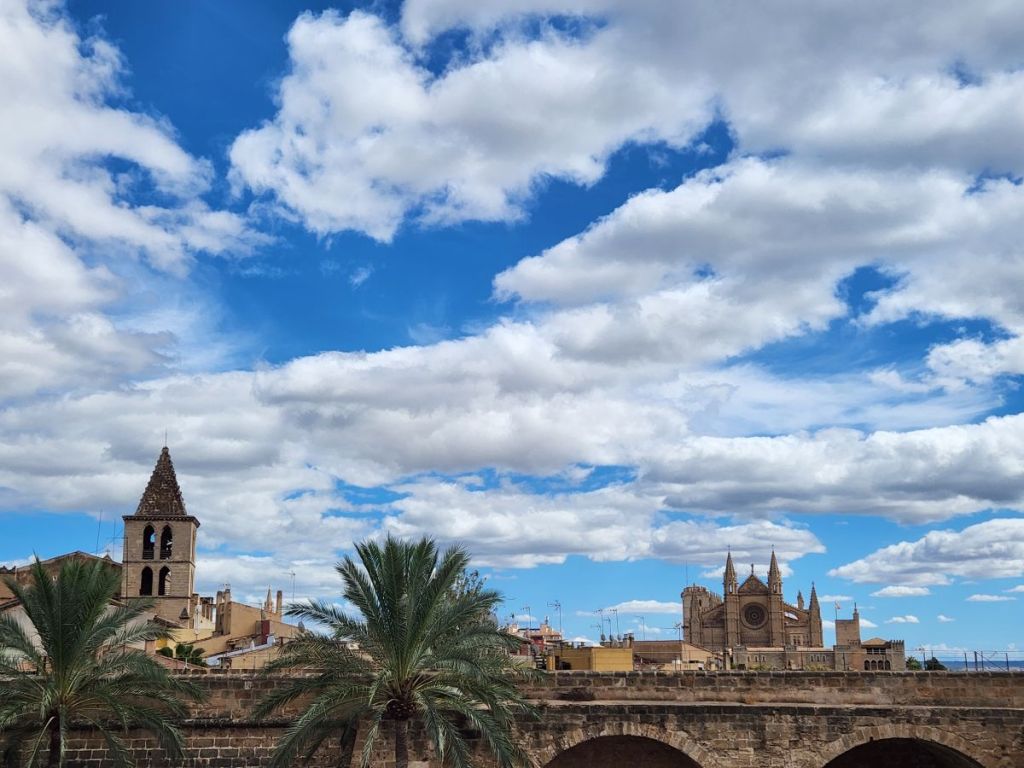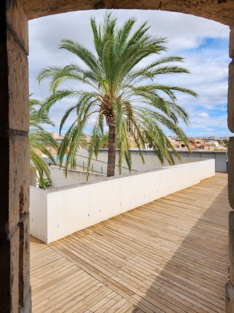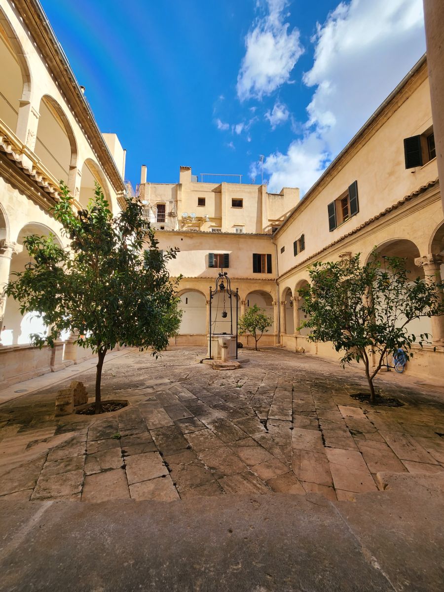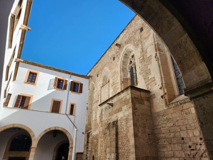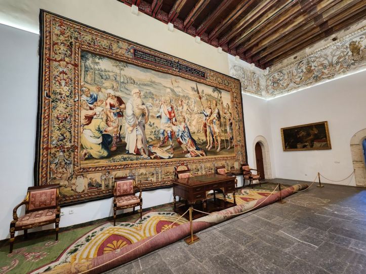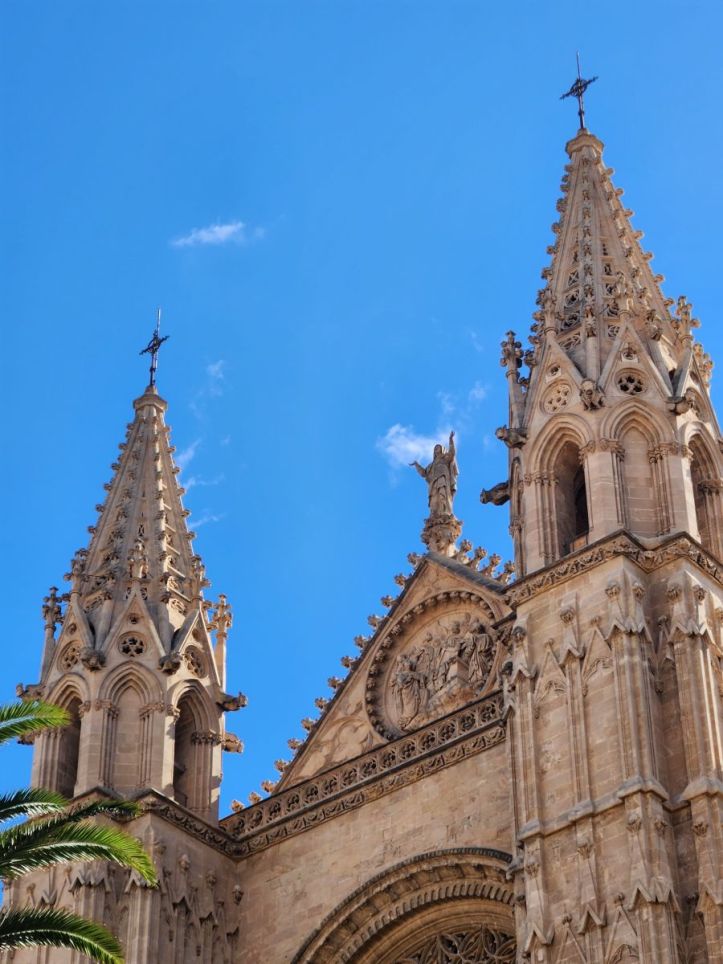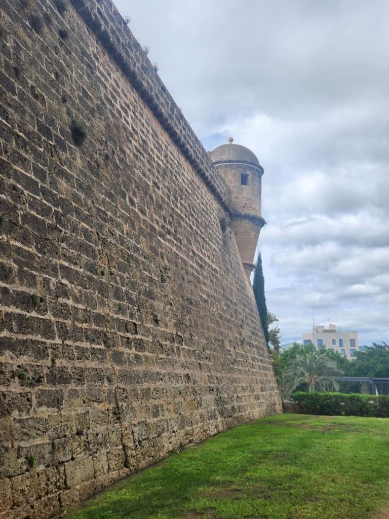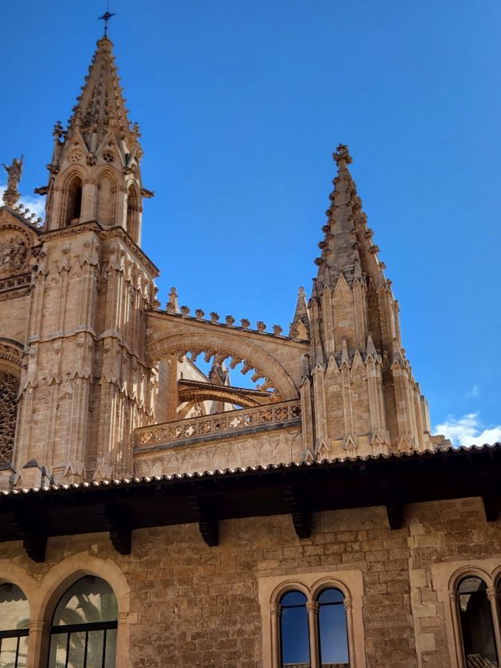 Time for a cappuccino break. A nice little restaurant tucked away in the corner of the courtyard next to the Cathedral is the perfect place to sit for a bit and get our bearings. Unfortunately, we have been having data problems – it has been hard to connect to mobile data now that we are in the Baleric islands. Weird. We had no issues on mainland Spain. So today again, we have no data at all. We have to get Wi-Fi from the museums or restaurants. And this restaurant does not have Wi-Fi, so getting bearings is a bit rough, but we’ll work it out. Plus, our next stop is just across the courtyard at the Palace Real de la Almudaina.