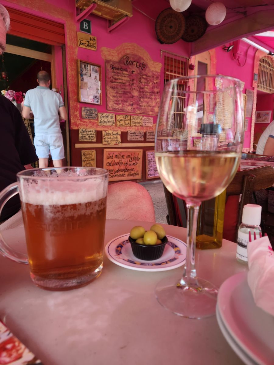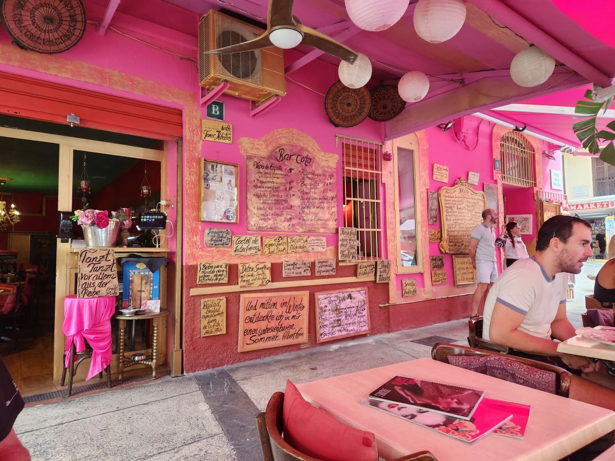 At any rate, map downloaded, we just end up wandering off – looking for a lunch spot off the beaten path – ha ha, here in Palma? Well, how about just off the main streets? We had decided we would go to the Contemporary Art Museum, even though we’ve been there before, and just headed in that direction. Passed by the little restaurant, El Tunel, where we ate the last time we were here. They weren’t open yet, but we didn’t want to eat there again anyhow, we wanted something new. And we found the perfect spot in a little plaza on the way to the museum – Bar Coto. It was the menu art that pulled us in – and so glad it did!