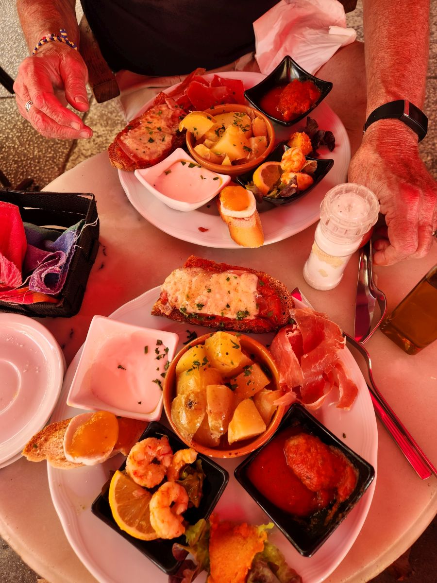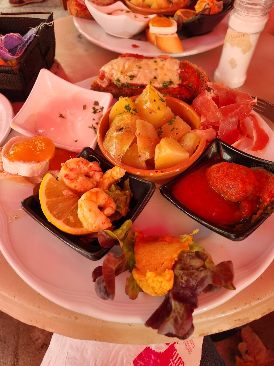 It is a hopping place, with an excellent outdoor seating area, great décor, great atmosphere and equally great selection of food. We ended up ordering the set of 7 tapas for each of us, probably too much, but, what the heck. The tapas are fabulous – pan de tomat, jamon, albondigo, hummus (ok, well, that’s a pass for me), gamberas (which is what we ordered the 7 set for, the 5 set didn’t include the shrimp!), goat cheese and jam and patatas. Overall, all excellent!
