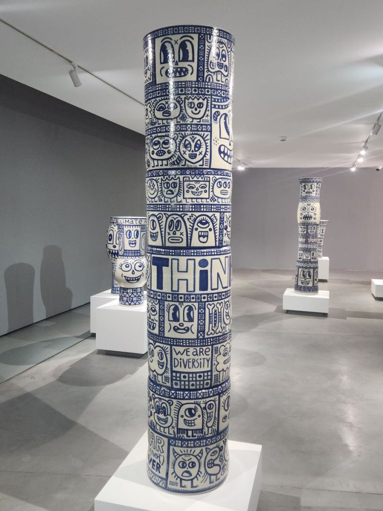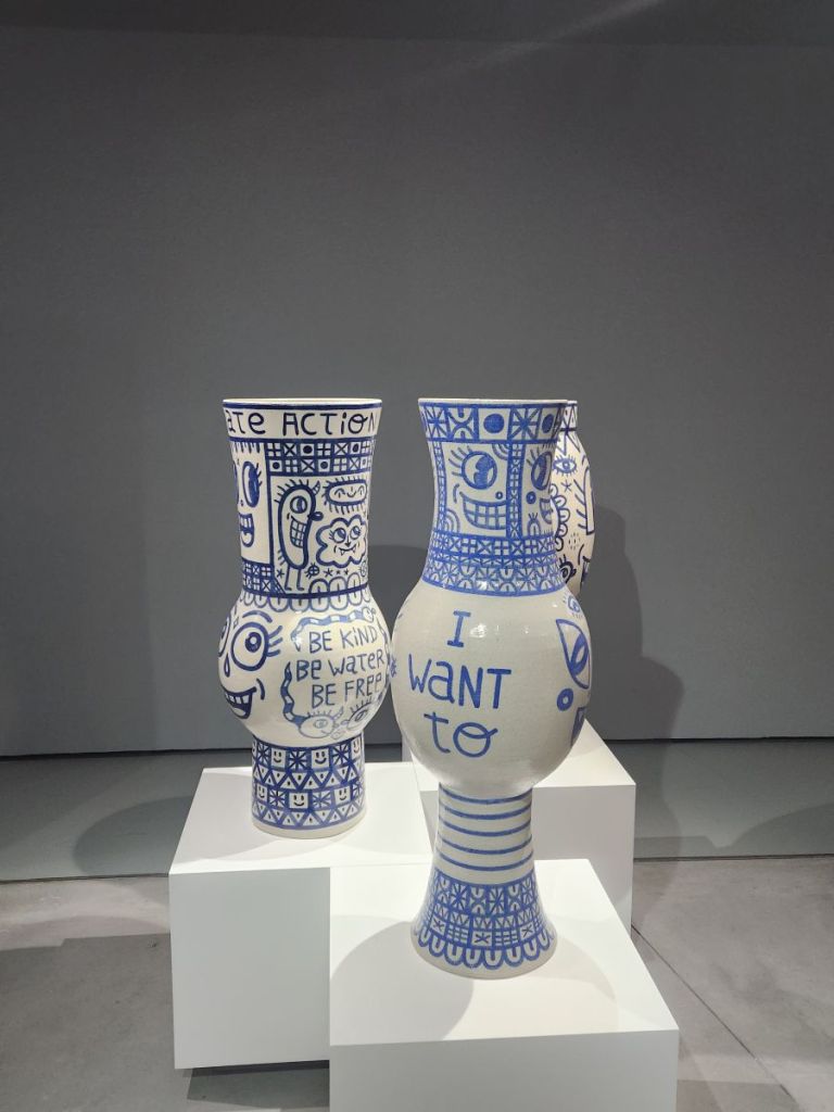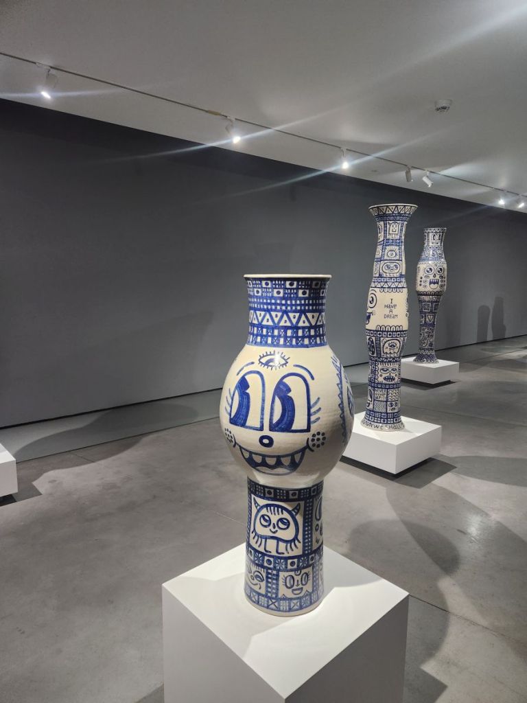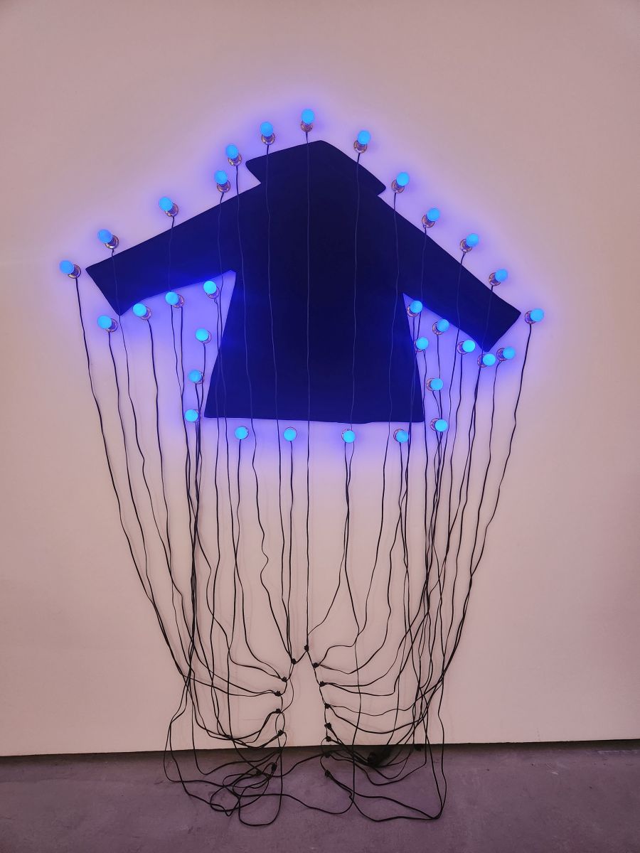 Back inside we visit the Emboidment of the Grotesque exhibit. Grotesque, yes, weird, yes, explanation? Don’t really get it, but it is fun to look at – and a lot of the drawings actually look like Miro. There is also this jacket with blue lights all around it, and wires draped to the floor called the Wandering Jew. ???