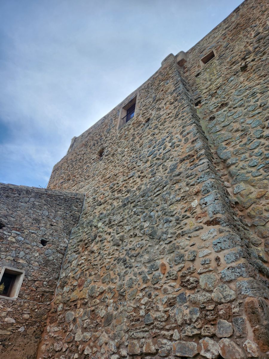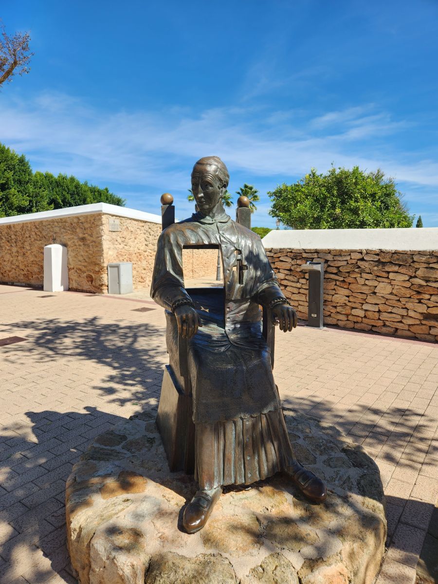 Easily finding the church perched at the top of the hill, and used by the villagers to hide from marauding pirates, we park and wander around the pretty white church. We can see why the villagers barricaded themselves in here, the walls are huge and made of sturdy rock, and the views views down into the village confirm it was a great strategic location Further around the back of the church we peek into the locked graveyard, then circle back to the car for a final good by to the poet Maria Villangomez Llobet, who was born on the island, and whose statue adorns the courtyard.