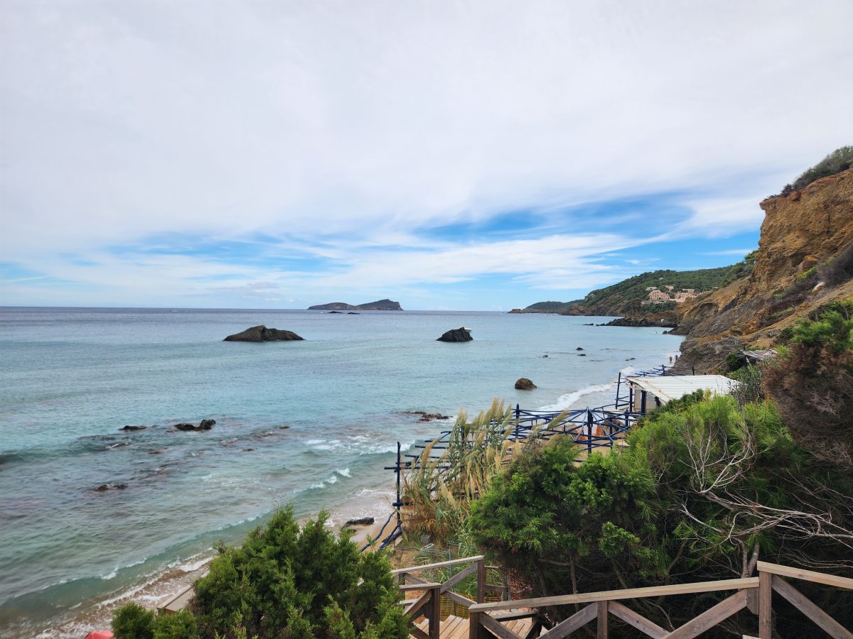 Arriving at Aigua Blanca, we find carpark easily enough and pay our 4 euros to park – even though the parking attendant guy thinks we’re crazy since he told us the tide was in and there was very little beach – and of course we don’t have any beach gear at all – we’re just here for the scenery – and no – before you even think it – not the “nudists” scenery!). Out of the car, we hike down a really steep road to the beach access, where, as promised, there isn’t much beach left to enjoy. Some hardy souls are down there – and the views are lovely – although nary a nudist is to be seen.