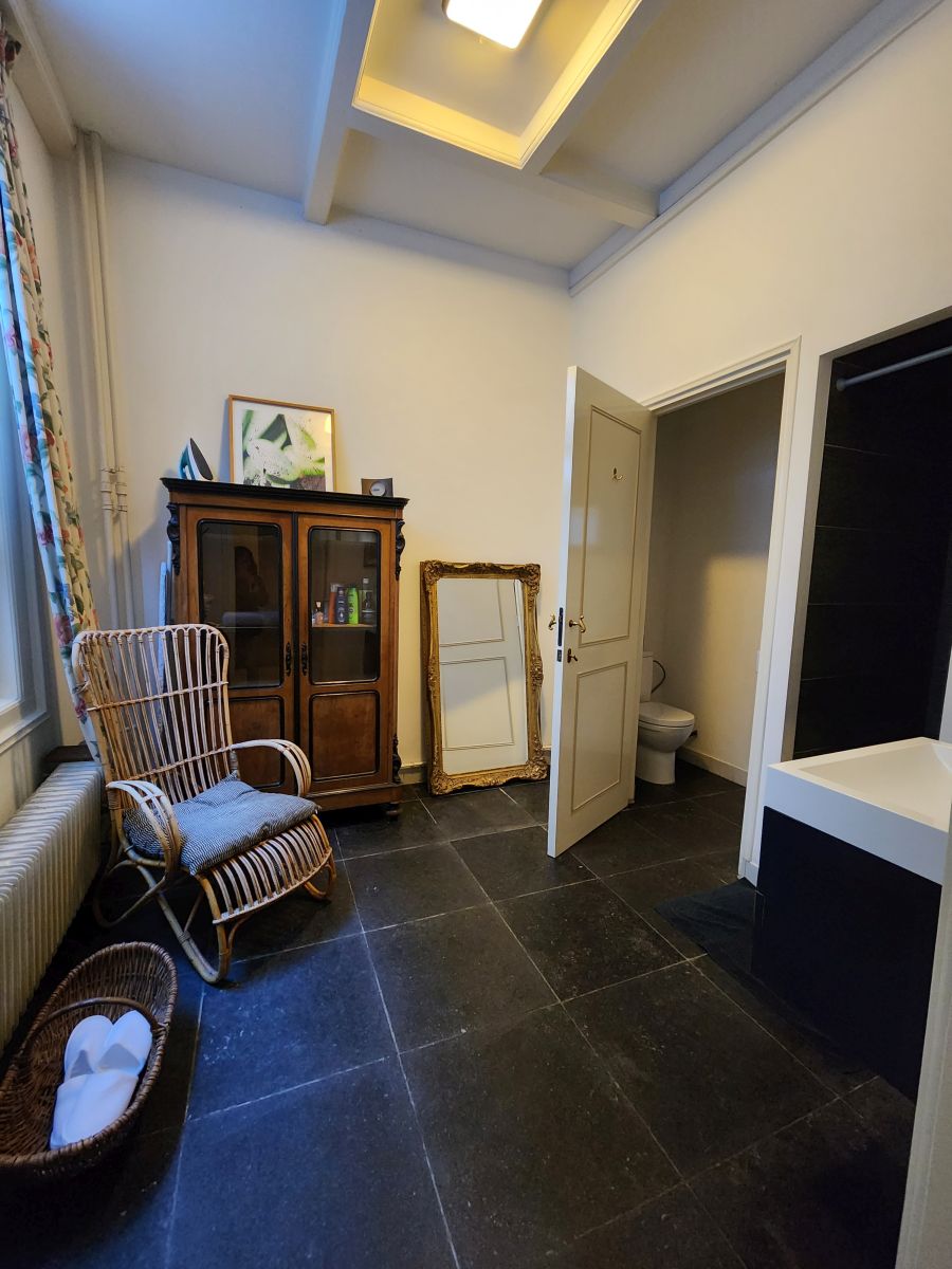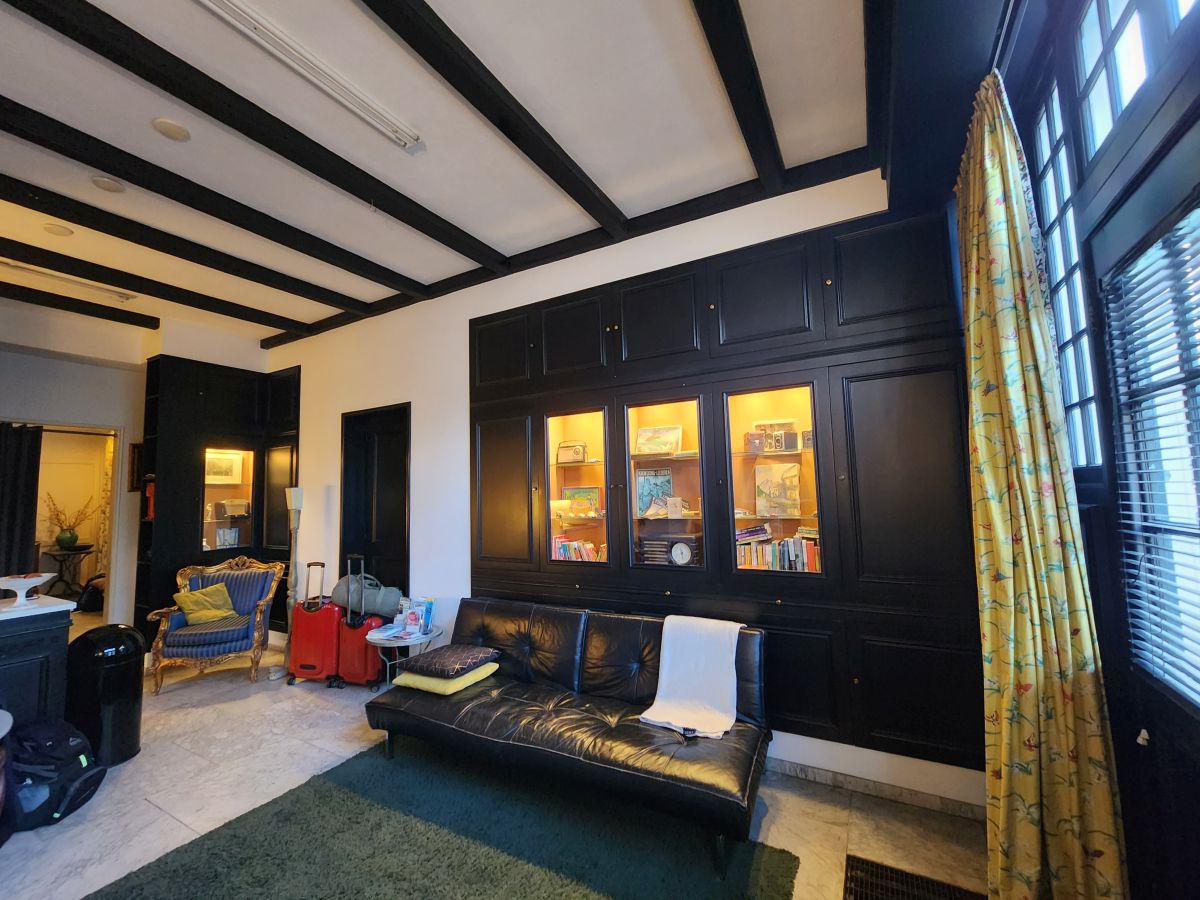 Located on the ground floor of the building (the owners live upstairs), you enter into the living area – a very spacious living area with sofa, dining table and open kitchen – fully renovated. There are antique furnishings everywhere – and a bookcase filled with books and tons of interesting memorabilia. The bedroom is up a step and quite large with a big double bed, huge dresser and armoire, plus French doors that lead out onto the enclosed patio area. In the next room – almost a dressing room is the shower and separate toilet. The decor is superb – just lovely and homey and really well done. We couldn’t be happier at this point!