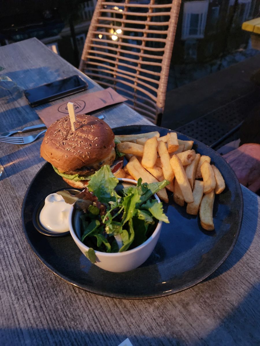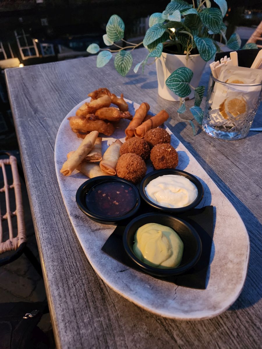 Stocked up and ready for our next few days, we head out across the canal for our first dinner in Den Haag, settling on an outside table at Kaai 13, a lovely little bistro on the canal. Ed was craving a hamburger, which was prominently featured on the menu and I decided to go all in Netherlands cuisine with the Bittergarnituur – the fried snack platter. clog up those arteries! All were delicious, including the bitterballen, a Dutch form of croquette that is quite yummy. Couldn’t have asked for a better meal, a better setting or better weather for our first night in Den Haag. We had a lovely time sitting on the canal, sipping our beverages and sampling the cuisine.