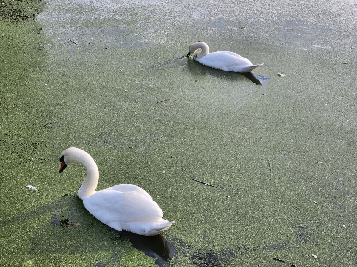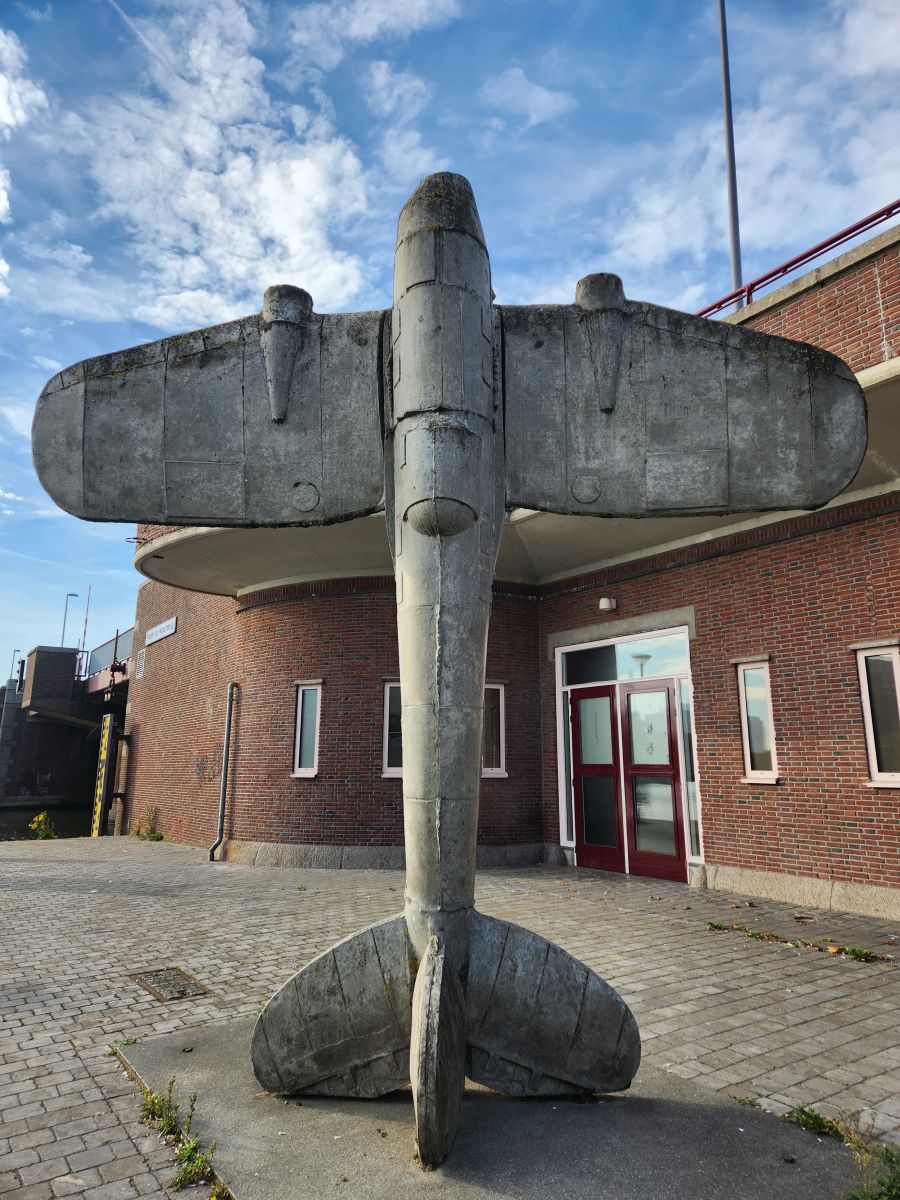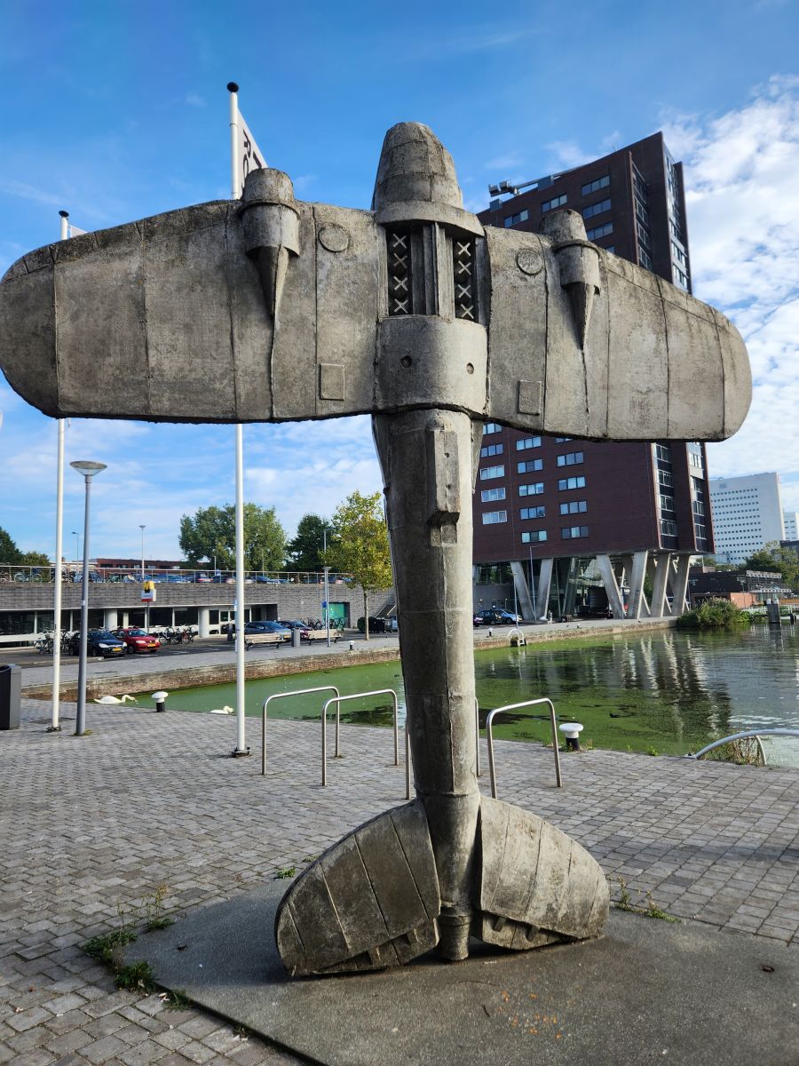 20 minutes after boarding our train, we are deposited into Rotterdam Centrum, walking down a pretty wide promenade along a canal with interesting sculptures on our way to the Museum Rotterdam 40-45 Now, which focuses on WWII and the effect it had on the city. As we arrive early (of course, it is us!), we spend about 10 minutes out front, amusing ourselves with the swans swimming around in the algae right next tot he pier and the WWII replica statuary on the plaza in front of the doors.