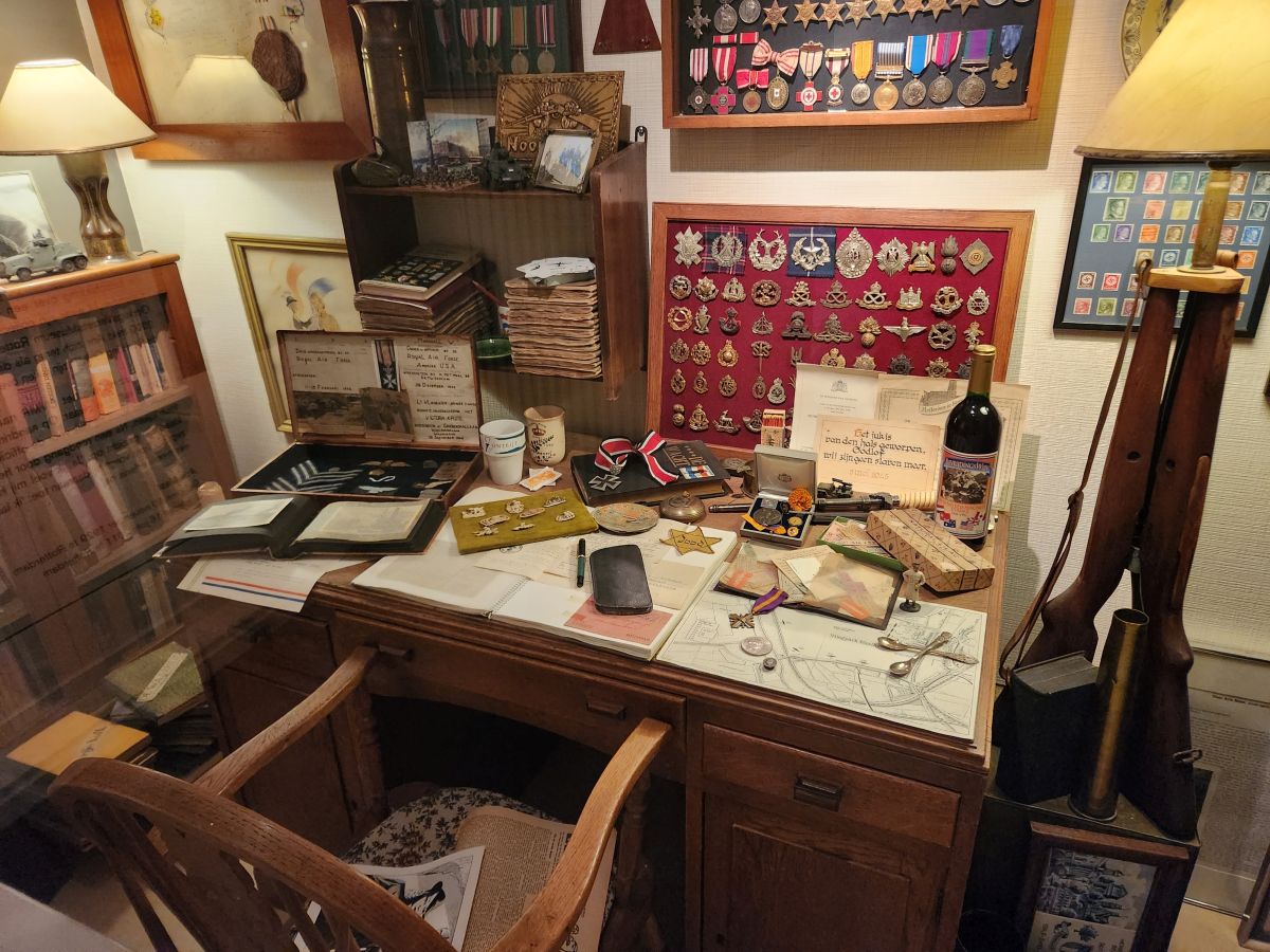 Opening right on time (thankfully because we were in need of a restroom stop!), we ambled in, stowed our backpack, talked to the very nice staff and began our wanderings through the hundred thousand authentic objects saved from the WWII time period. The display case is almost 100 feet long for heavens sake! There are weapons and uniforms and radios hidden in canisters and doctor’s stethoscope kits. A baby carriage with the bottom hollowed out to carry guns and papers. Plus just ordinary thins like make up and dishes and dresses and packaging and sneakers. Plus an entire office replicated with war medals and paraphernalia.