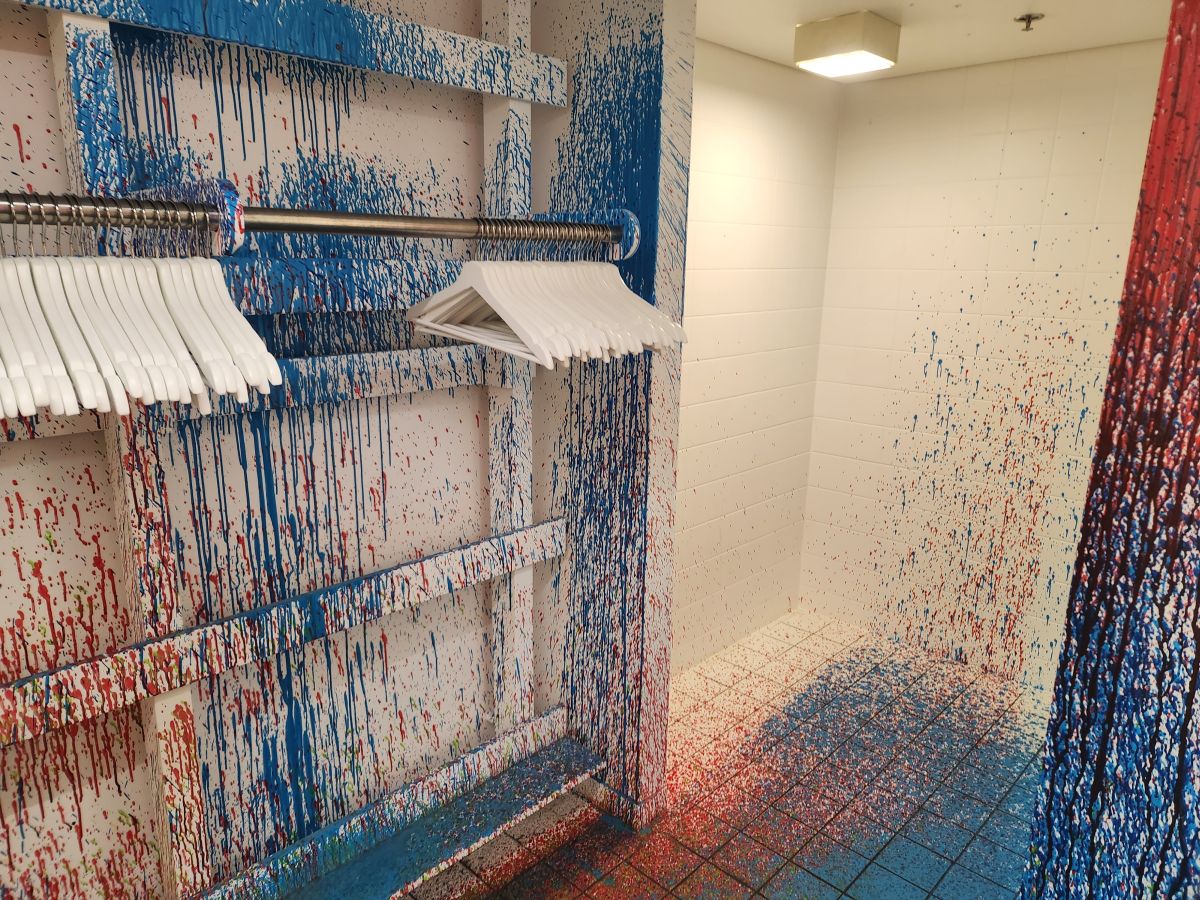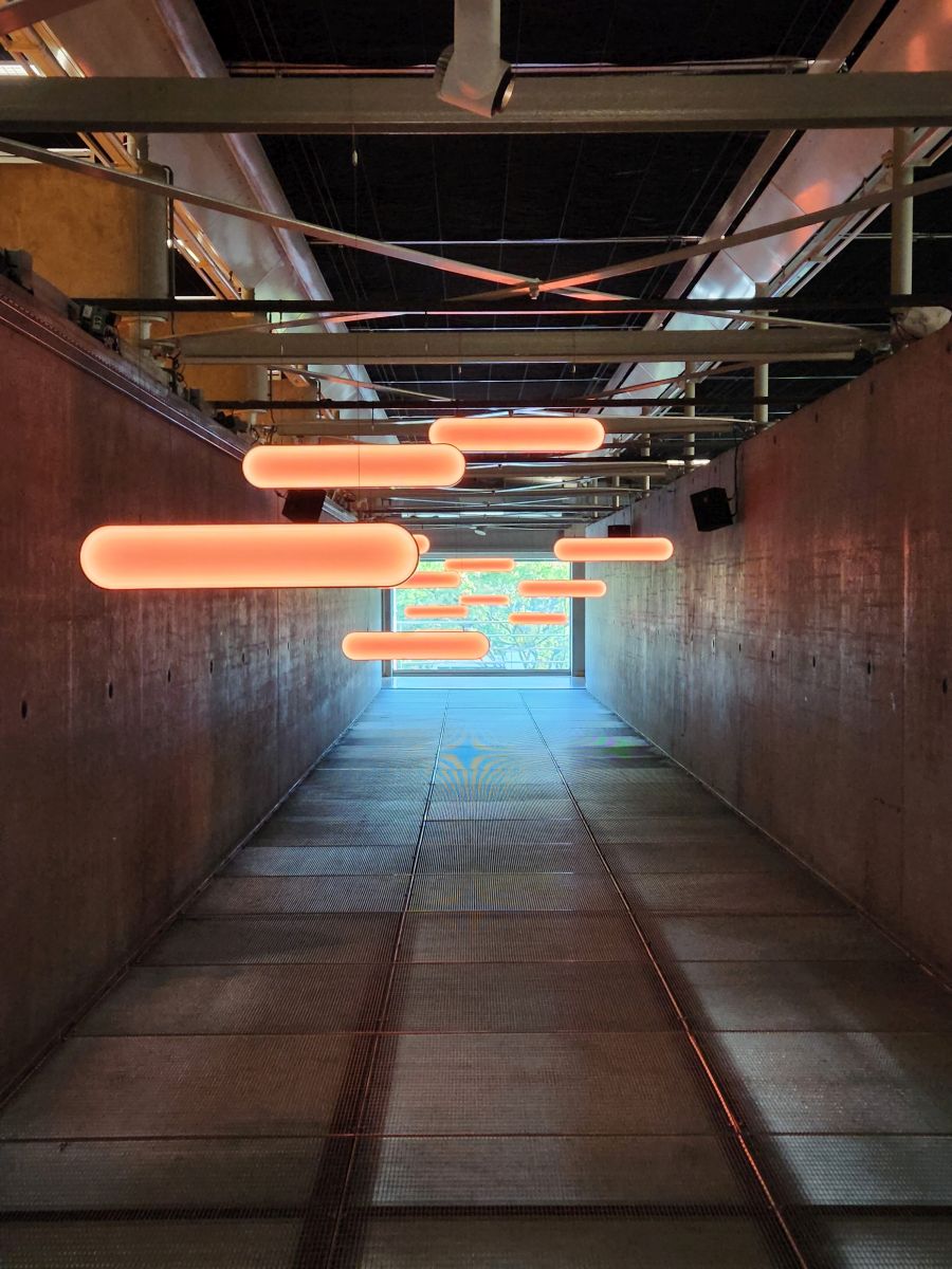 Most of the other exhibits were sort of cool and interesting like that, in their own terribly bizarre way. Lighting fixtures that changed colors in a very shipping container like room. Strange string art. Huge cube like displays with odd messages. It kept us occupied, if not confused for a good while. But the best – ok, besides the donkeys – were the bathrooms. Yes. the bathrooms. Both women’s and men’s and the coat rack room and the floors were decorated with what looked like just thrown on paint that dripped. They were totally cool and neat.