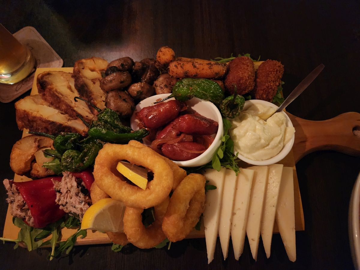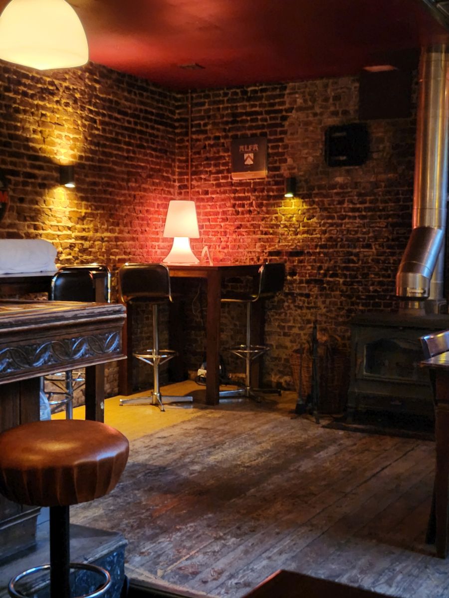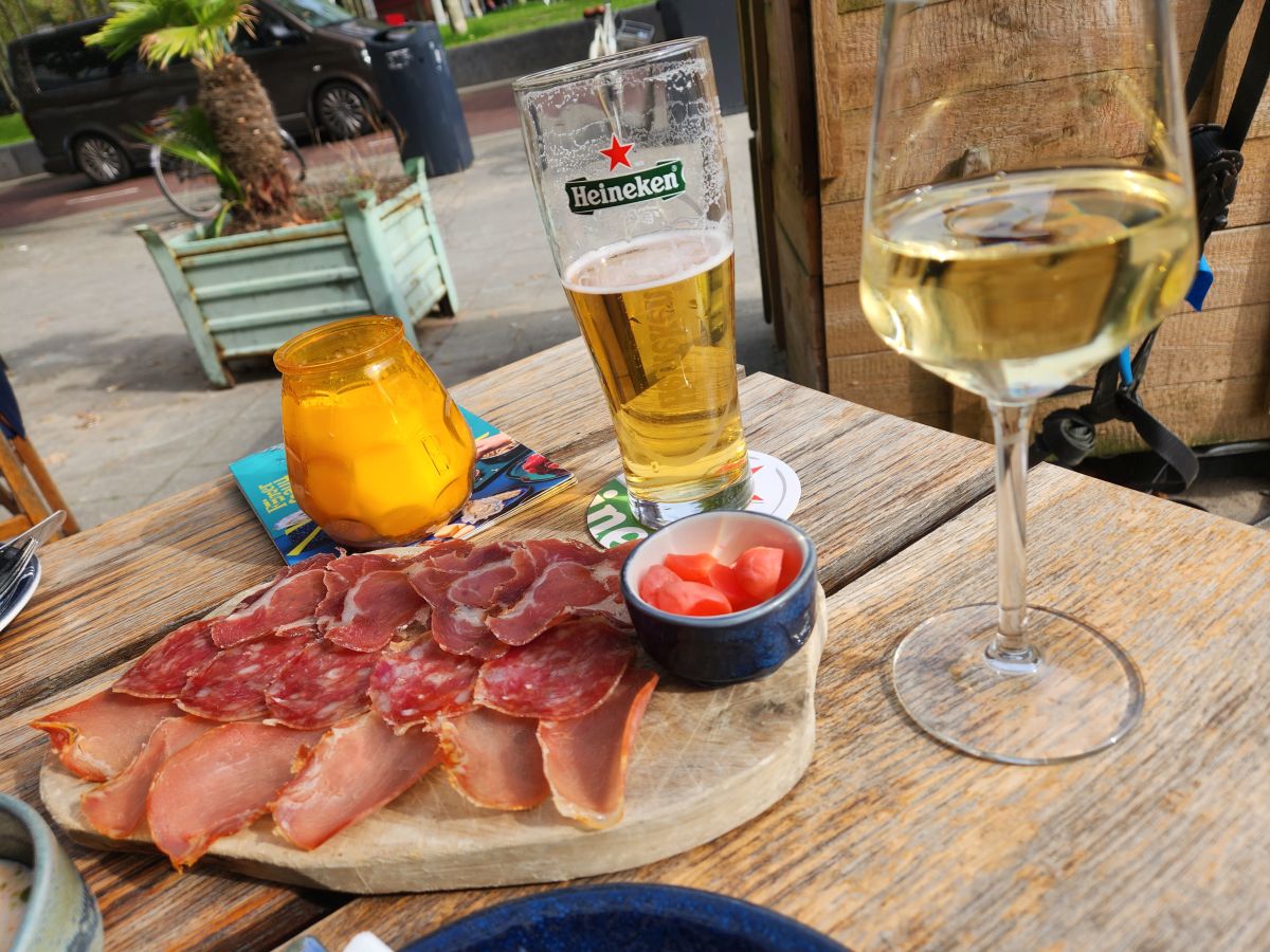 The meal, the atmosphere and the companionship do not disappoint. First of all the atmosphere in there is so warm and inviting. The bar is basically a narrow shotgun affair, all dark wood and brick and low lighting with candlestick topped tables (yes, real, live lit candlesticks) on the right and an 5 seat bar on the left. We grab a high top across from the bar – which has a couple of patrons a does a couple of tables behind us where Corine spends a good amount of time chatting. We figure this is THE neighborhood bar, and we would definitely be here often if we lived in the area too. It was that kind of place. And the food? No menu, just tell Corine you want food. She asks if we have any allergies or anything we don’t like. We say no. And that’s that. Off she goes to fix us the most amazing snack plate we have had this entire trip! Cheese and calamari and bitterballen and mushrooms and pate and peppers and oh so much more. It is delectable. And Corine the best hostess, she talks to everyone, us included and is so special.