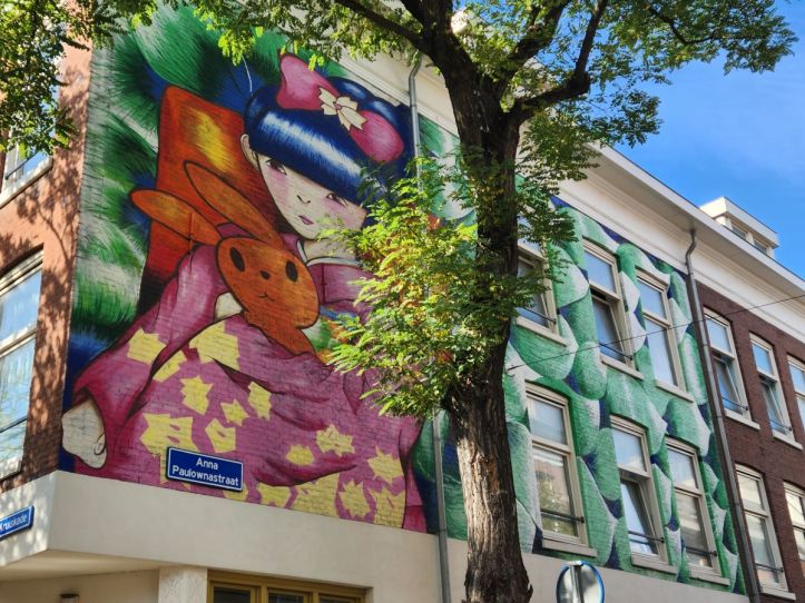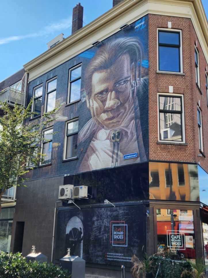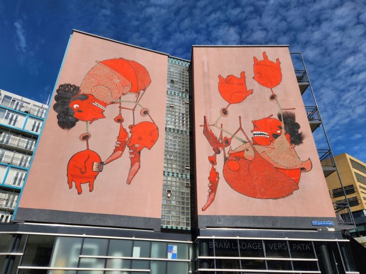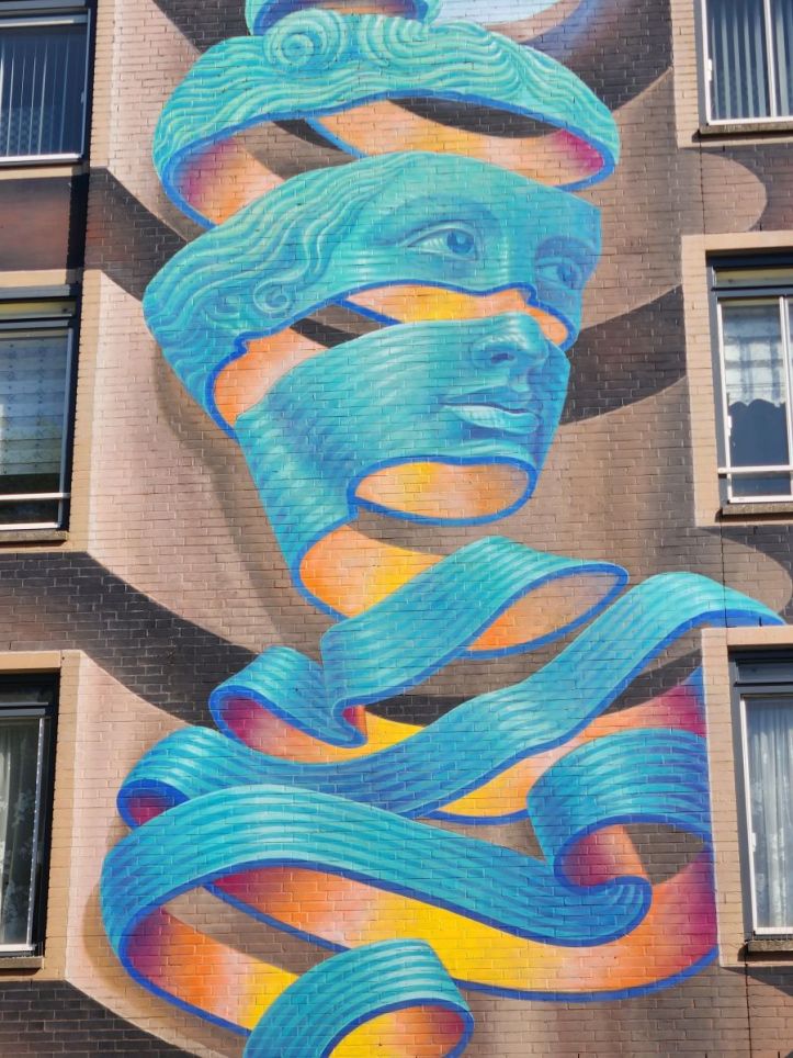 After lunch we head to the street art “museum.” The friendly and helpful guy at the Rotterdam museum didn’t know what that was when I told him about it as he was giving us suggestions on what to see. And once there we can see why – it is basically one long street with a bunch of murals and street art. Not a museum perse, just an area of town. Okie dokie. Hey, its a beautiful day, there aren’t that many – I think we found 7 – and they are all quite good and fun (especially the guy with the 4 arms, not really understanding that one) – so what the heck!