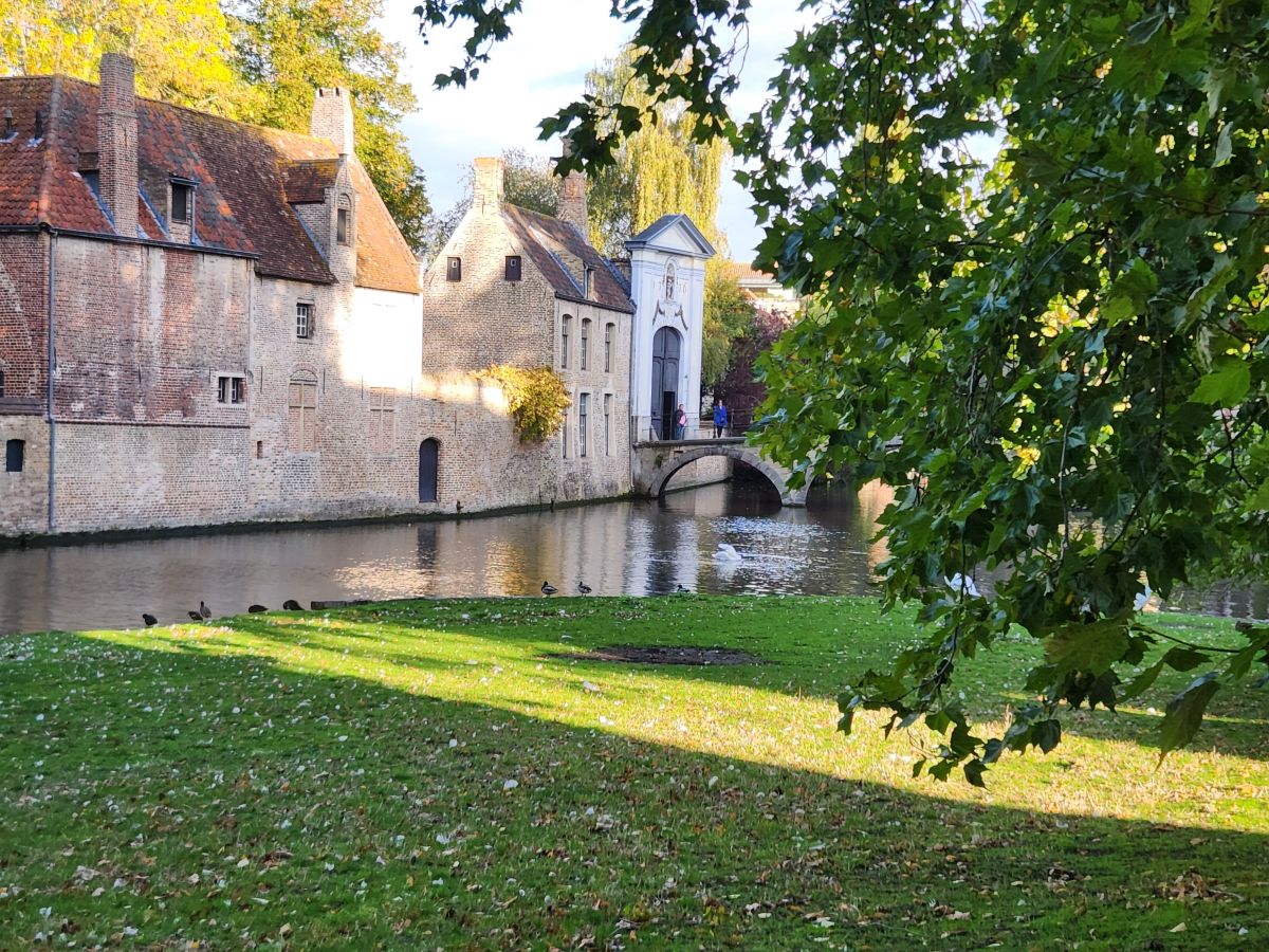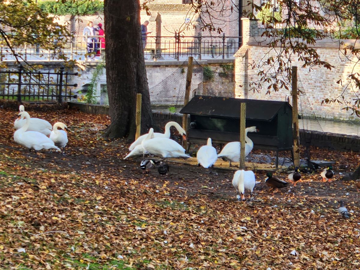 Time to head back to the bus. Which means, yes, more wandering and more pictures! How can you not in a town this adorable? We go back past the horse head fountain, in better light, but with some jerk sitting on the side of it and not moving – on purpose. Sigh. People. Then past the real horses with their drawn carriages, back past Minnewater and the swans, down a quintessential Flanders street with attached houses lining the curving street, looking like they are concave and curving as well and finally into the park proper.