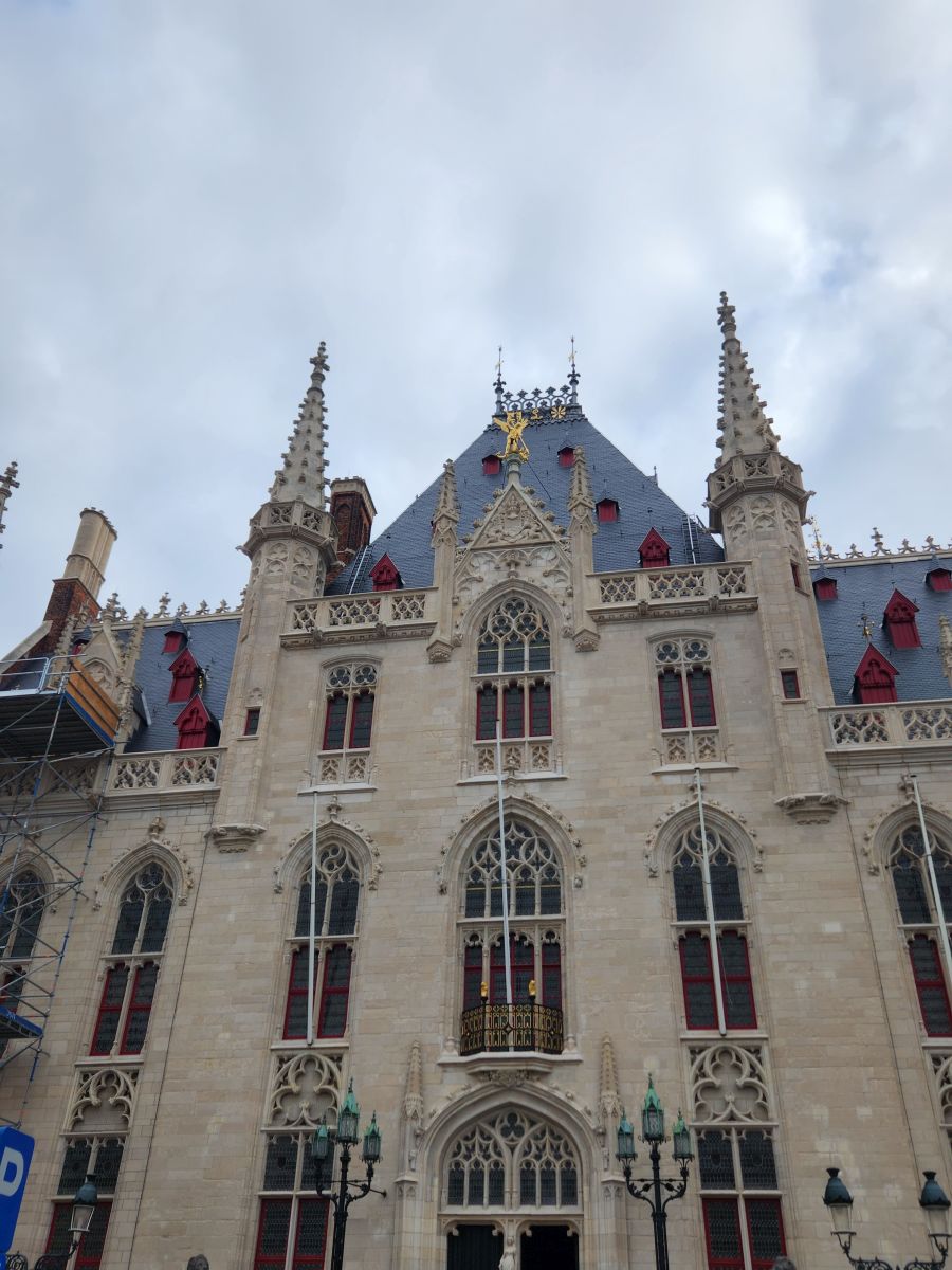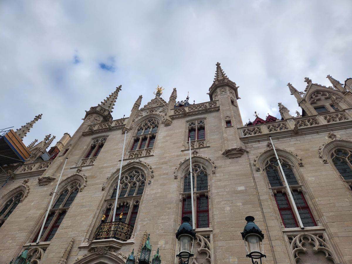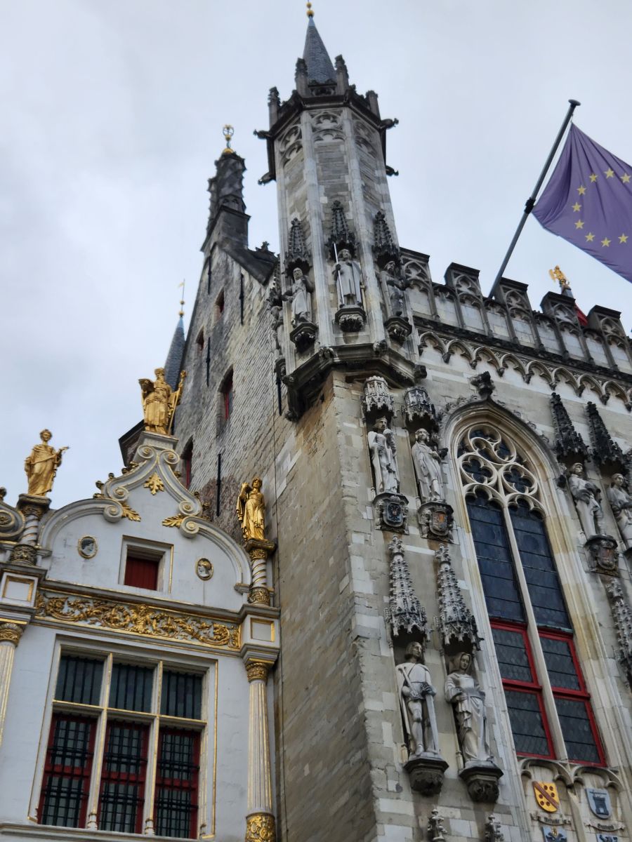 Reaching the square, we realize we’ve been past the Stadhuis a bunch of times, but never entered, honestly thinking it was a church since the Basilicia of Holy Blood is nestled in the corner of the square. And to our defense, the Stadhuis looks like a church! Regardless, we wander in, buy our combo ticket for here and Brugse Vrije and proceed upstairs to the Gothic hall, the political heart of Bruges, which, ok, reminds us of a church. I mean seriously, it is an ornate Gothic style room with lots of polished dark wood and murals lining the walls that depict the history of Bruges, from medieval times with battles and commerce depictions and crests of cities and the first charter to Bruges. Once painting even incorporates the artist who completed all the murals, along with his son. There is also this great bas relief model of Bruges in the Old Chamber, which is actually closed, but where the restrooms are located, so we get to snap a few photos after our rest stop. Pretty wild. And gorgeous. And opulent. The description card even says the chamber was “intended to exude a grandeur which befits the status of the college of alderman in a wealthy, flourishing city.” And that it does. In spades. Oh, and the current city council still meets in here monthly. Wow.