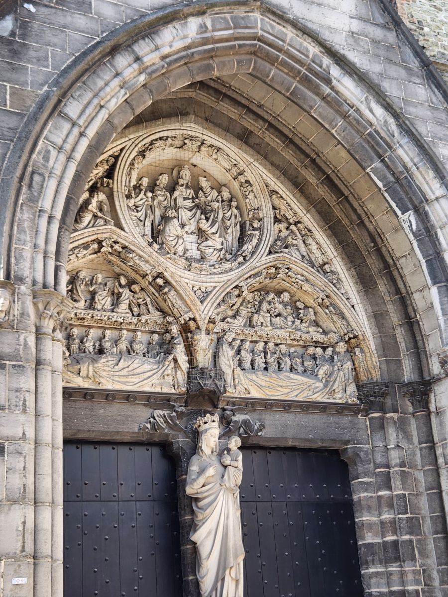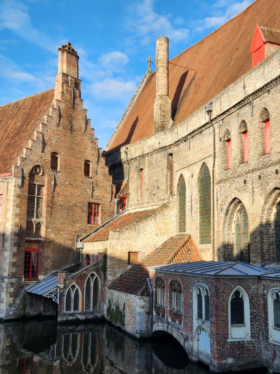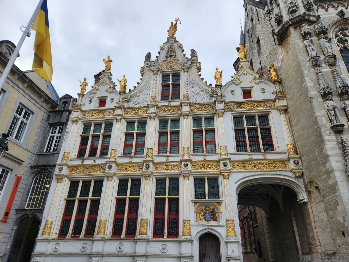 Reaching the square, we realize we’ve been past the Stadhuis a bunch of times, but never entered, honestly thinking it was a church since the Basilicia of Holy Blood is nestled in the corner of the square. And to our defense, the Stadhuis looks like a church! Regardless, we wander in, buy our combo ticket for here and Brugse Vrije and proceed upstairs to the Gothic hall, the political heart of Bruges, which, ok, reminds us of a church. I mean seriously, it is an ornate Gothic style room with lots of polished dark wood and murals lining the walls that depict the history of Bruges, from medieval times with battles and commerce depictions and crests of cities and the first charter to Bruges. Once painting even incorporates the artist who completed all the murals, along with his son. There is also this great bas relief model of Bruges in the Old Chamber, which is actually closed, but where the restrooms are located, so we get to snap a few photos after our rest stop. Pretty wild. And gorgeous. And opulent. The description card even says the chamber was “intended to exude a grandeur which befits the status of the college of alderman in a wealthy, flourishing city.” And that it does. In spades. Oh, and the current city council still meets in here monthly. Wow.