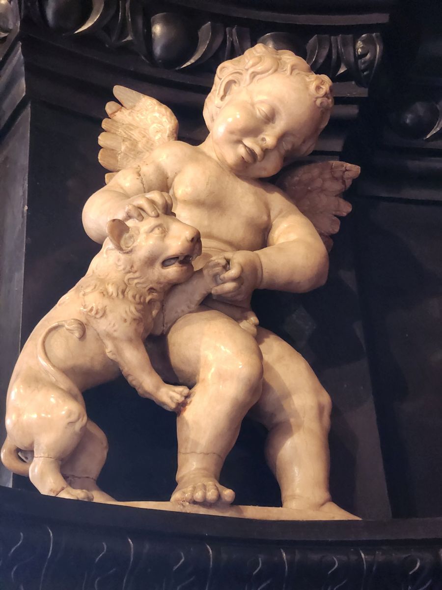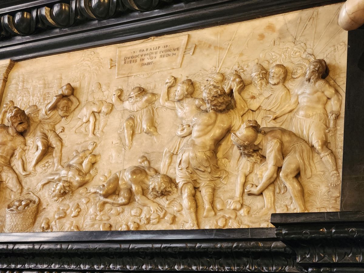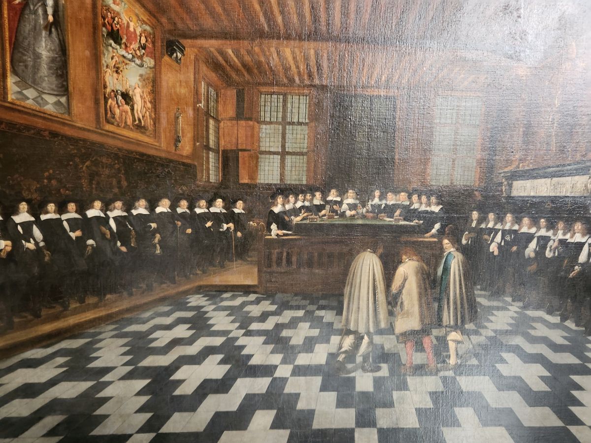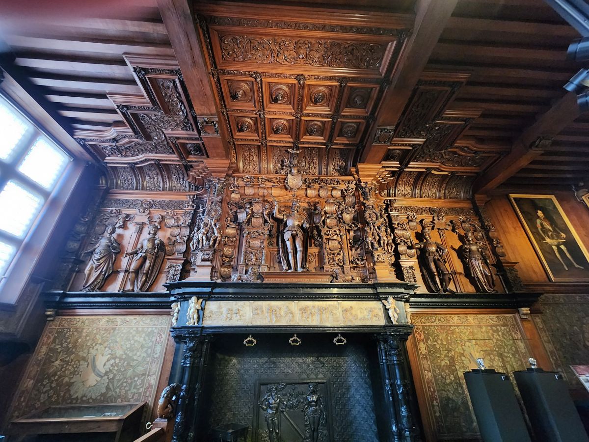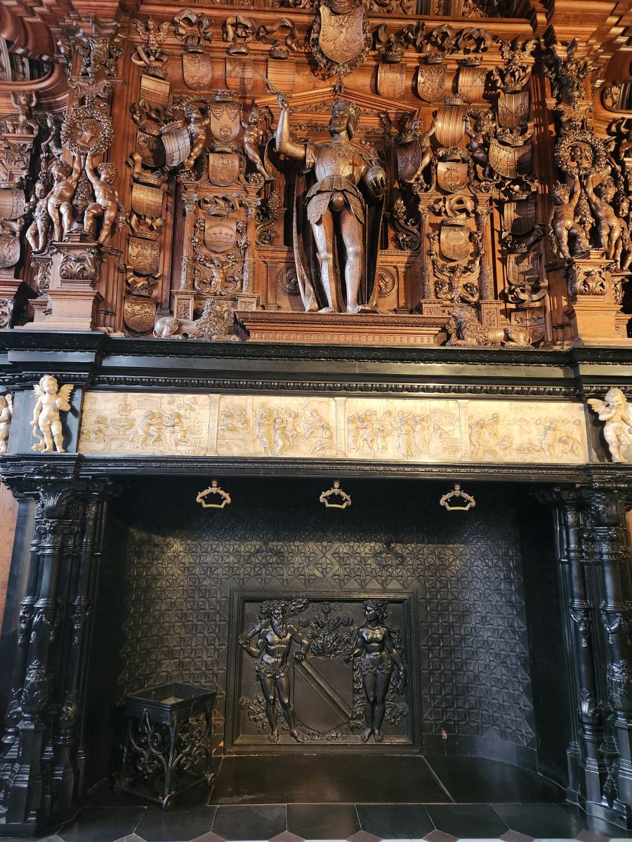Inside the courtroom, we find a very dark, very wooden room with a massive fireplace on the right. The mantelpiece of which was built in 1528 as a tribute to Emperor Charles V for freeing Flanders from French rule. There are putti (what I call Cherubs) on on each corner, oak, marble and alabaster features with a huge sculpture above. There is also a painting on display depicting a 17th C court session, where you can see all the features of the room we are standing in – allowing us to feel like we were transported back in time.