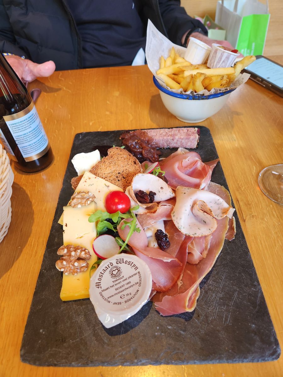 More wandering ensues as we essentially circle back around behind the clock tower and the Stadhuis heading for De Halve Maan brewery for lunch. Being one of the original breweries is, of course, a draw for us (we’ve been here before on tours), but two of our driving reasons are 1) it is on the way back to the bus, and 2) before leaving home, we had this huge discussion about Bruges and Belgium with Adam at Haw Creek Grocers and he remembered a joker symbol at this brewery he liked – De Halve Maan. So of course, we had to go and take pictures and send them to him! Not to mention, the restaurant is pretty great too. Grabbing a table for two, we split a huge charcuterie plate, along with our beer and wine and enjoy people watching as the place fills up. We were really lucky to arriven when we did – by the time we leave, there isn’t an empty table to be had.