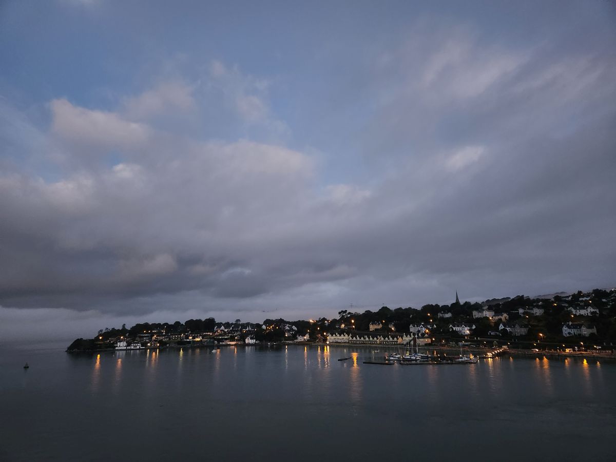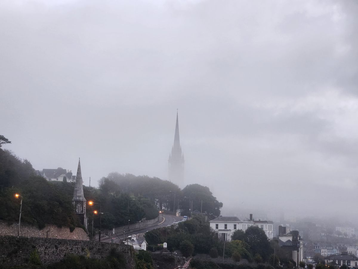 There is an eerie dawn out there today – beautiful – but eerie. The moon is just setting as we sail into Cobh, and a fog is rolling in, casting everything in this blanket of grey. Makes for good mysterious pictures, but we are hoping for it to burn off so we have some sunshine to take away the chill. It remains puffy coat weather, which we are hoping to shed soon for at least lighter jackets.