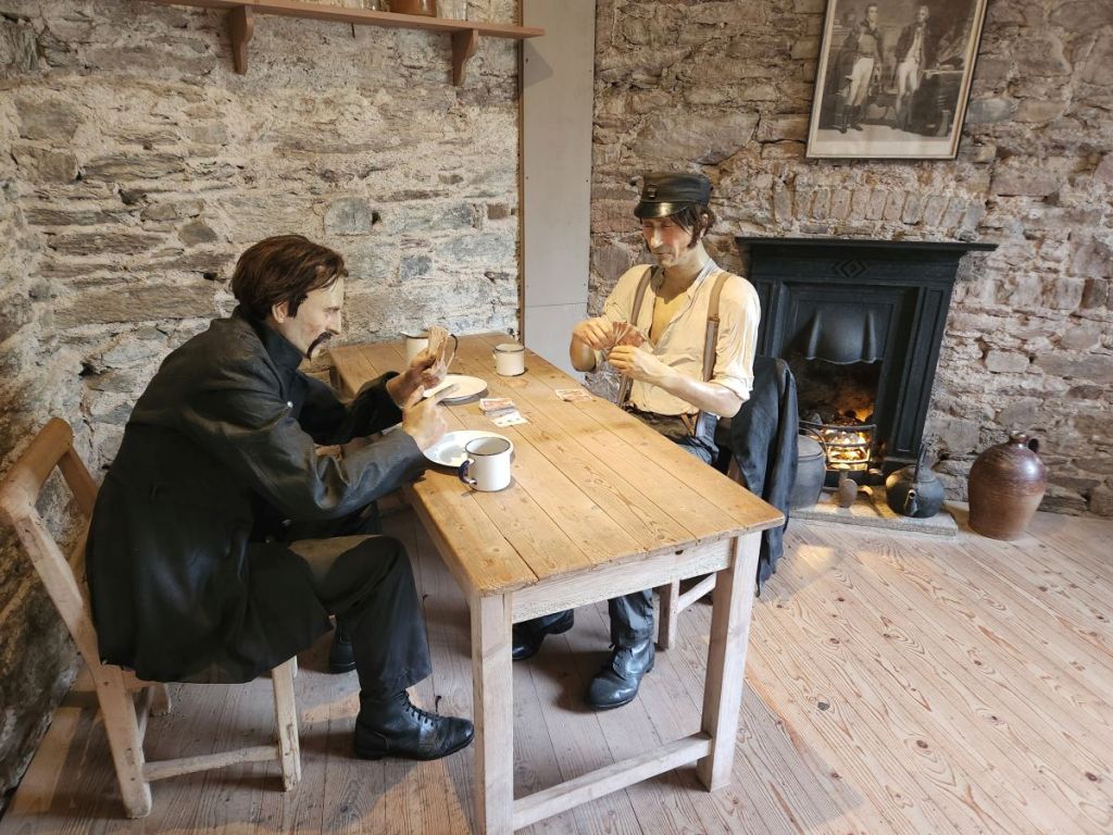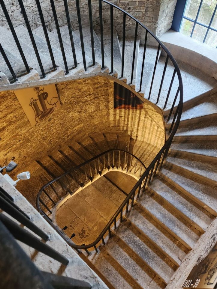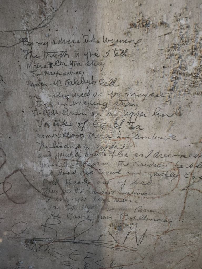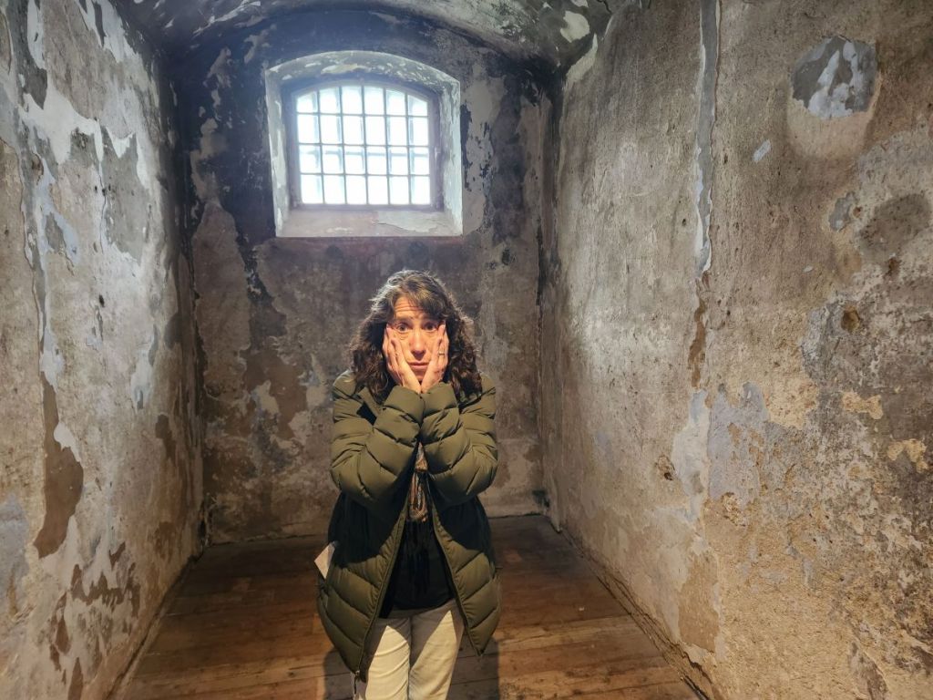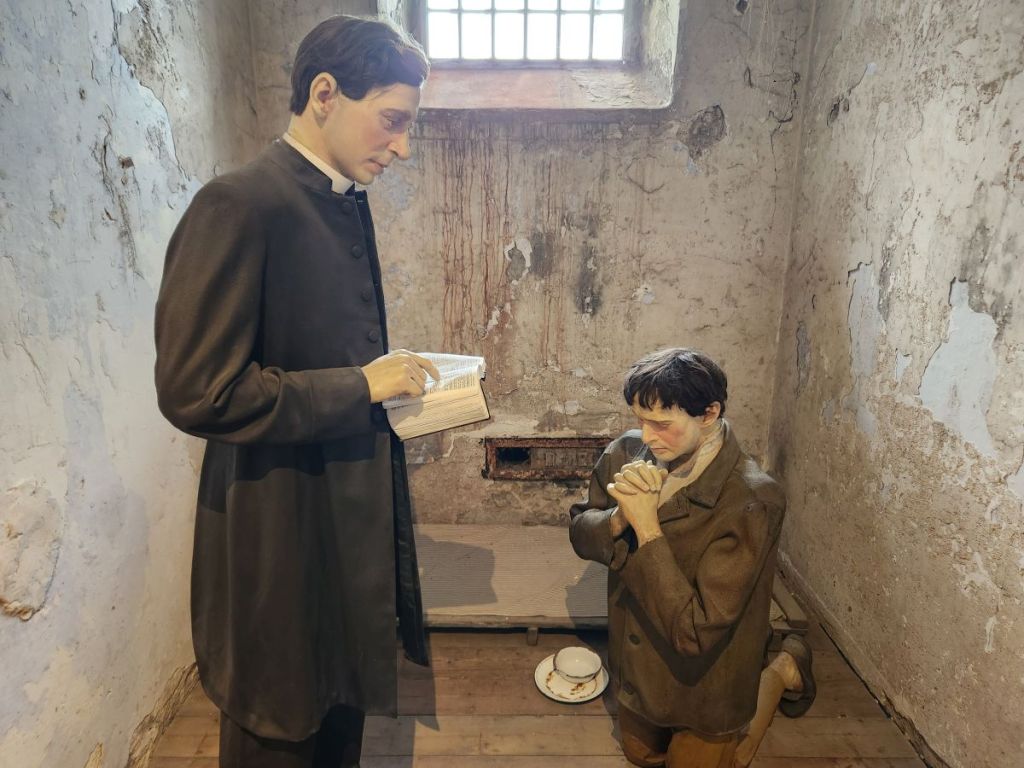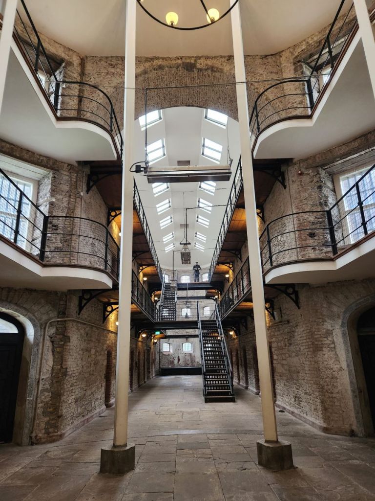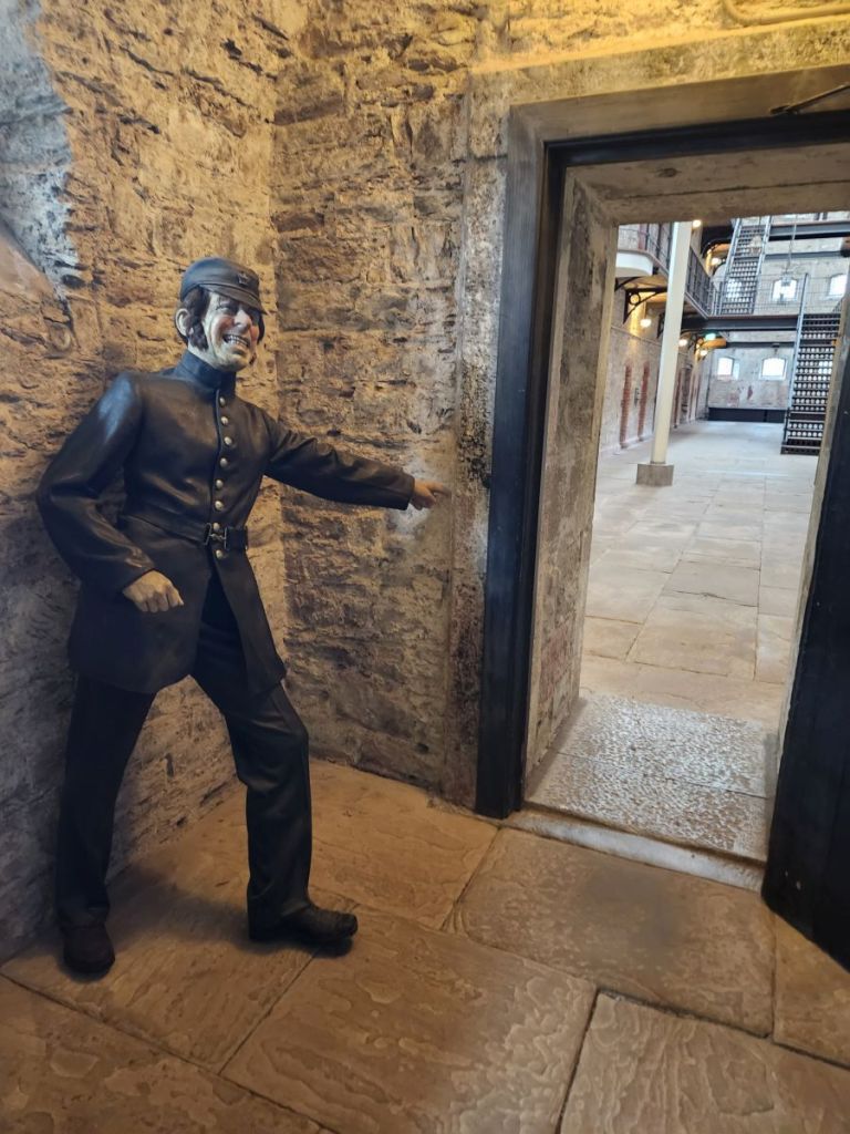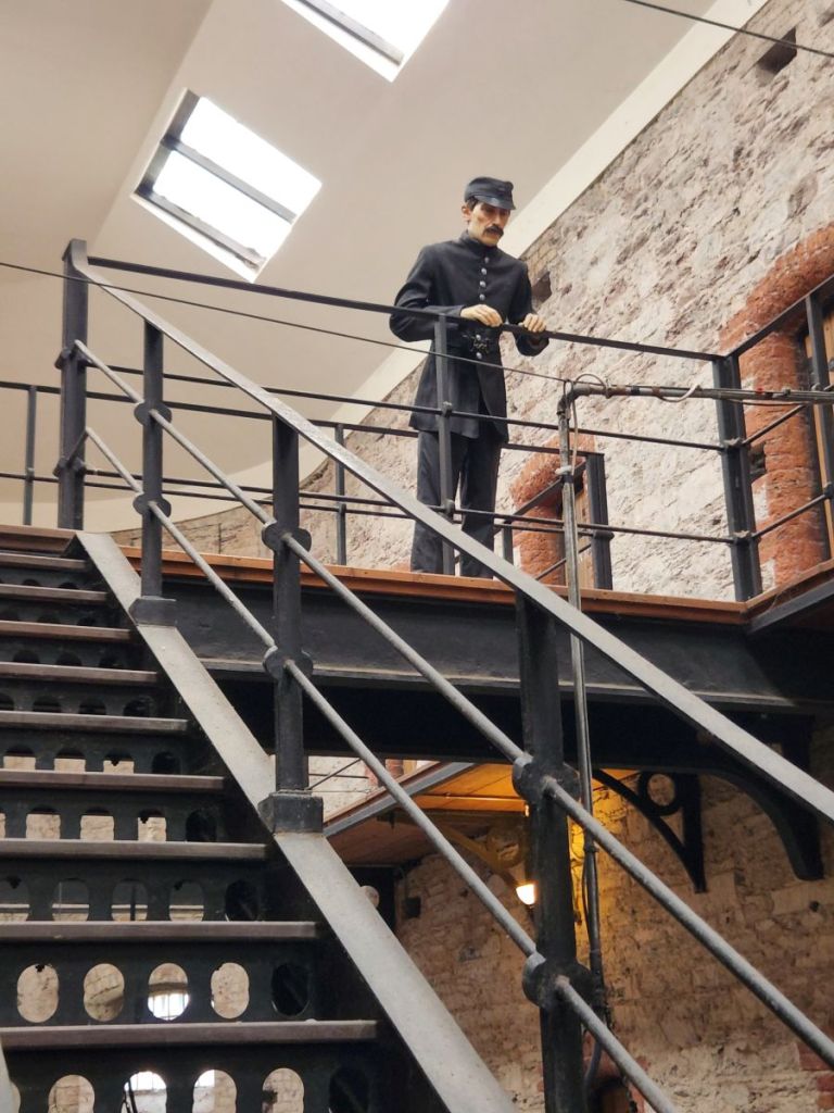 There is a cell we can “try out” – which of course we do! And original graffiti that has been preserved from prisoners during the Irish Civil War. As we climb to the 2nd floor, we can look out the windows and see the exercise yard where prisoners walked around the designated circle in single file so they couldn’t talk. There is a room explaining all the different punishments meted out; oakum picking (a short of endless unraveling of oakum ropes that left your hands bloody and raw), the treadwheel (literally a human-size hamster wheel only with heavy weights to make it harder), of course solitary confinement and whipping, but also clothes confiscation (if a prisoner tried to escape, their clothes were taken from them to deter further attempts)! Plus there is a great model of the entire prison providing a perspective on how large the entire complex is.