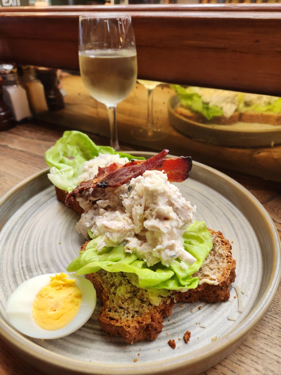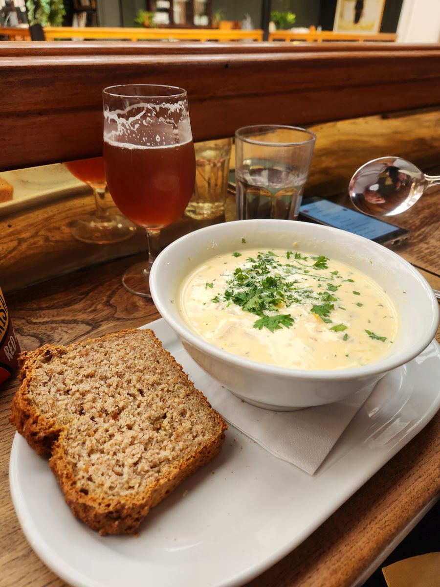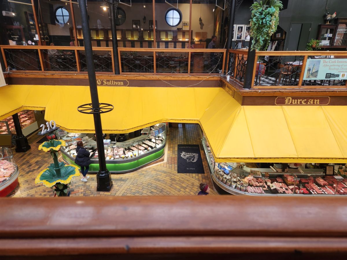 Exiting the museum and the park, we walk the leafy streets along the river until we reach the CBD where tree cover morphs into tall city buildings lining the roads and traffic – both pedestrian and vehicular – begins to pick up. After a few moments of directional confusion, we find our way into the English Market, a huge fresh food with everything you can imagine from produce to meat to seafood. We wander around a bit, looking at all the incredible food we couldn’t buy, and at surprisingly really good prices too! We think about grabbing a sandwich or meat from a counter, then finding someplace to eat, but stumble upon the Farmgate Cafe on the balcony overlooking the market. Lucking into 2 open seats at the counter running all around the market, we tuck into an excellent open faced chicken salad sandwich and seafood chowder. Great food and people watching opportunities all in one. Our kind of lunch place.