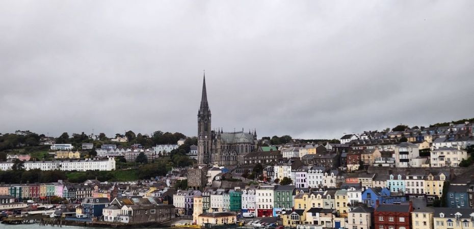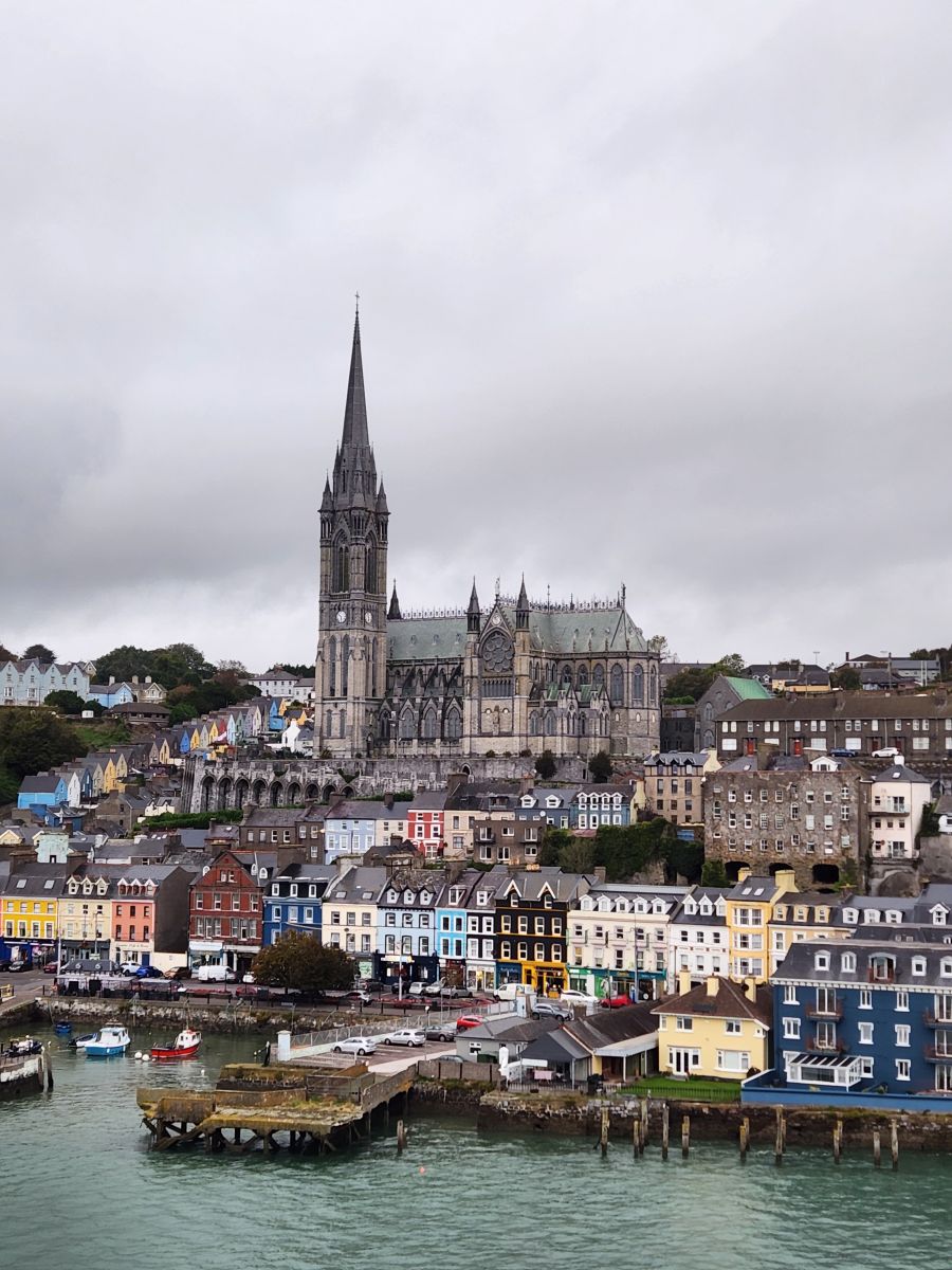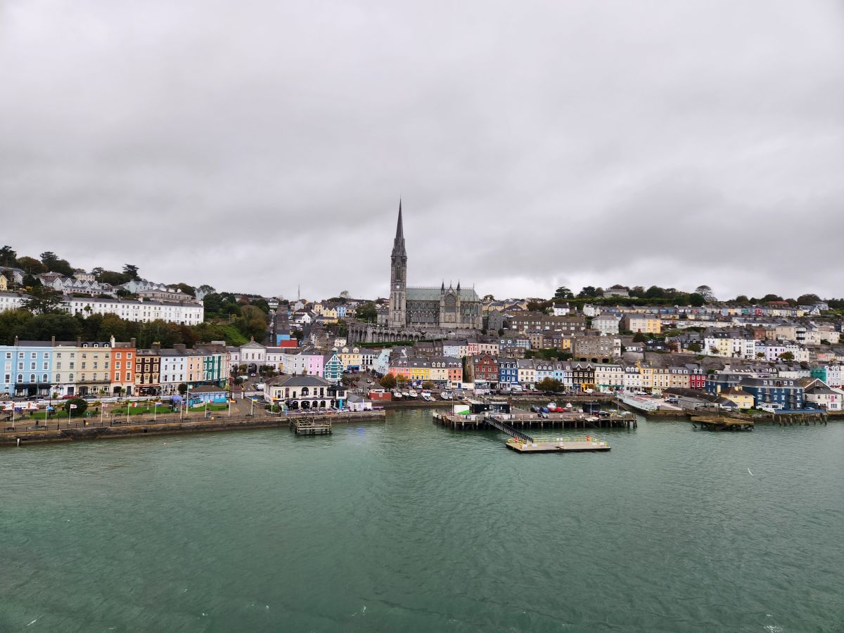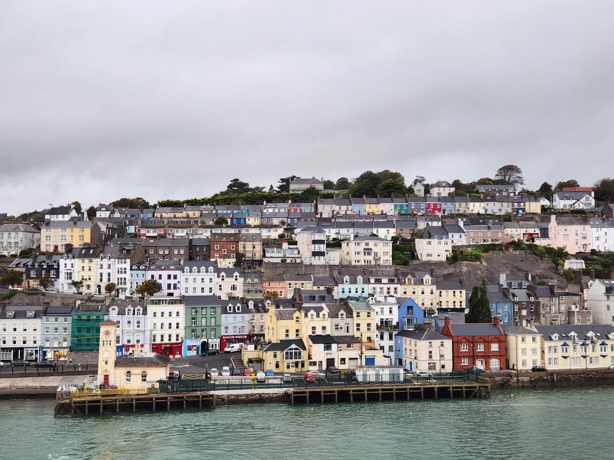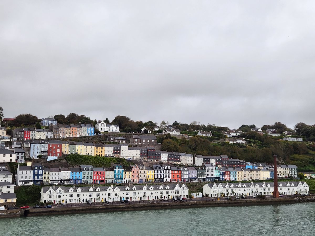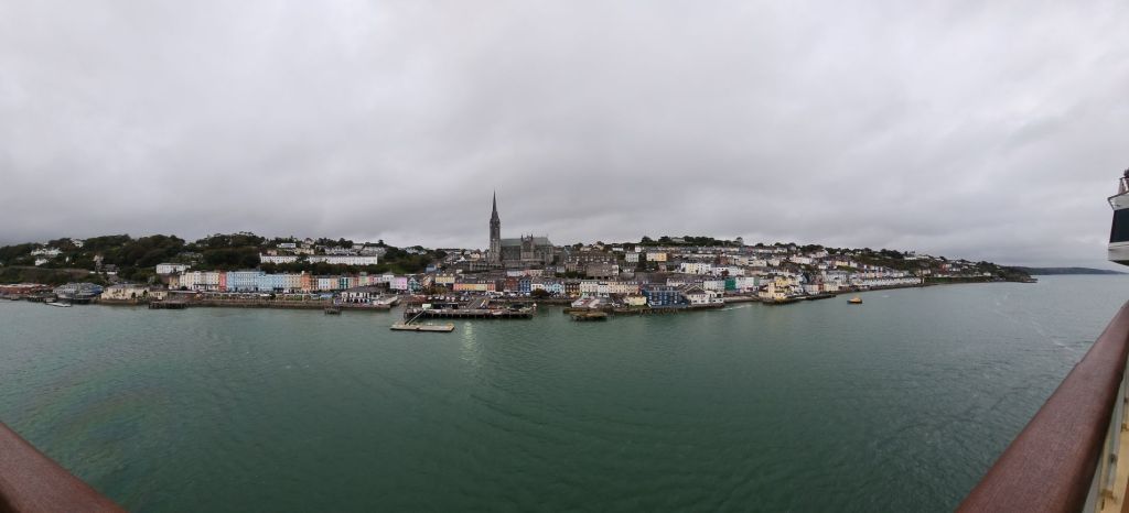 Fortunately, we are now on the same side of the river as the train station, which is an easy walk downhill. Trains run so frequently, there is one waiting when we arrive at the station. Perfect timing. We’re back to Cobh in no time. As we’ve been here a few times, there is no need to explore the town, so we just return to the ship for our evening rituals – along with taking some great cityscapes as we sail out of the harbor.